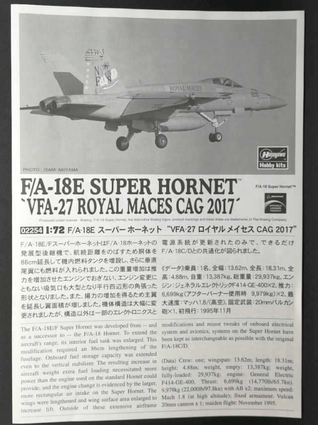 Обычная для Hasegawa, картон плотный, картинка - фото борта VFA-27 Royal Maces CAG 2017.