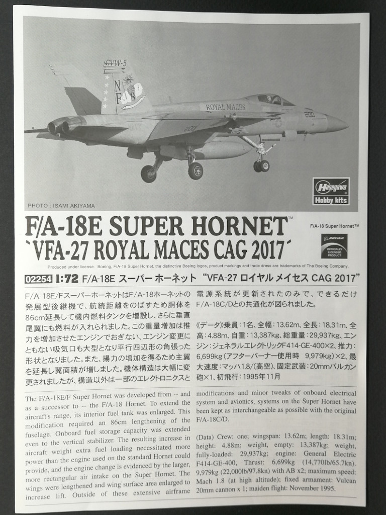 Стандартная, содержит схему сборки и схему окраски. Схема окраски дана только одна - USN, USS Ronald Reagan, VFA-27 Royal Maces CAG 2017. Фото данного борта вы можете найти вот тут http://www.miyf27.com/picsvfa2712.php