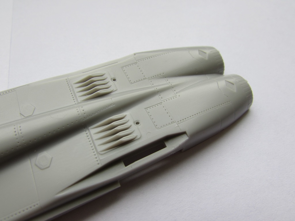 Ниши основных стоек шасси сделаны плоскими, а должны быть скругленные, по форме воздуховода. Ниша носовой стойки шасси выполнена глубокой, это плюс. Решетки вентиляции пушки углубленные, что не верно и требует исправления. Блоки тепловых ловушек выполнены крайне условно.