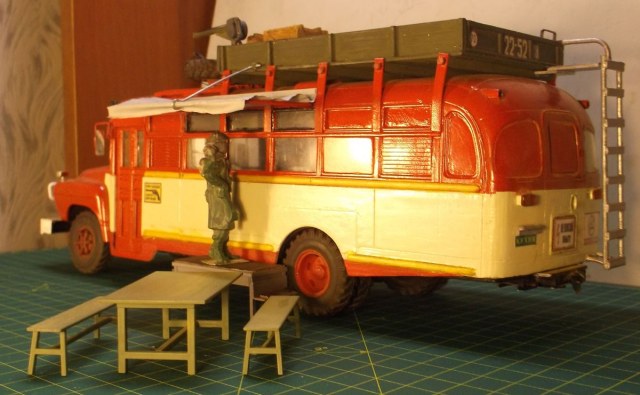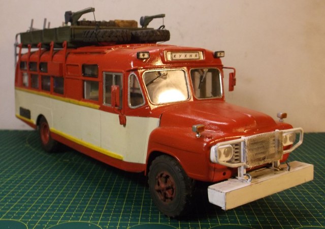 Помывшись и взбодрившись в баньке народ, естественно, захочет похавать! А тут и кухня на подходе! Так как экспедиция пробиралась всё дальше на восток, то стала попадаться косорылая техника (за Уралом её до фига). Вот и нашим хлопцам попался этот автобус. Моторчик (рядная дизельная шестёрка) был очень и очень бодрым (ну кто же не знает японские дизеля). Остальное дело техники, гаечных ключей и русского языка! Накидав, что смогли найти в ближайших посёлках на тему кухни, получили два электрических котла на первое и второе блюда, электроплиту на четыре конфорки с духовкой, две микроволновки и небольшой титан. Также установили небольшой промышленный холодильник, шкаф для посуды и мойку для неё же. С левого борта сделали окно выдачи пайки, сверху соорудили навес от дождика и подставку, чтобы было удобно отовариваться. Родная резина была ни к чёрту. Поэтому натянули шины от 131го ЗиЛа (ICM). Передок полностью поставили мазовский (родные шкворня приржавели к балке). Опробовали-испытали и в путь!