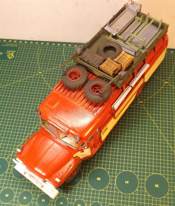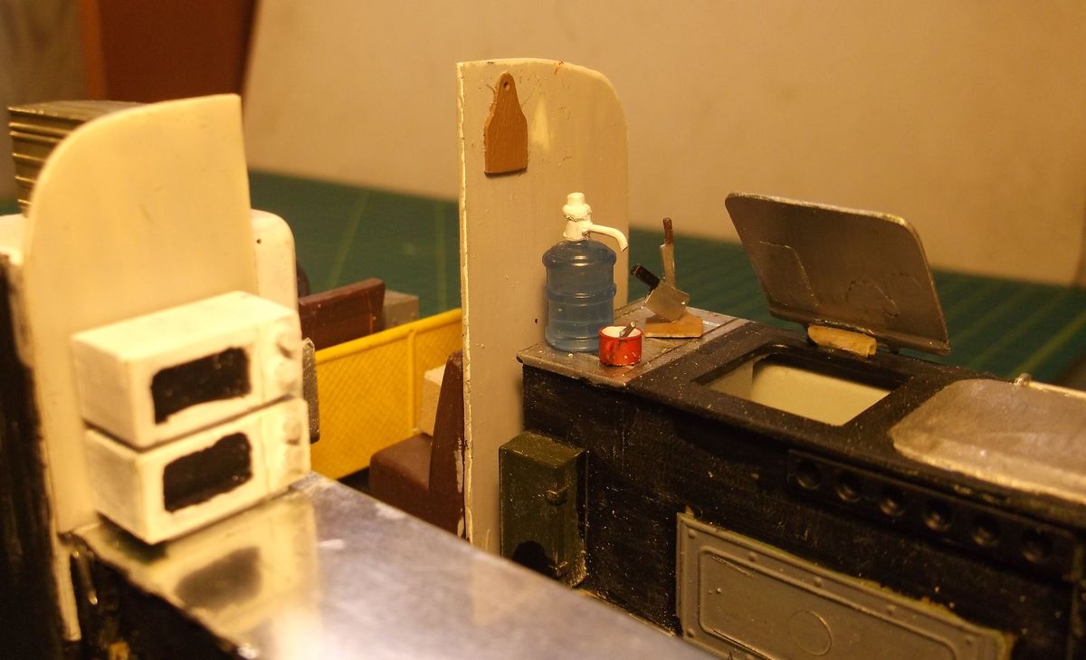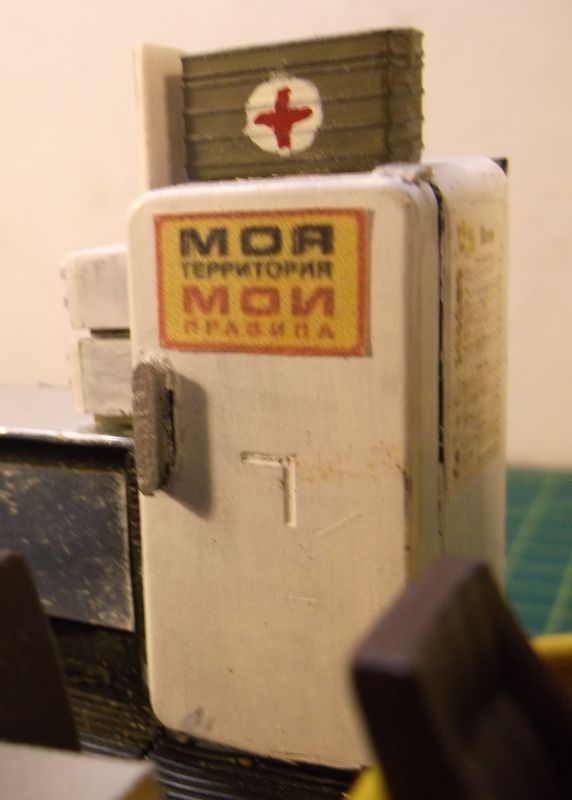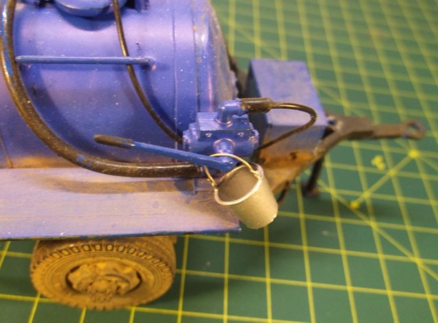 В комплекте с кухней идёт бочка с питьевой водой. Её соорудили из какой-то сельхоз-бочки. Промыли-пропарили, поставили на тележку не понятно от чего (прицепная 20ти мм счетверённая зенитка от Тамии), присобачили ручной насос для закачки воды в бак посудомойки. Вся электрическая машинерия запитывается от дизель-генератора. Пачкать не стал, только припылил колёса и крышу. Не умею, да и не хочу эту няшу марать. Да и вам самим будет стрёмно заходить в грязную кухню. Вроде всё. Если что упустил, потом допишу. Кидайте тапки и табуретки, но только не в автобус! :-))