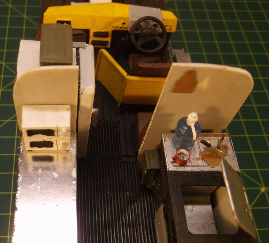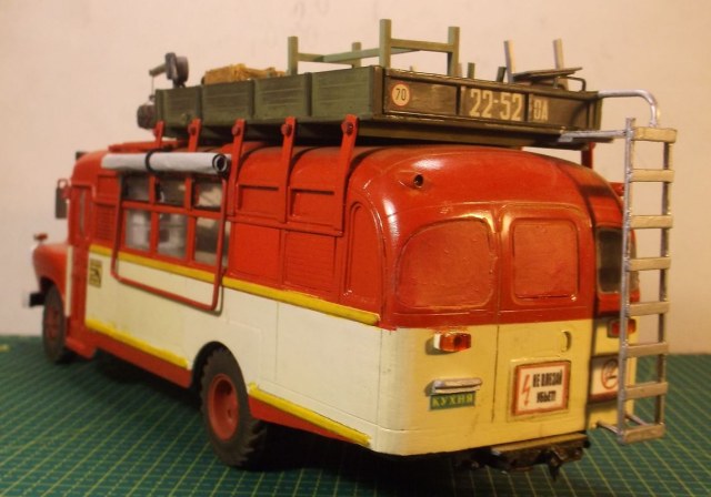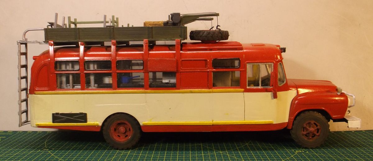 Были порезаны два автобуса с целью удлинения оного на одно окно. После этого он приобрёл более нормальный вид. Изначально автобус был игрушкой с потугами на модель. Ставка делалась на внешний вид. Поэтому ходовая изображена довольно условно. Я тоже не стал заморачиваться на эту тему. Главное - салон! Изобразил, как мог своими кривыми треморными ручками и подслеповатыми глазками. Машинка в 32м масштабе. Если рядом поставить КрАЗа, то это заметно. Но в одиночку он смотрится более-менее. Хотел сделать съёмной крышу. Но обзорность всё-равно была бы неполной. Поэтому я сделал весь кузов съёмным.