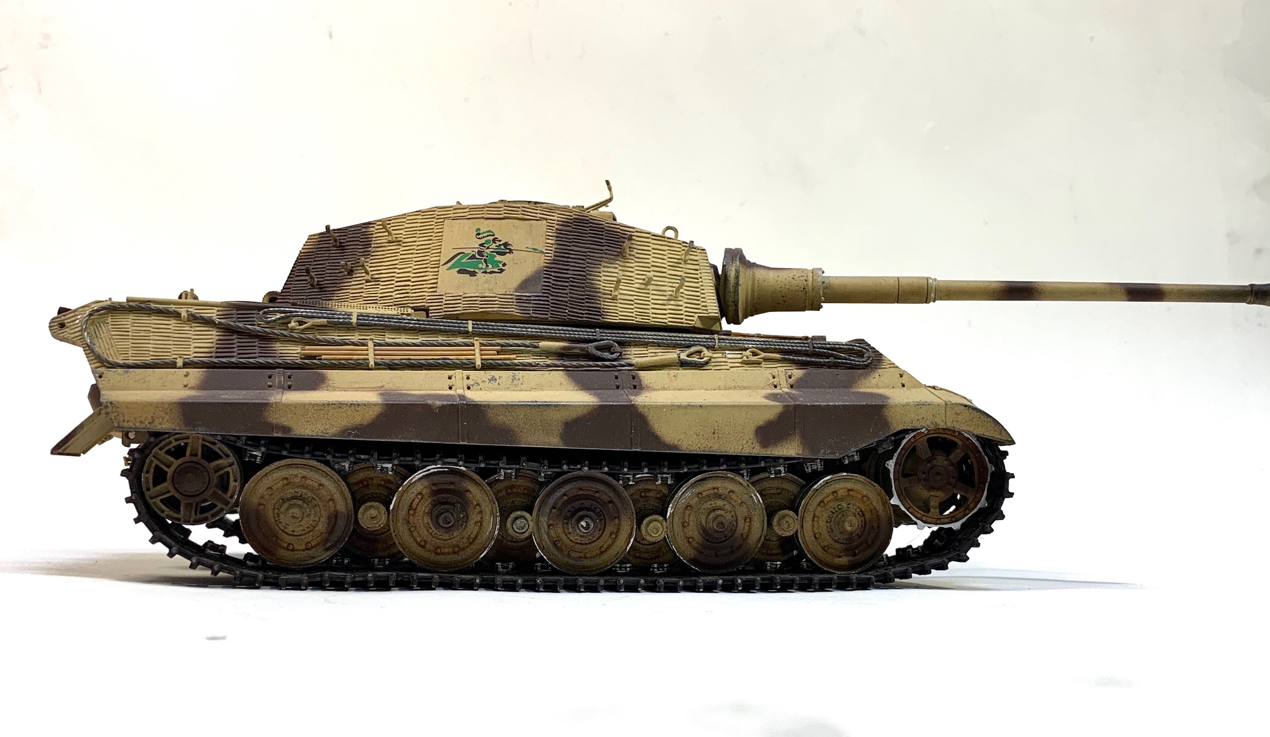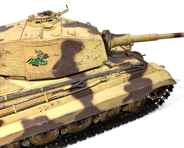 Также заменил штатные пластиковые траки на MasterClub (впервые имел дело с металлическими траками), изначально я их зачернил жижей от Wilder, и опять таки косяк: несмотря на то, что я всё хорошо обезжирил, после чернения гусли покрылись белым налётом. Было принято решение обработать всё смывкой и засыпать пигментами, результат на фото.