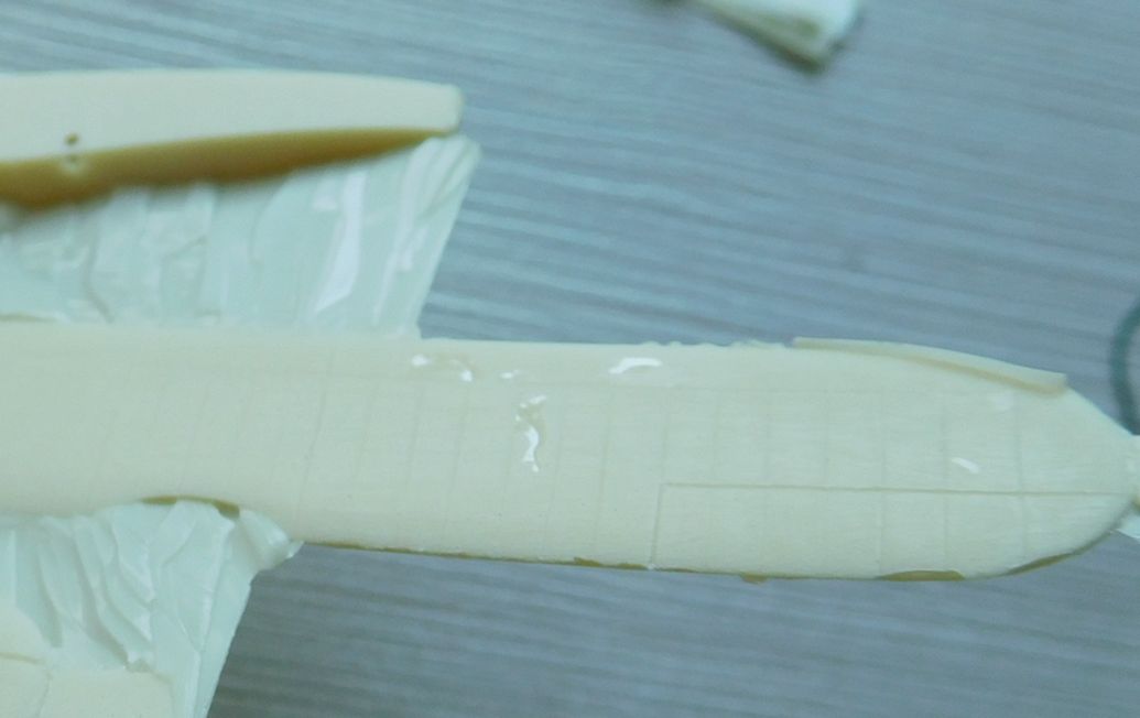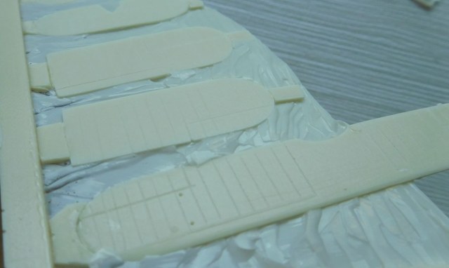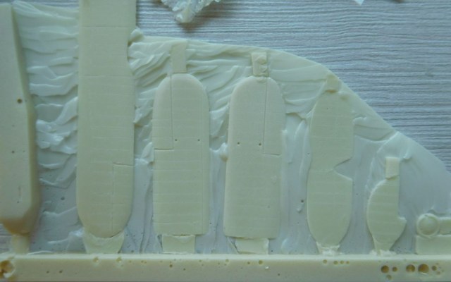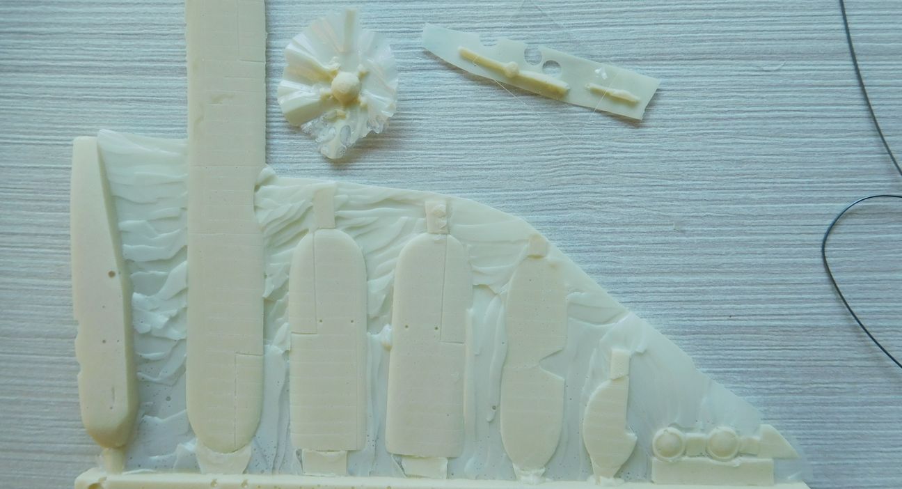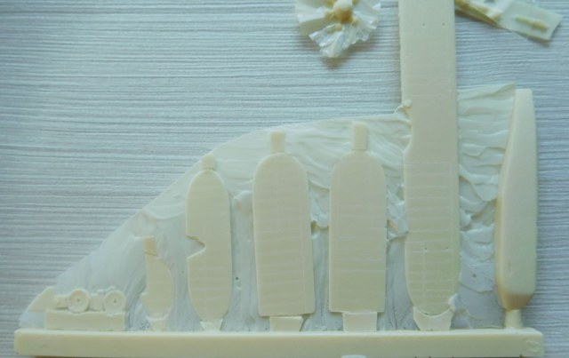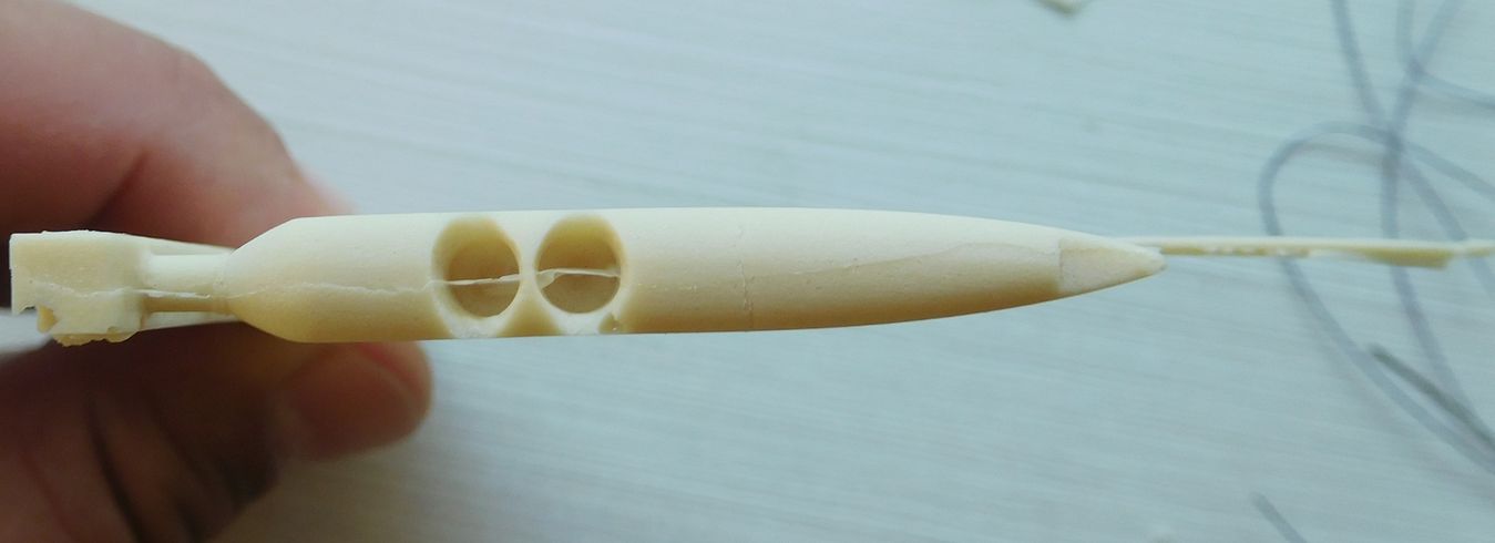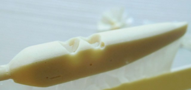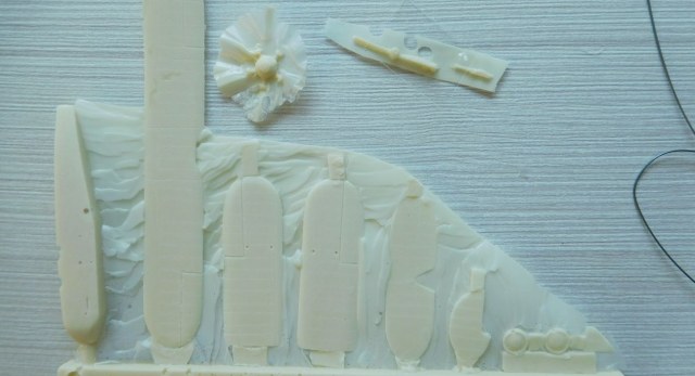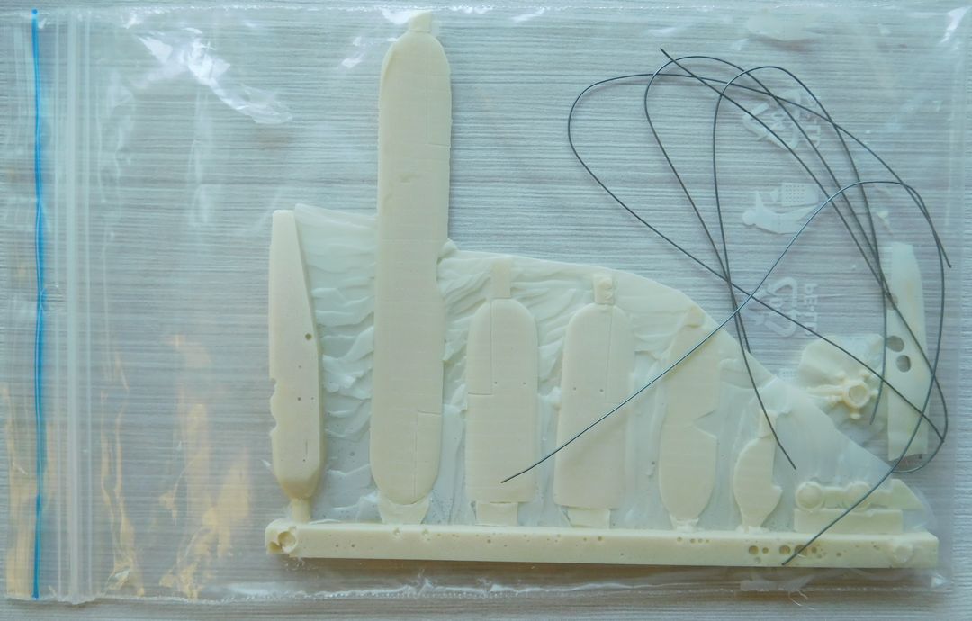Дабы не растекаться мысью по древу, на чём же мне акцентировать ваше внимание ? На следах разъёма силиконовой формы ? Или на воздушных пузырьках и кавернах в застывшей смоле заготовок ? Возможно, на расчалках из проволоки толщиной 0,3 мм более подходящей для изготовления поручней на бронетехнике 72-го масштаба ? А может на отпечатанной неведомым мне способом (аж в самой Японии (!)) декали ? Не знаю. Смотрите и судите сами.