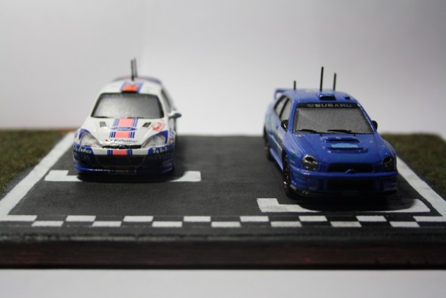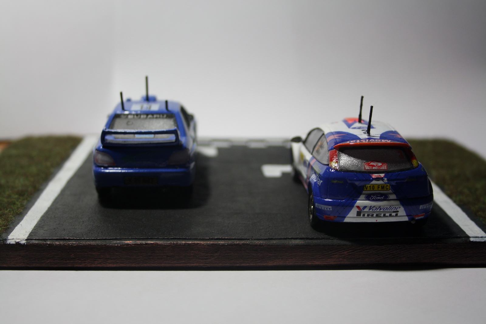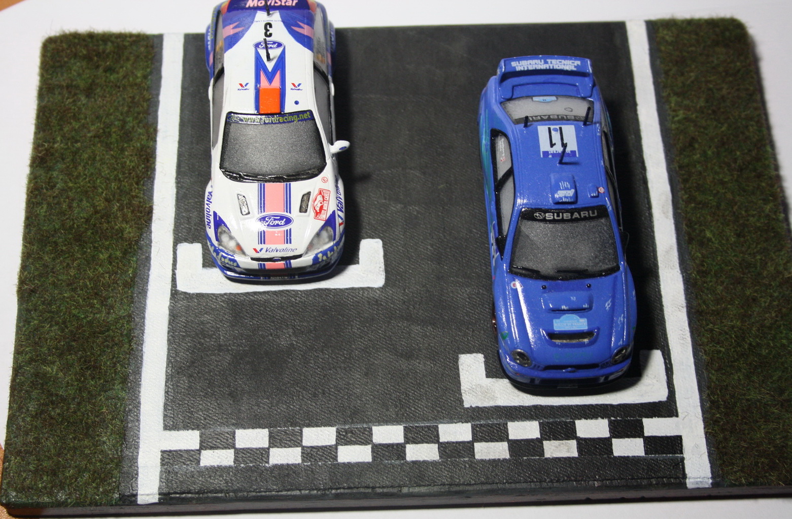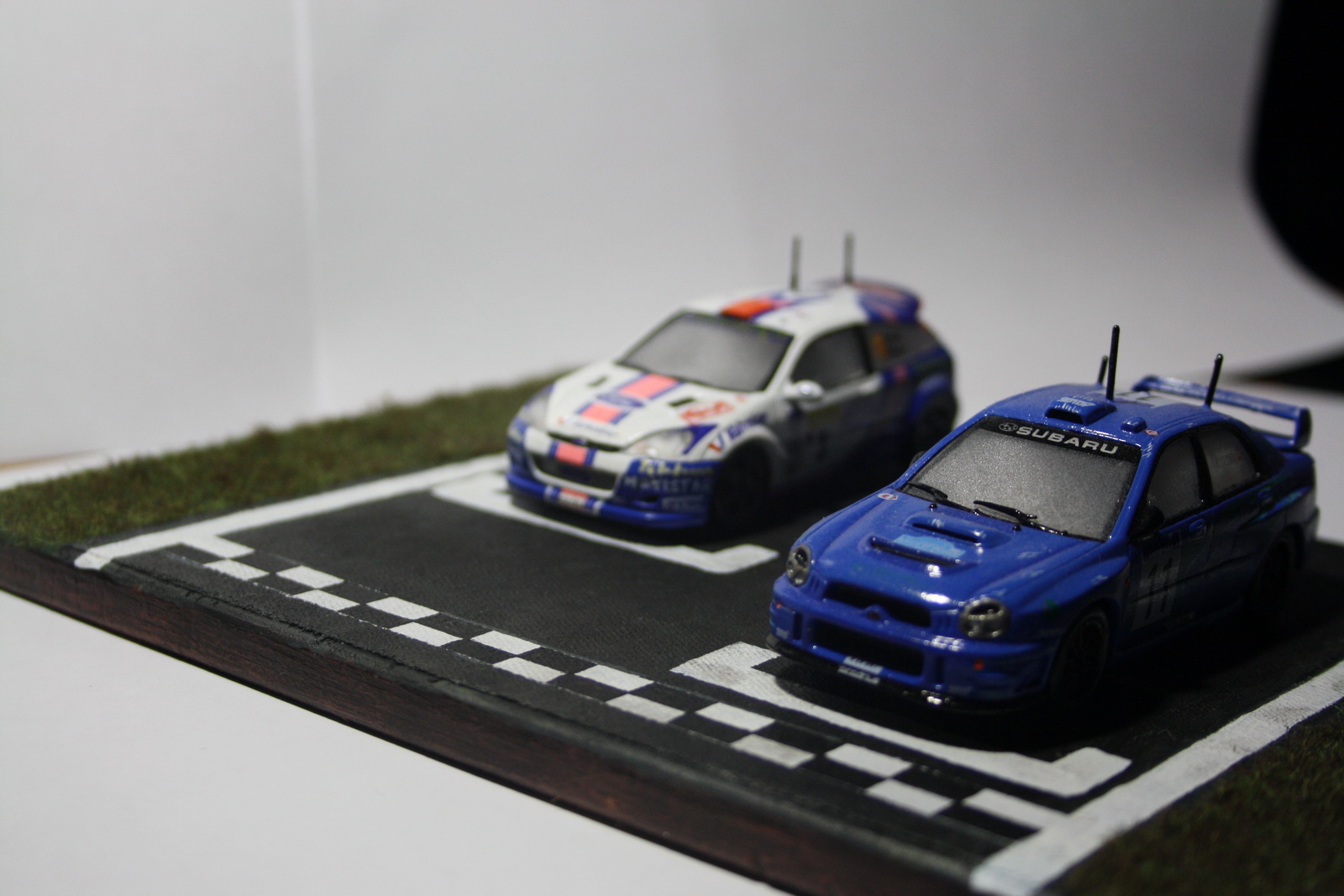 Модели стандартные из коробки. Качество моделей мне не понравилось. Приходилось подпиливать. Декали на Субару вообще ужасные. Собственно бледный желтый цвет и его не видно в принципе. Красил Звездой и Тамией. Т.к. модели "На старте", то решил использовать глянцевый лак, что наверное оказалось ошибочным вариантом. Асфальт - наждачка (после чтения форумов). Подставка - фанера 10 (остатки от ремонта дома).