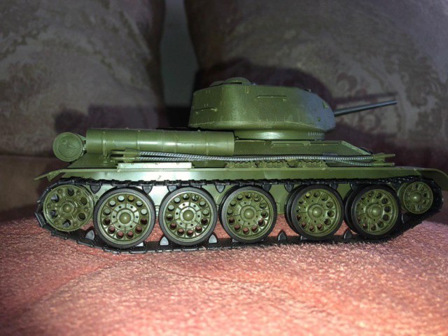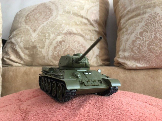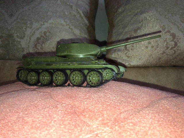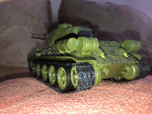 Модель танка Т-34-85 от производителя "Звезда" в масштабе 1:35. Абсолютно искоробочная сборка. Модель собиралась "для души", поэтому не преследовалась цель собрать абсолютно аутентичную модель, лишь подкрашены ободы катков, выхлопные трубы и пружины подвески, красил акриловой краской от звезды.