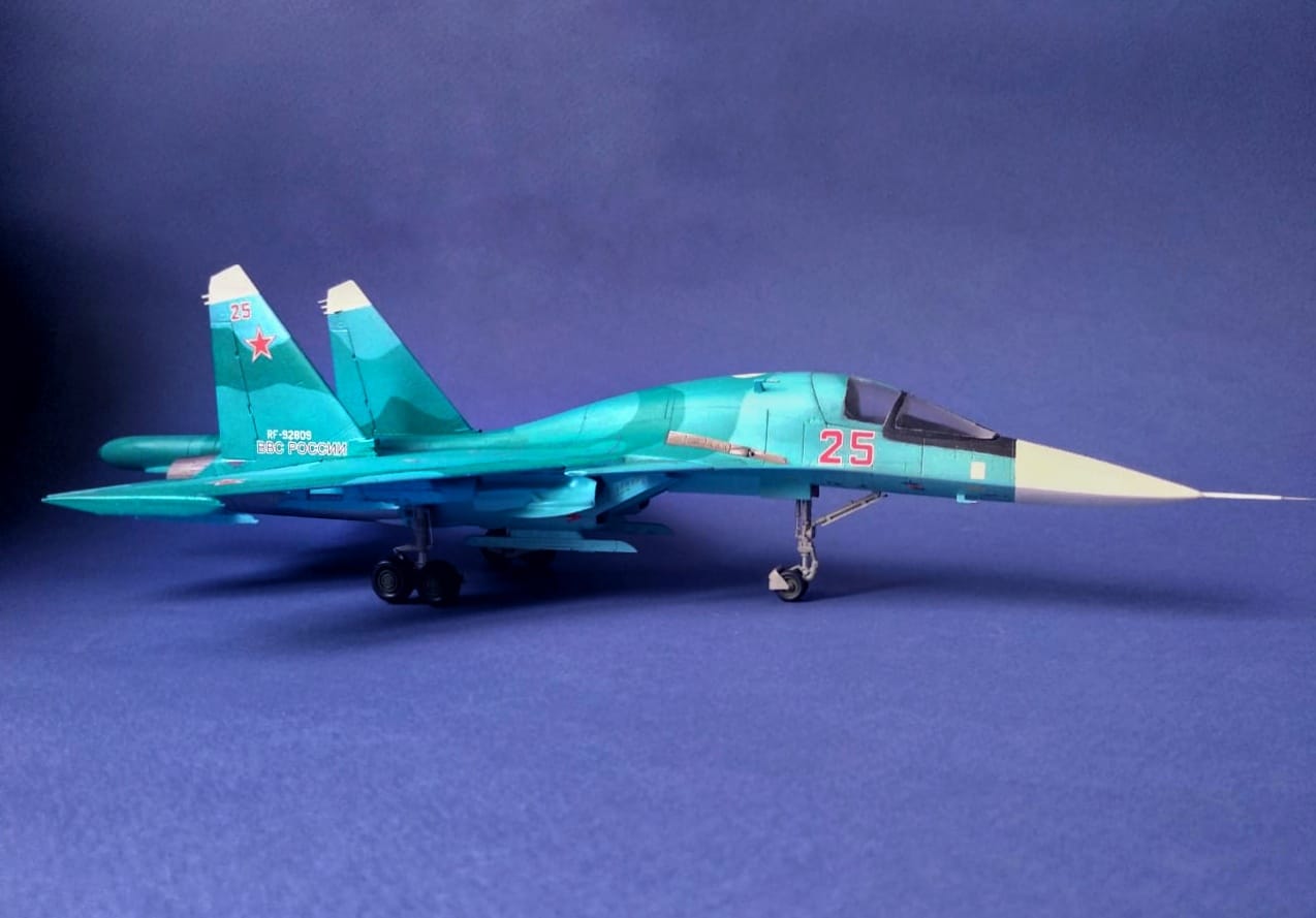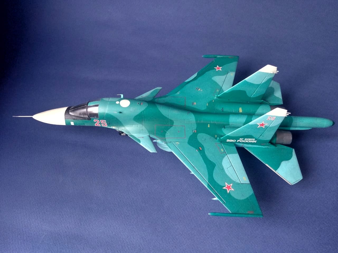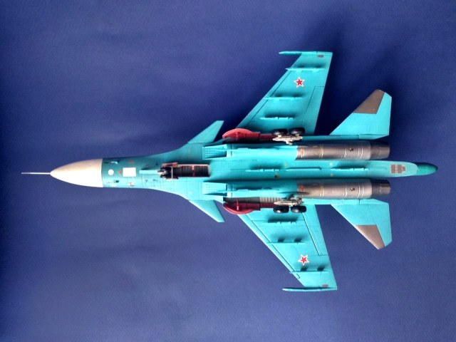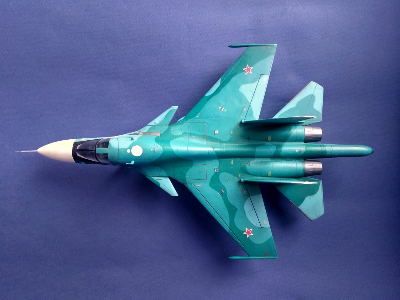 Всем привет! Модель от Звезды Су-34 - полная изкоробка. Окрашивал красками ArmaColors, эмалью Humbrol, лаки от Tamiya серии LP. Со смывкой поработать не получилось, расшивка хоть и глубокая, но не вышло.. Про копийность и древность модели знаю..Собираю для себя и получаю удовольствие)