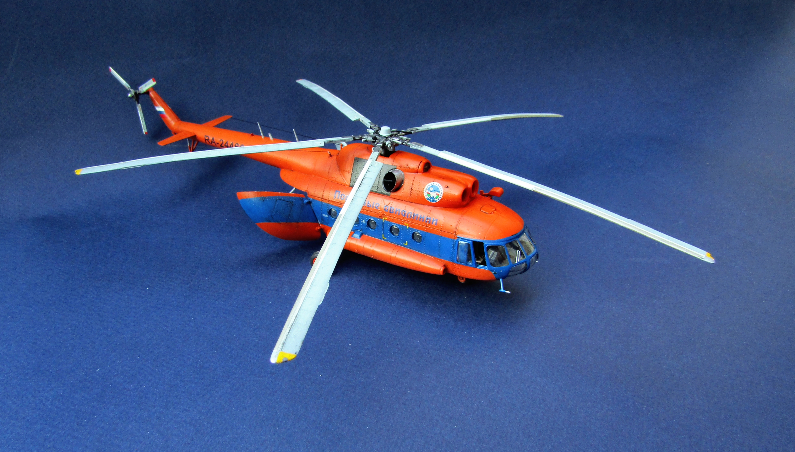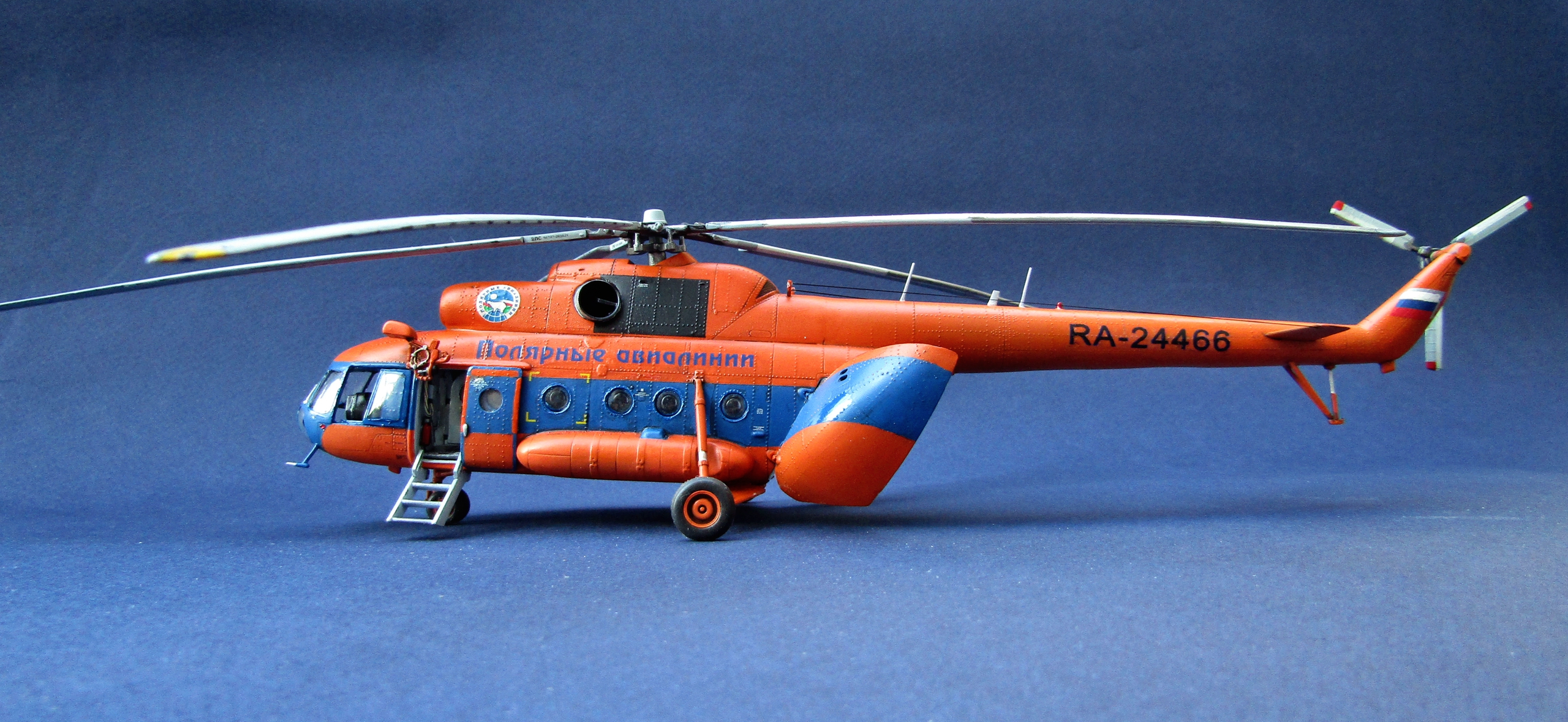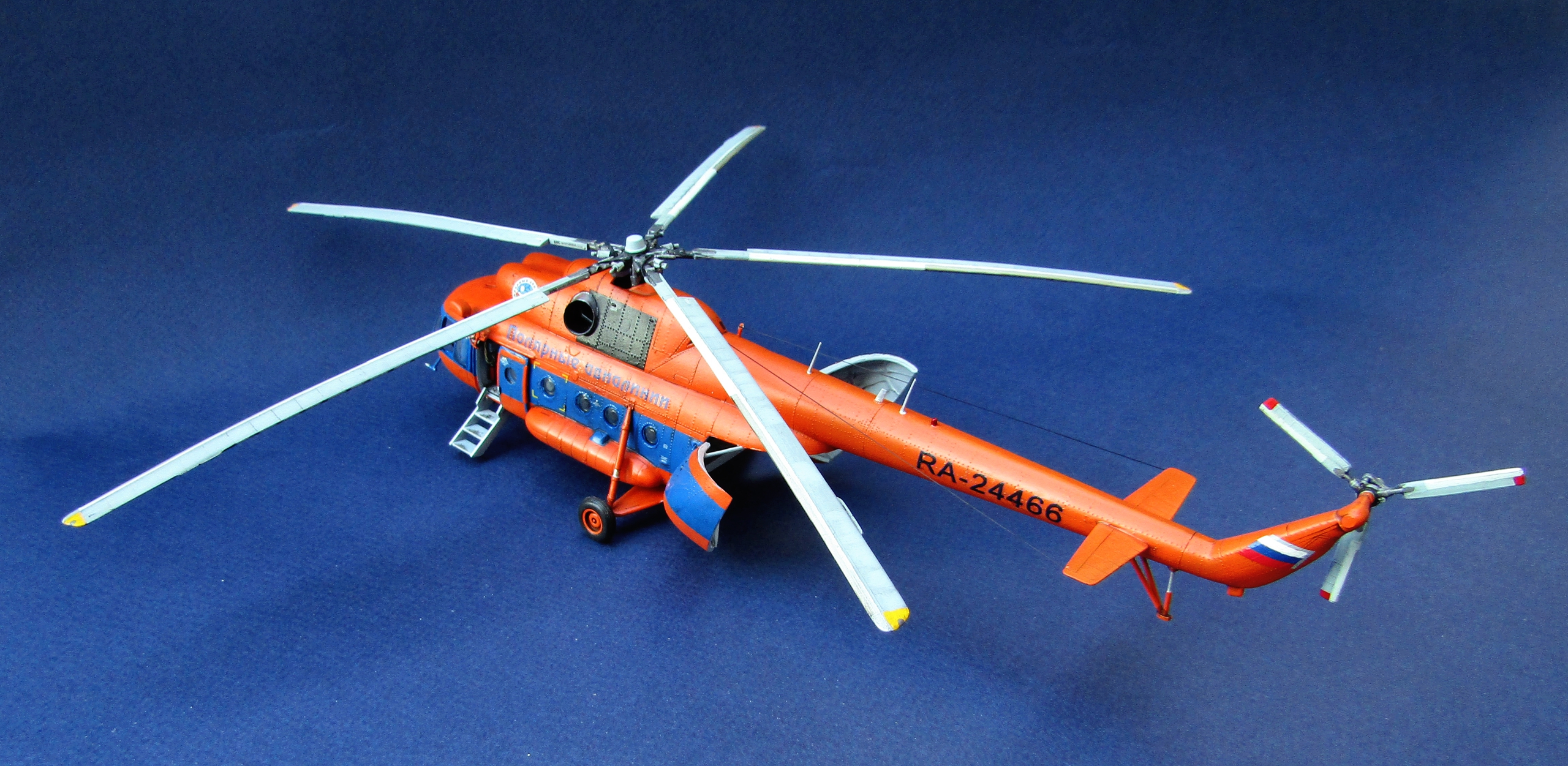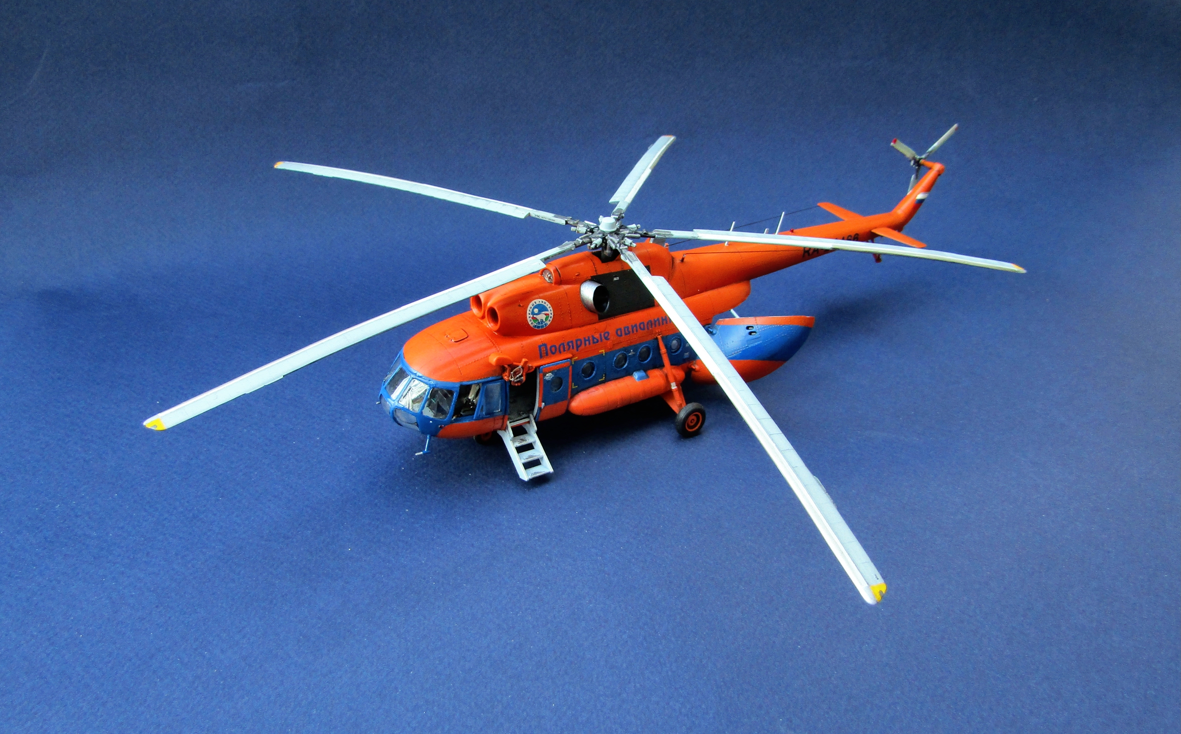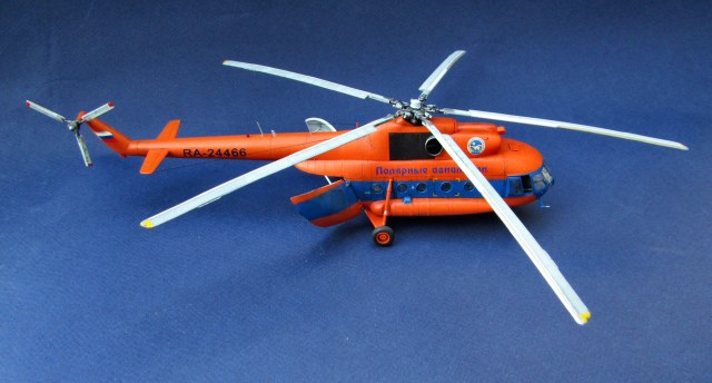 Приветствую коллеги! Представляю одну из крайних своих работ по авиации. Набор всем хорошо известен (МЧС России), описывать не буду. В интерьере использован набор травления от Eduard, в том числе цветное в кабину. Установлены резиновые колеса от экипажа. Добавлены шланги на втулке несущего винта, стульчик в грузовой салон вместо левого ряда скамеек (видел на фото). В работе использованы маски от Eduard'a (немного подрезанные под звезду) и декали от Бегемота (к сожалению надписи "Ми-8" по бортам около кабины пилотов потратил на другую модель Ми-8, новые декали покупать не стал). Перед покраской модель задута чёрным грунтом Pacific 88. Оранжевая база надута Ганзой, синие полосы эмалью revell. Серо-голубой цвет интерьера и лопастей МАКР Звезды. Смывка и финишное полуглянцевое покрытие Тамия. Копоть от выхлопа имитировать не стал - побоялся испортить модель. Приятного просмотра коллеги...