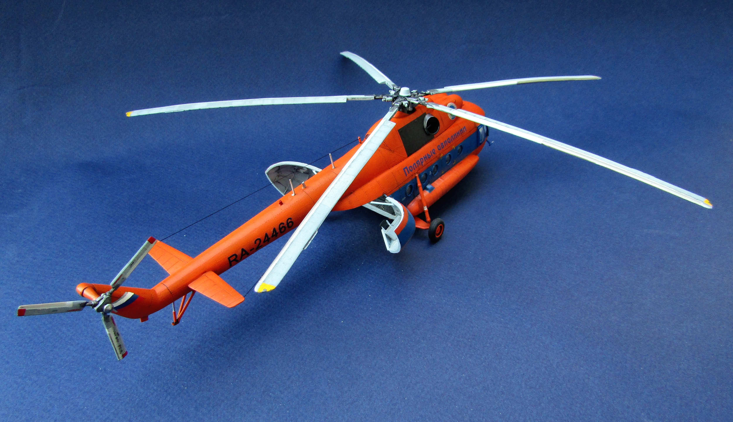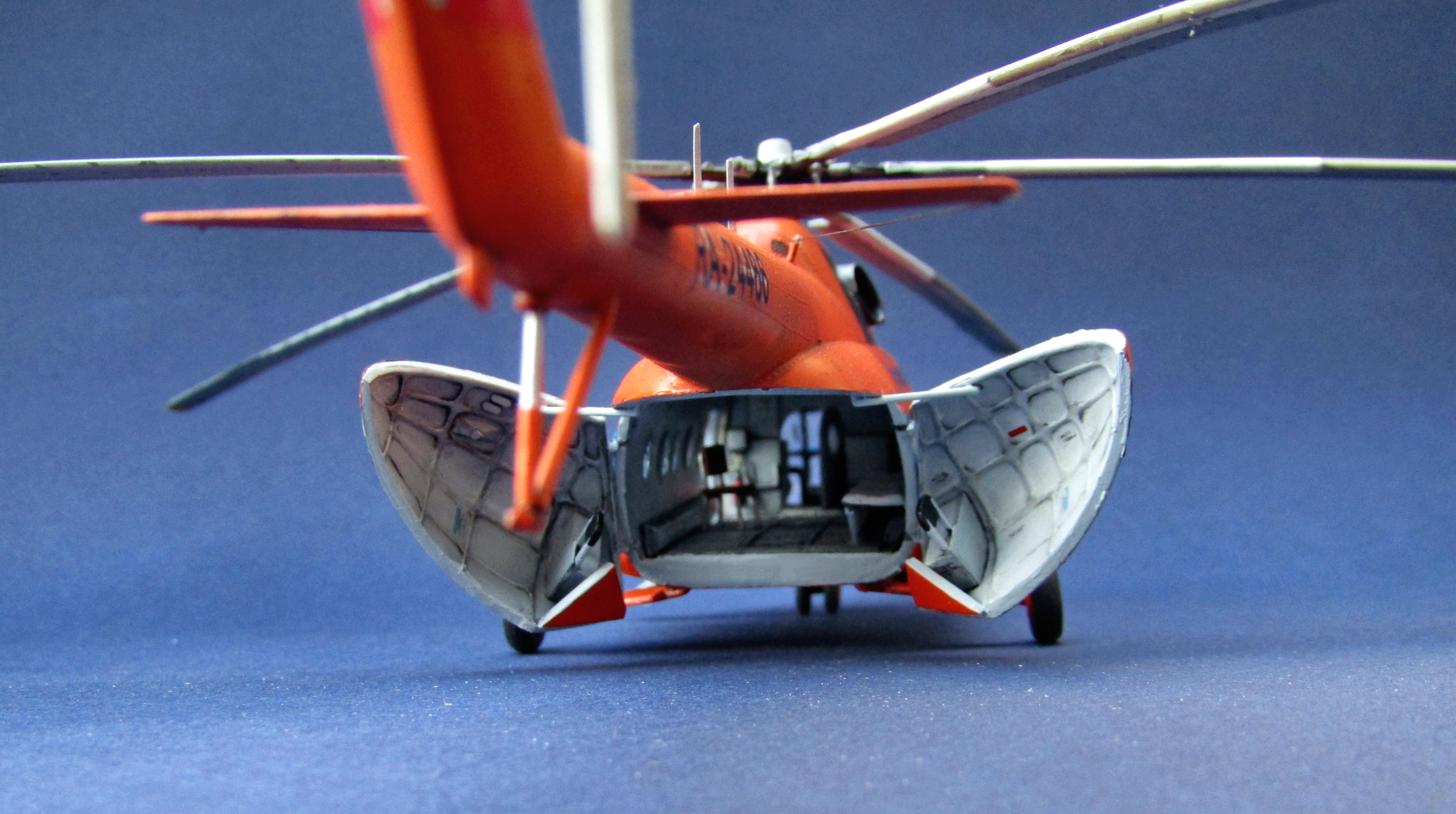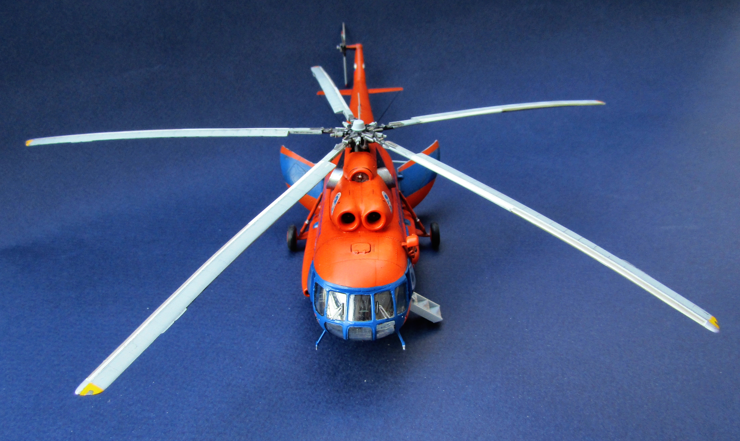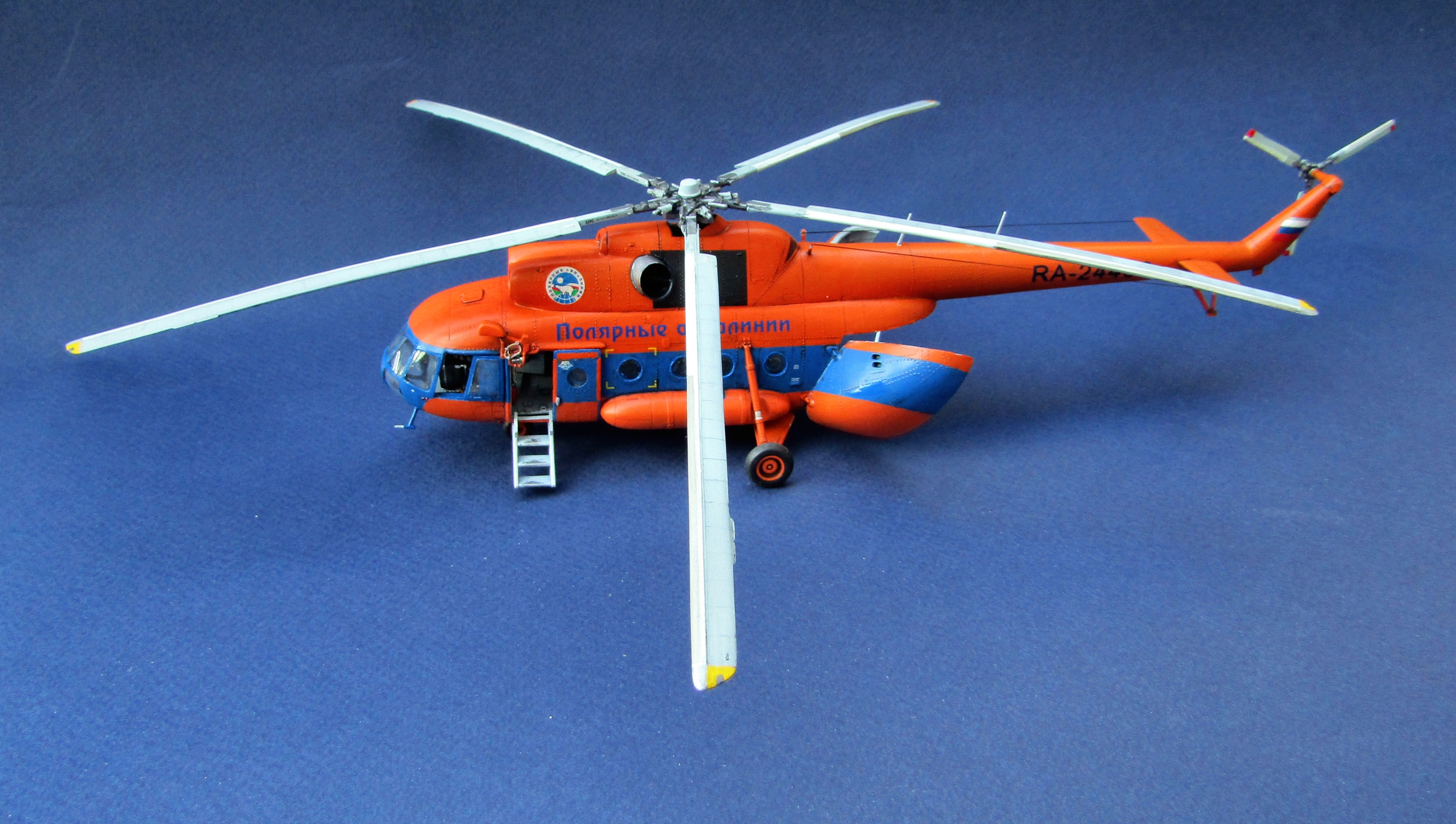Приветствую коллеги! Представляю одну из крайних своих работ по авиации. Набор всем хорошо известен (МЧС России), описывать не буду. В интерьере использован набор травления от Eduard, в том числе цветное в кабину. Установлены резиновые колеса от экипажа. Добавлены шланги на втулке несущего винта, стульчик в грузовой салон вместо левого ряда скамеек (видел на фото). В работе использованы маски от Eduard'a (немного подрезанные под звезду) и декали от Бегемота (к сожалению надписи "Ми-8" по бортам около кабины пилотов потратил на другую модель Ми-8, новые декали покупать не стал). Перед покраской модель задута чёрным грунтом Pacific 88. Оранжевая база надута Ганзой, синие полосы эмалью revell. Серо-голубой цвет интерьера и лопастей МАКР Звезды. Смывка и финишное полуглянцевое покрытие Тамия. Копоть от выхлопа имитировать не стал - побоялся испортить модель. Приятного просмотра коллеги...