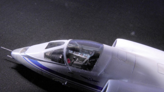 Данный кит изготовлен украинской фирмой Modelsvit по технологии ЛНД со всеми вытекающими из этого последствиями. Стыкуемость деталей посредственная, расшивка неплохая, ужасный "апельсиновый" фонарь, декаль хорошая, но все детали читлайна синего цвета с весьма заметным кракелюром. Шпатлевалась и шкурилась модель бесконечно долго. Фонарь был побежден шкурками и полировками. Читлайн, как ни странно, не развалился при нанесении. Правда перед этим я его задул лаком. Очень понравилось катапультное кресло. Это, по сути, отдельная модель! Реально круто сделано! Кое-что пришлось запилить самостоятельно: изнанка приборной доски с проводками, стандартное "шлангирование" стоек, фары на стойках самодельные. Остальное искаропка. Сильно ушатывать модель не стал, не видел такого на фото. Так, легкая поюзанность.