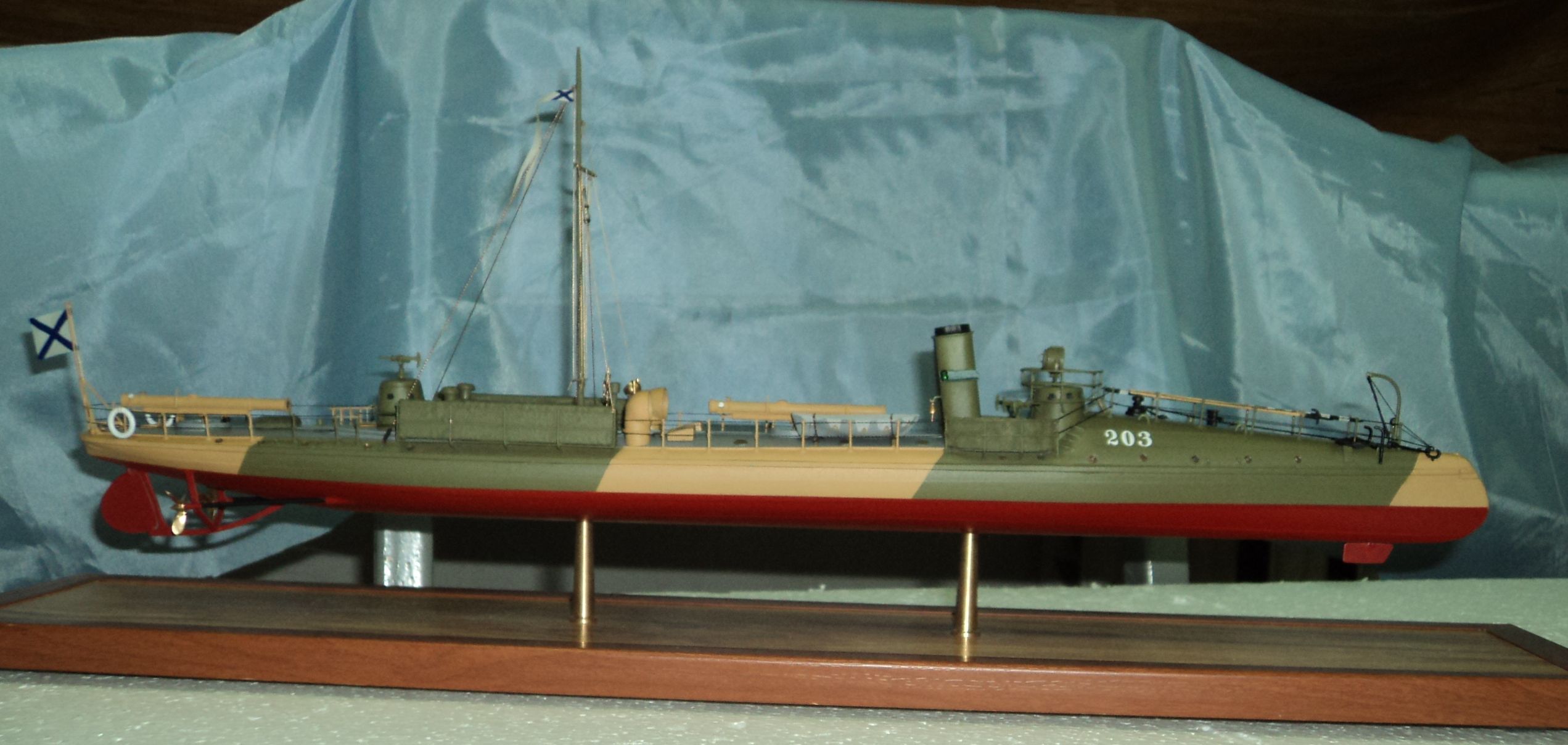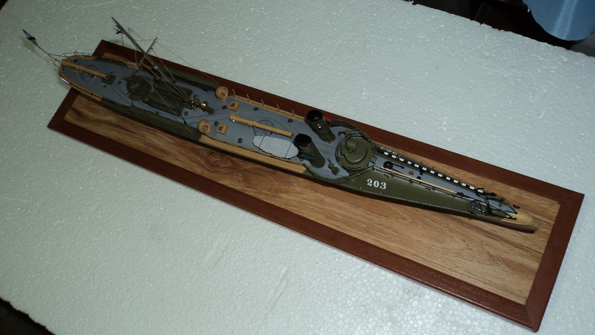 Спасибо за оценку и комментарий.Отвечу на вопросы.Действительно,палуба покрывалась линолиумом,но по информации,которую мне предоставил известный специалист по миноносному флоту Роман Дубинин,палубный линолиум имел несколько цветов:светло-коричневый(кофе с молоком),коричневый и серый.Конкретно на этот миноносец,подтверждающего документа нет,но известно также,что после износа линолиума,палубу покрывали кортесином,парусиной на которую наносилась пробковая крошка на олифе.Цвет этого материала ближе к серому.Исходя из этого,я и выбрал серый цвет.Дорожка на баке хорошо видна на фотографиях миноносцев серии "Або",а "Уссури" и "Сунгари" являлись продолжением этой серии,логично предположить,что и на них аналогичная "дорожка" была для облегчения передвижения моряков.К сожалению,практика эксплуатации этих кораблей,показала обратное,но после износа линолиума,по кортесину было действительно легче передвигаться,особенно по мокрой палубе.