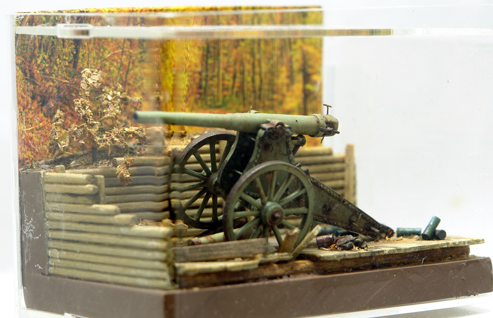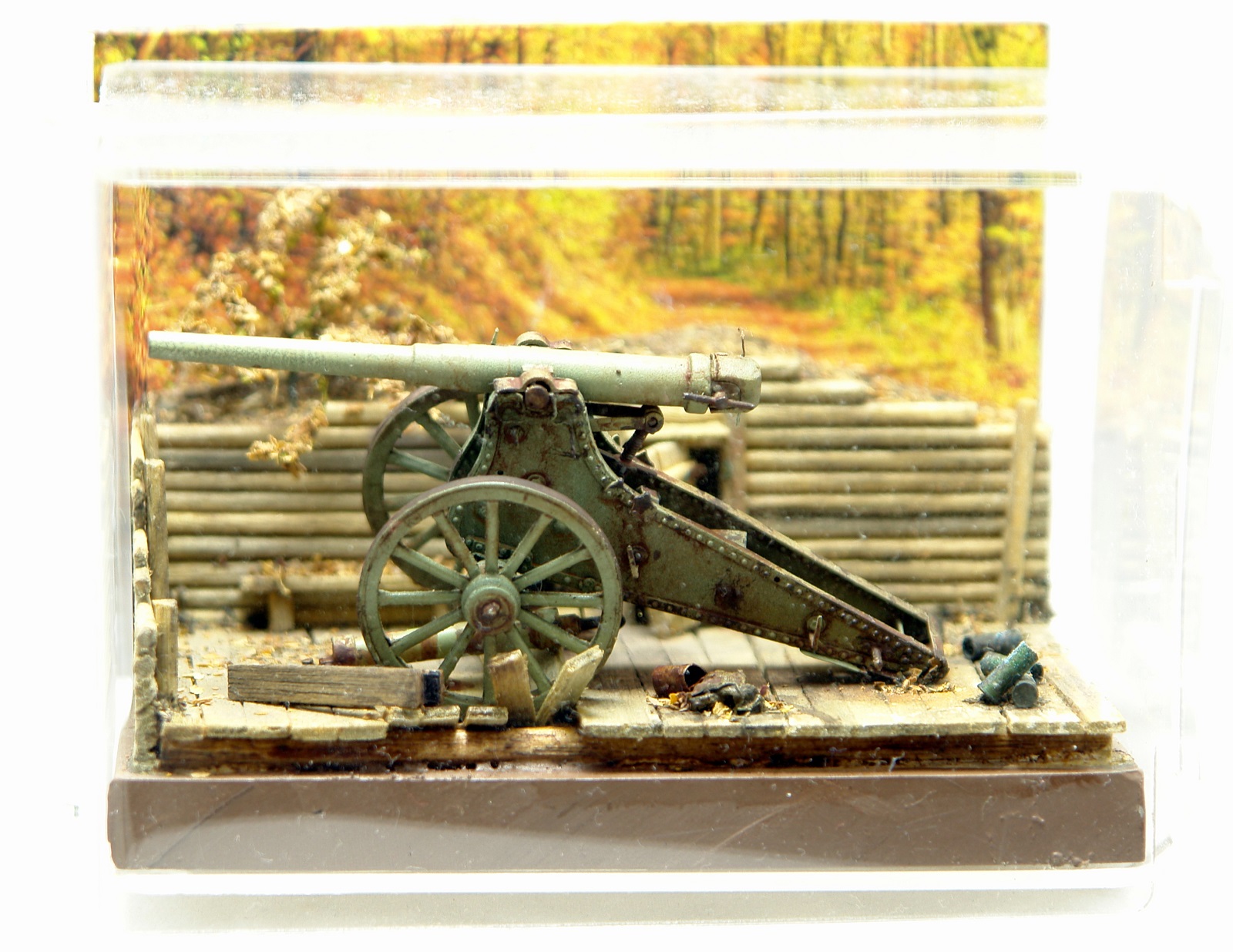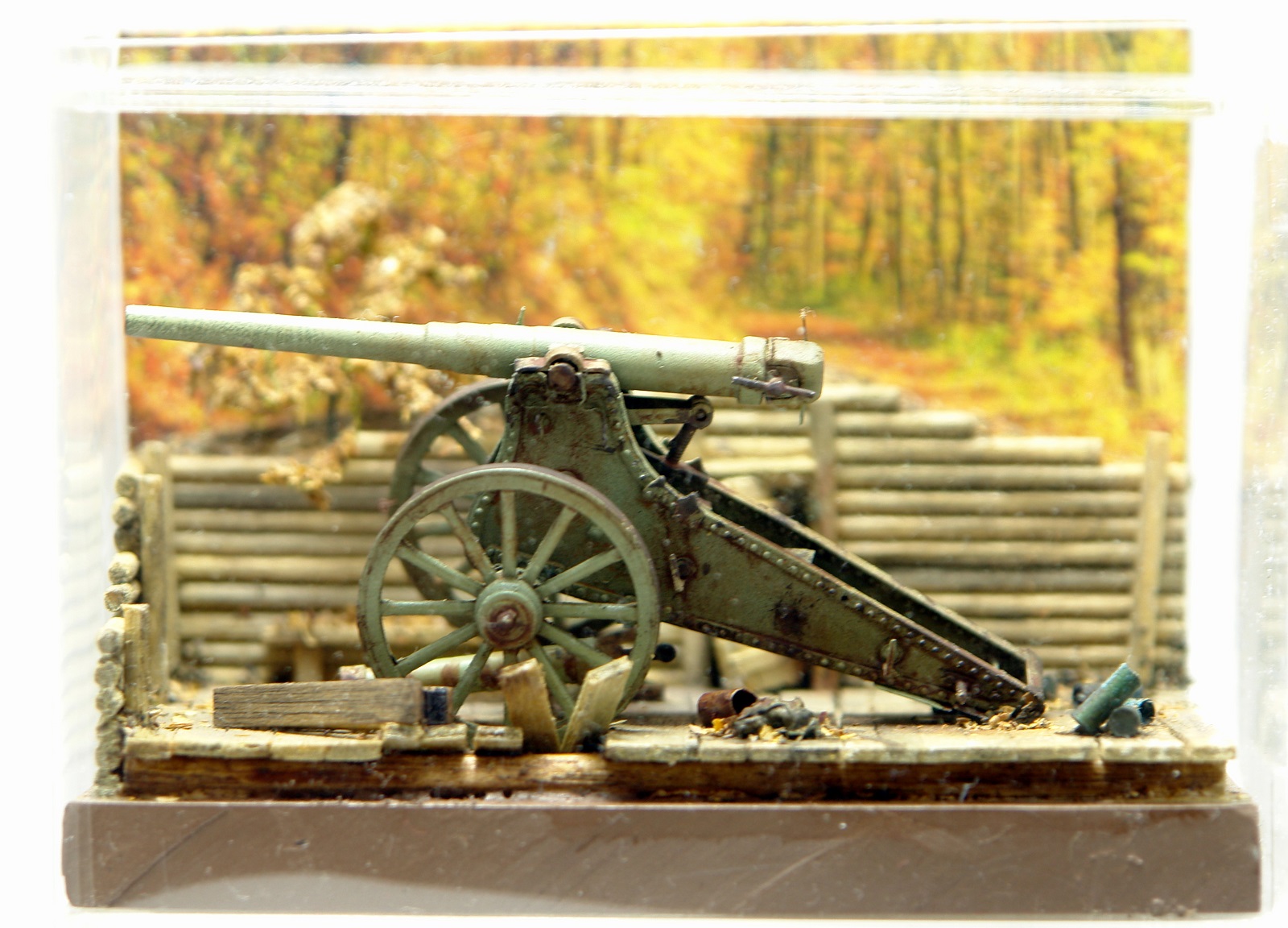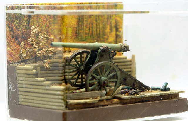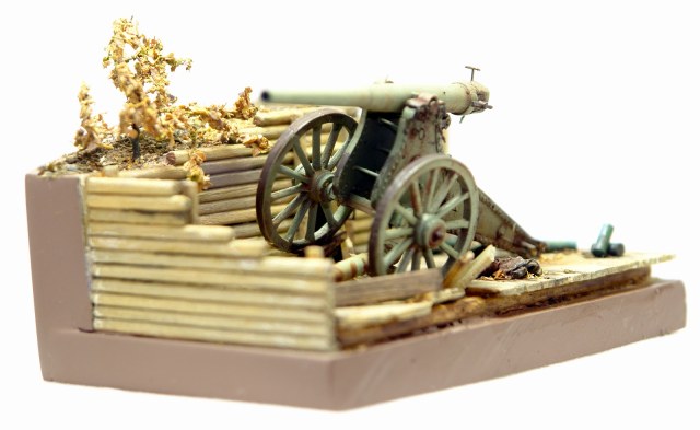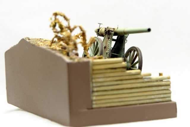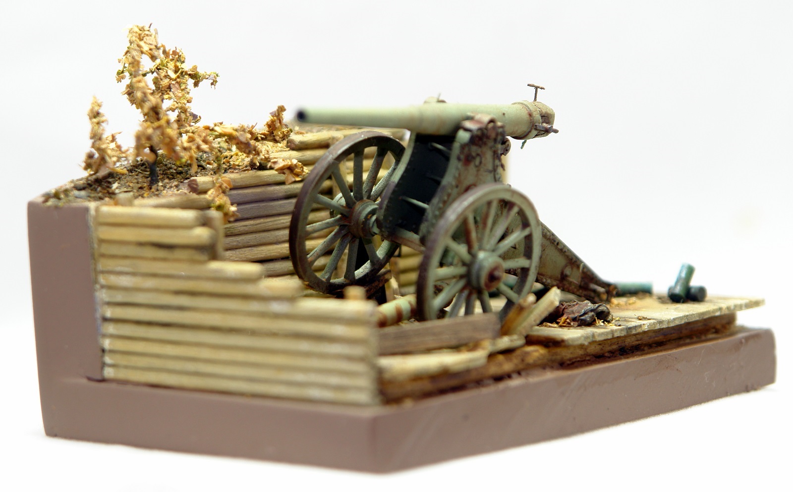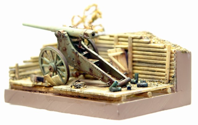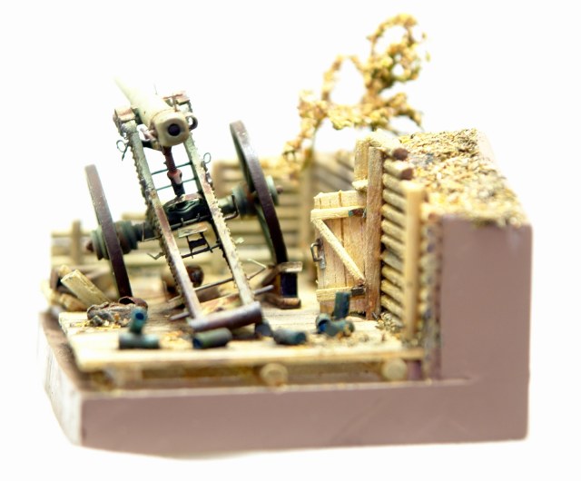 Решил сделать на подставке, что бы оживить модель. Использовал палочки для чая / кофе, зубочистки, бумагу и всякую мелочь. Для старения дерева брал Сульфат Железа, он же Железный Купорос и всякую другую модельную химию. Для антуража использовал гильзы от РБ, 127 мм немецкой пушки, самые близкие, что нашел по калибру в продаже. Разница 0,23 мм. Но что есть, то есть. Резал на 2 части по длине и паял донышки. Петли на двери и всякая мелочь - обрезки травла, проволока. Для их старения уже отработанная схема в парах аммиака. Спасибо Святославу Першину, прислал мне травленое ведро, которое теперь пользую как лекало для вырезки. Очень пригодилось. Ещё раз спасибо Святослав.