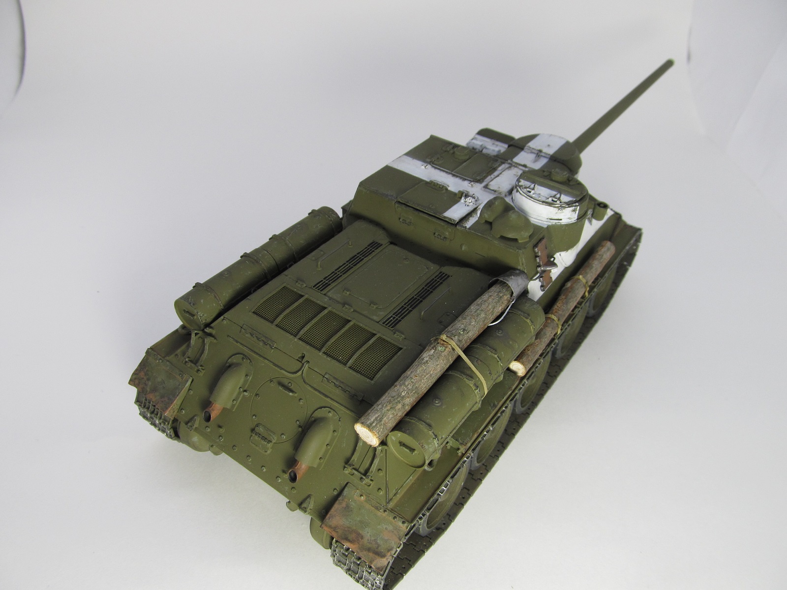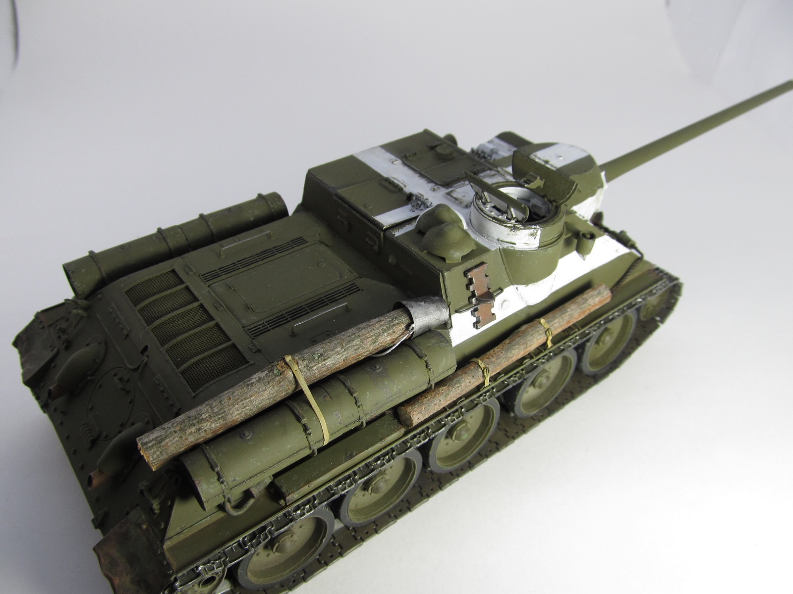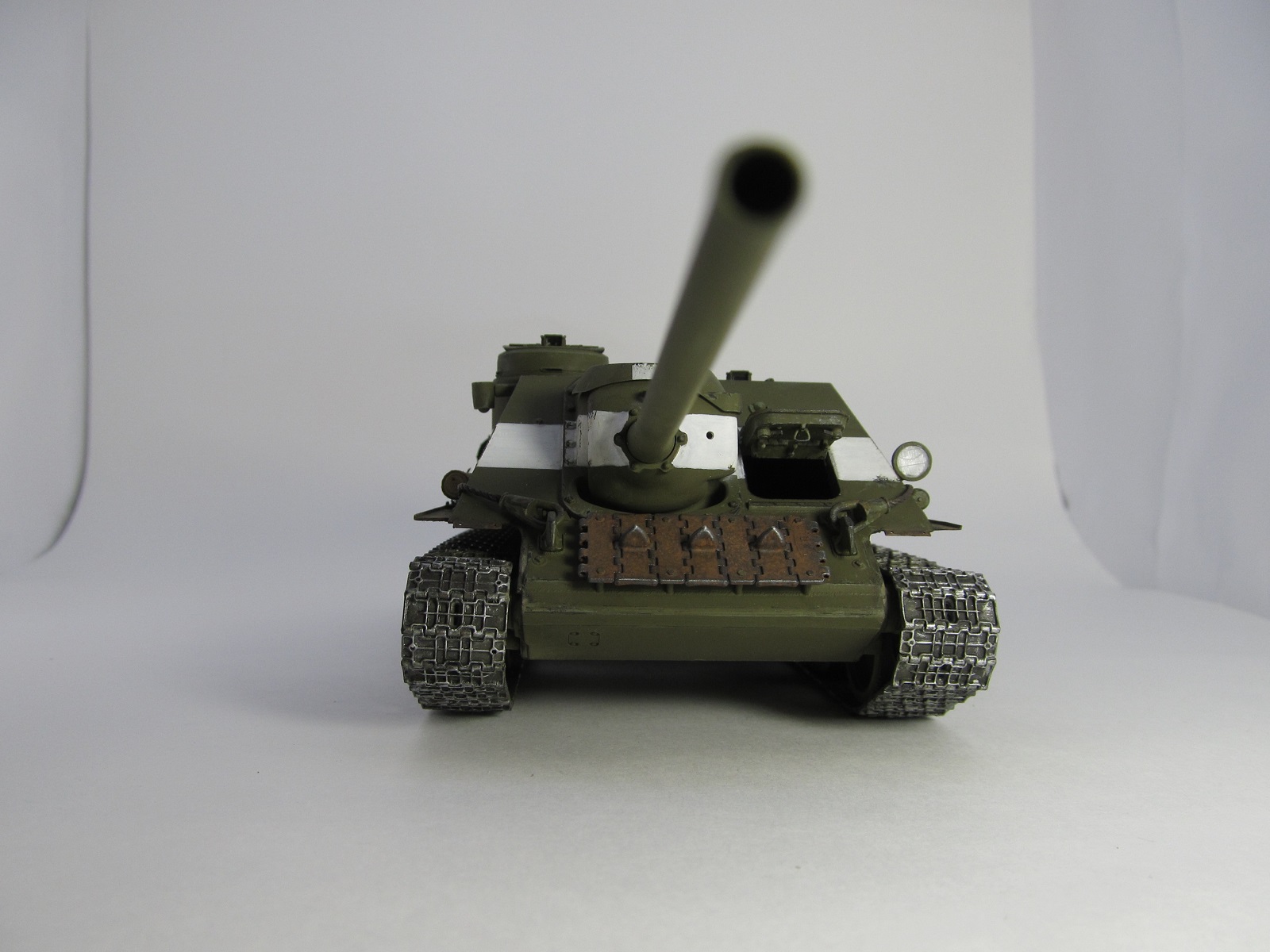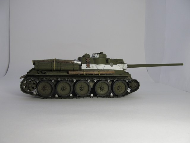 Спасибо, Евгений!Смывкой я как раз чуть-чуть и прошелся))), не хотелось сильно пачкать. А насыщенный белый- это по моему разумению относительно свежая краска, не успевшая еще запачкаться, ведь по задумке самоход изображен перед началом Берлинской операции, т.е. последняя декада апреля 1945 г.(20 апреля 1945 года была принята директива Ставки Верховного Главнокомандования за номером 11073. В ней говорилось следующее, цитата:«Советские войска (пехота, танки, авиация) обозначают себя серией красных ракет. Помимо ракет советские танки обозначаются одной белой полосой вокруг башни по её середине и белым крестом на крыше башни».) Потому сильно и не пачкал. А вот когда (или если) на диораму поставлю- там можно будет заляпать от души)))