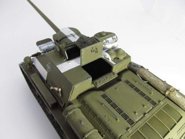 Думаю, в этом нет необходимости. Как я говорил в описании работы, окраска внутренней поверхности крышек люков могла быть, как белой, так и защитной, в общий цвет базы, единого стандарта по окраске внутренней поверхности танков и самоходных установок на их базе нет. Разные заводы красили по-своему. Т.к. на всей предыдущей советской БТТ крышки люков у меня окрашены белым цветом, то на этой машине я решил их покрасить защитным, так сказать, отступить от общего правила. Есть распространенное и ошибочное мнение у многих моделистов по этому вопросу, как по советской, так и по немецкой технике, что, дескать, у немцев внутренняя часть люков всегда красилась в базу, а на советской технике напротив- белым. Это не так. Всякие вариации окраски встречались и у немцев, и у наших. Тому есть множество фото доказательств.
