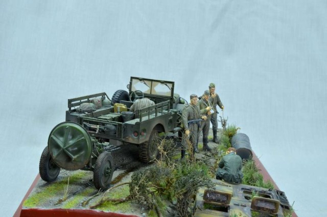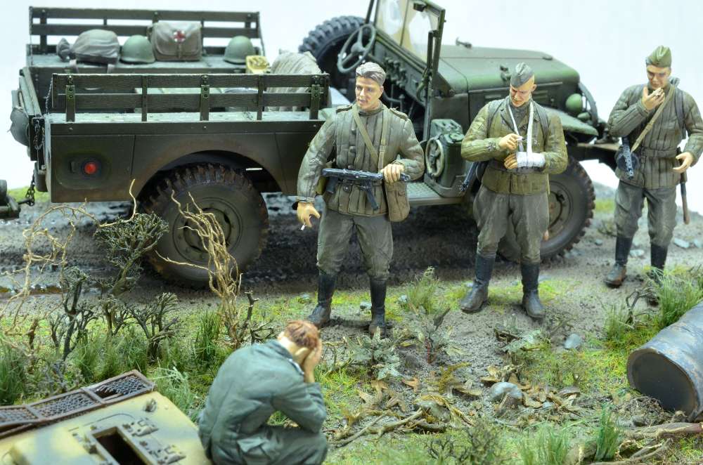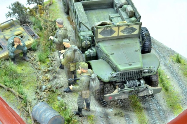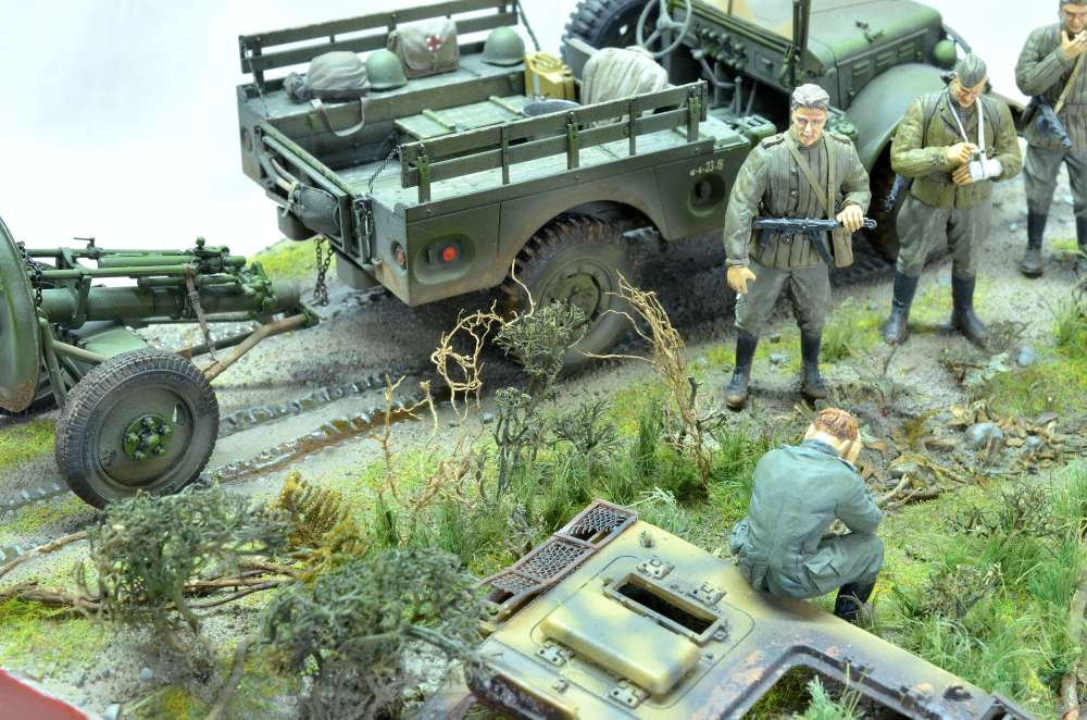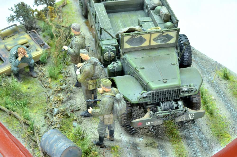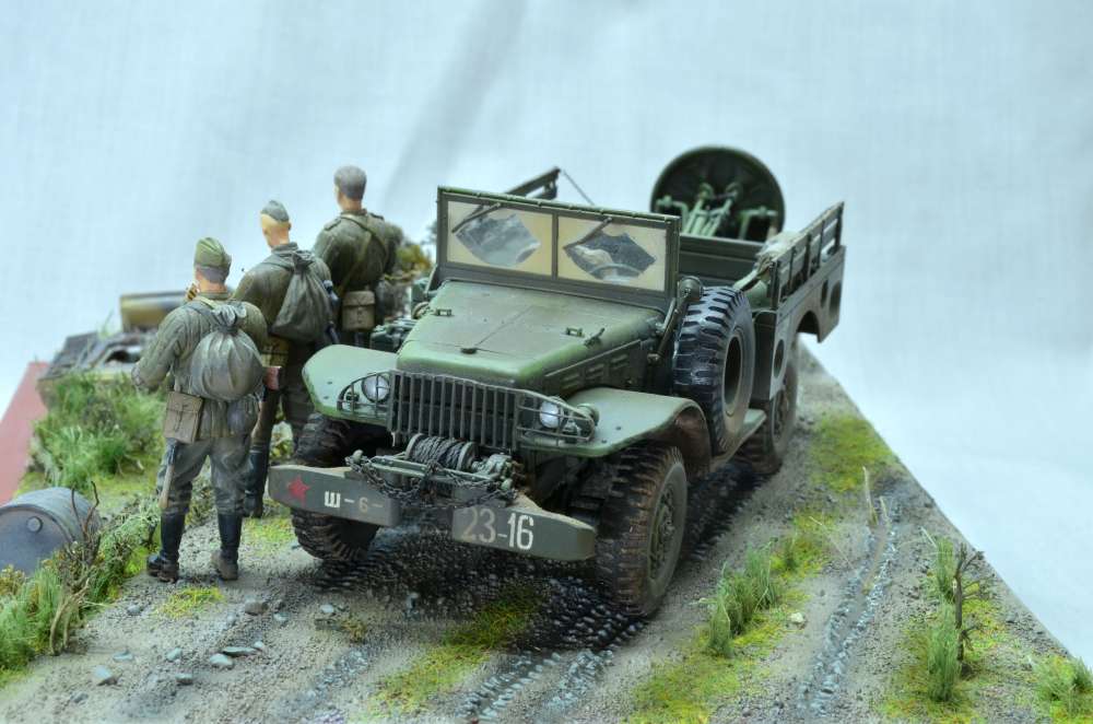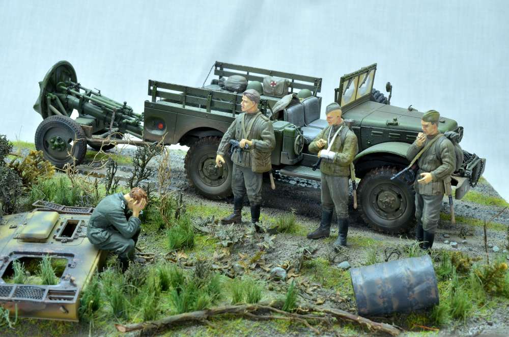 Здравствуйте! Диорама на тему "Курской битвы", использовал "Додж 3/4" от "Мир моделей" известный хорошим качеством и миномет от "Звезды" известный плохим качеством. К миномету пришлось добавить смоляные колеса от "ЗиП". Фигуры красноармейцев от "Dragon" и "ICM" с головами "Legend" немного доработанные, немец от "Танк". Изначально хотел изобразить разведчиков, как на последней фотографии, но понял, что пока для меня это сложно. Использовались краски и лак "Tamiya", смывку и пигменты "MIG", краску "Звезда", масло "Сонет".