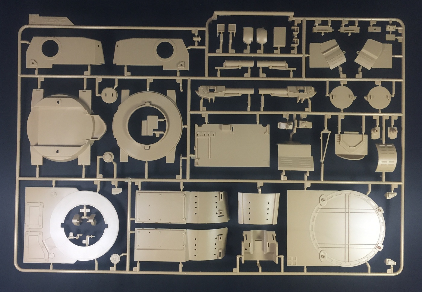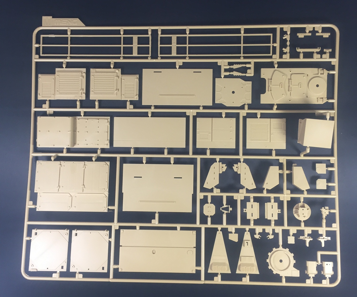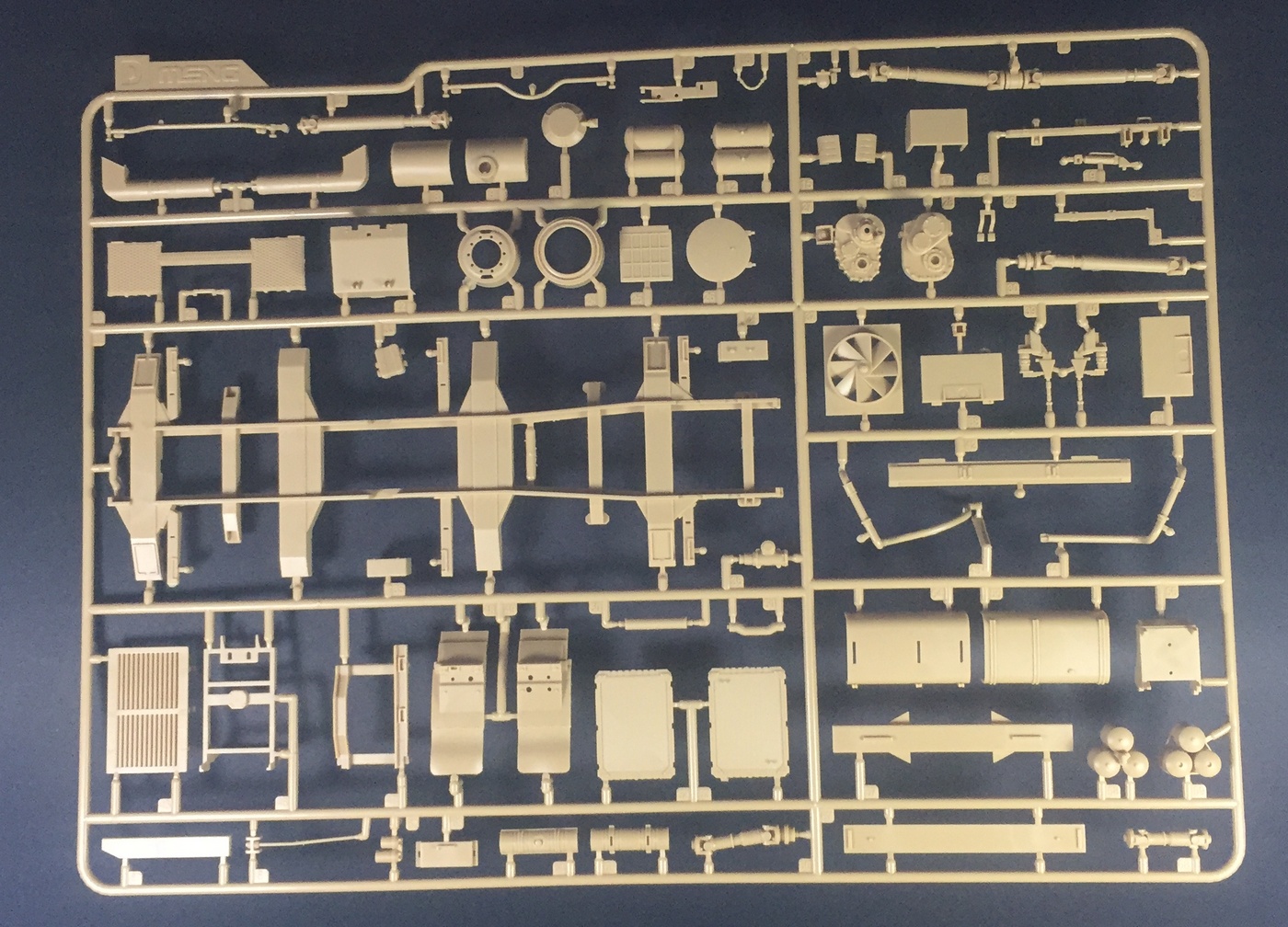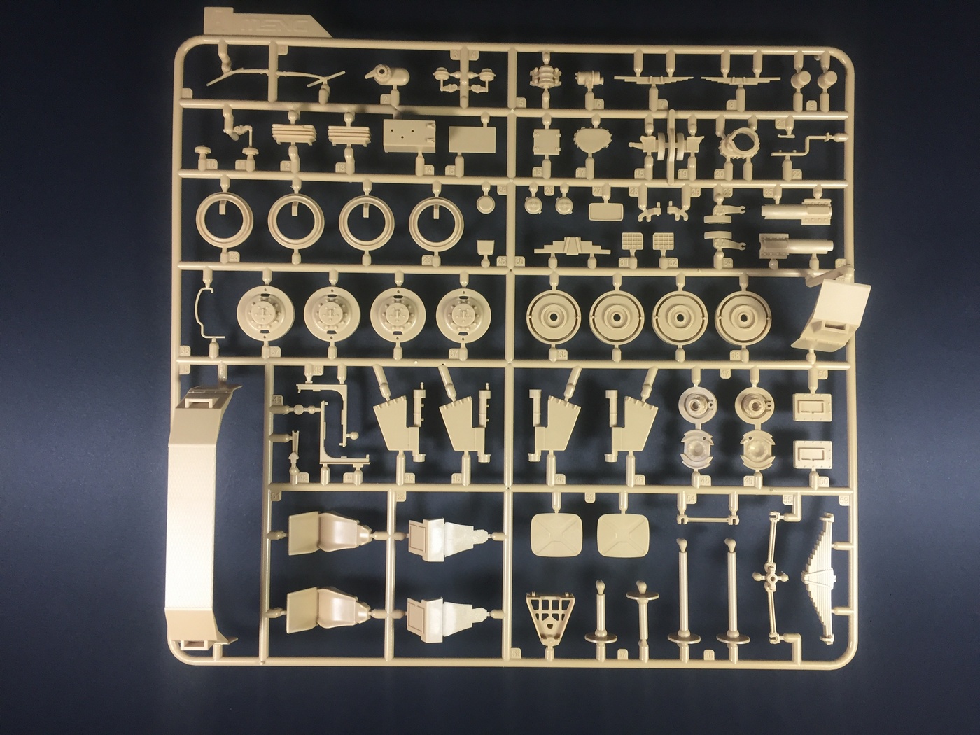 Итак, огромная коробка, как у Смерча, если не больше, внутри 15 литников песочного цвета, прозрачный литник, девять виниловых колес с надписью BFLSHINA ))), также декали, и виниловые втулки. Два листка фототравления. Итого 759 деталей.