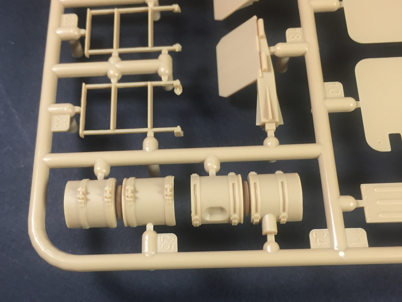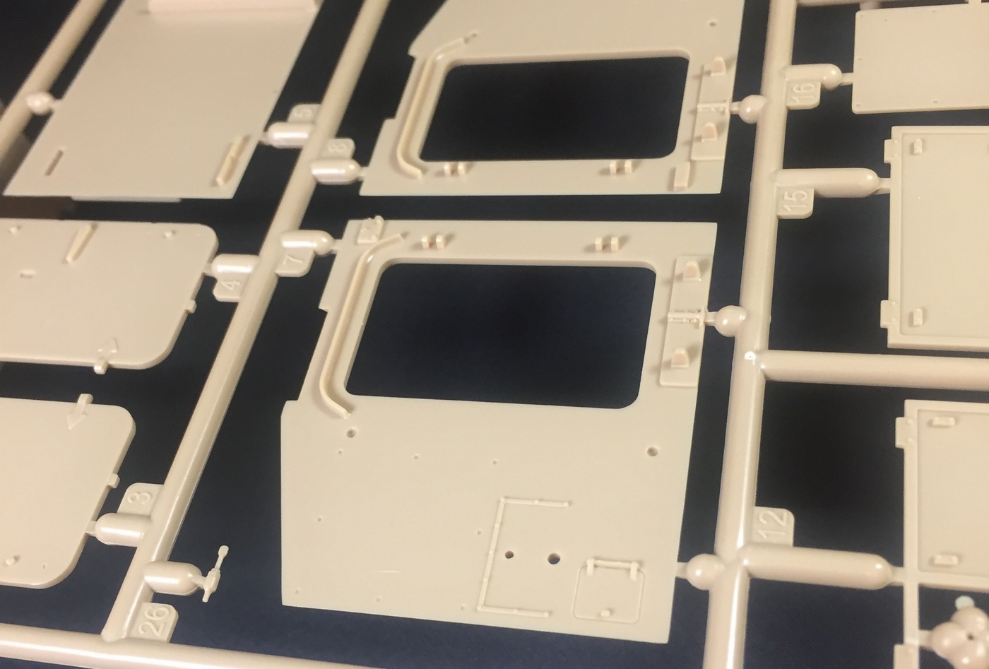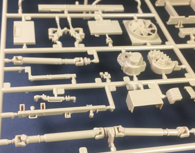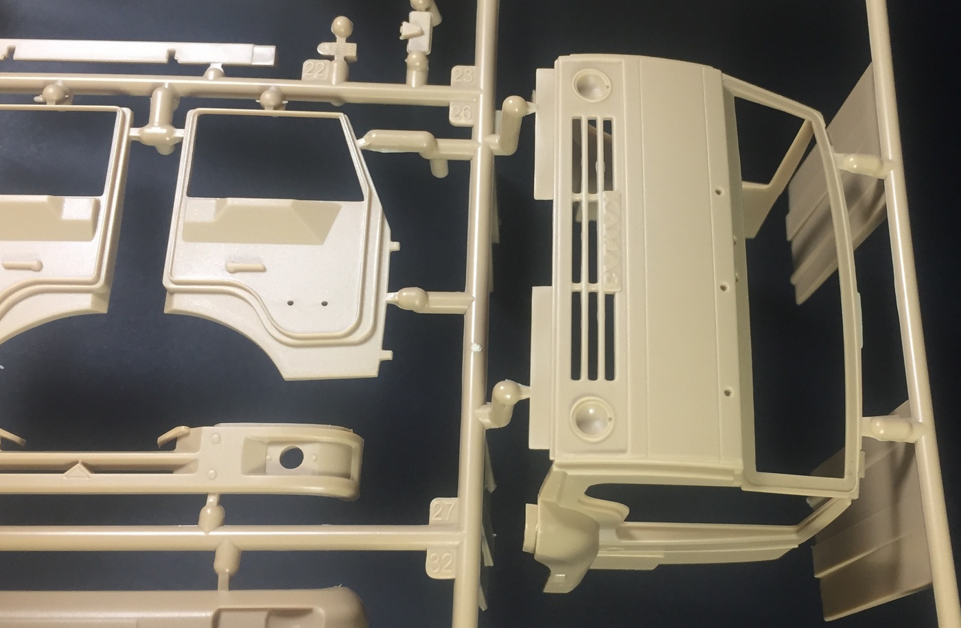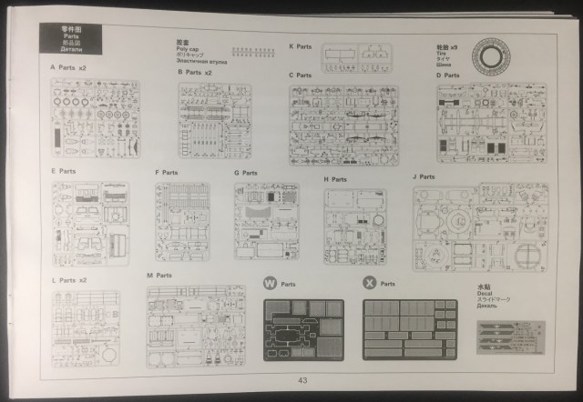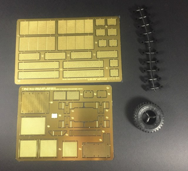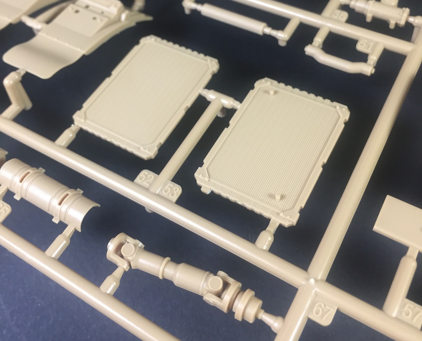 Итак, огромная коробка, как у Смерча, если не больше, внутри 15 литников песочного цвета, прозрачный литник, девять виниловых колес с надписью BFLSHINA ))), также декали, и виниловые втулки. Два листка фототравления. Итого 759 деталей.