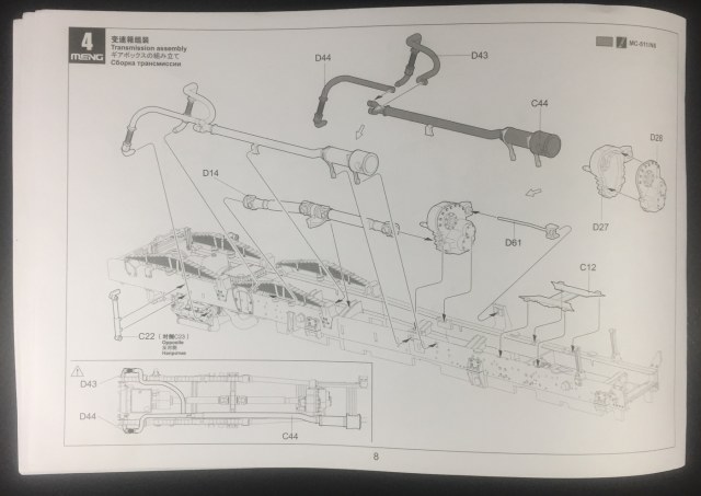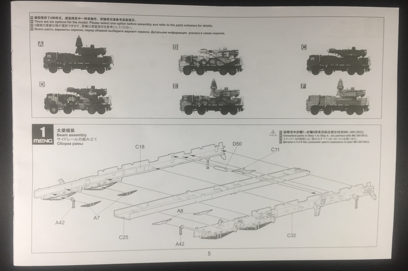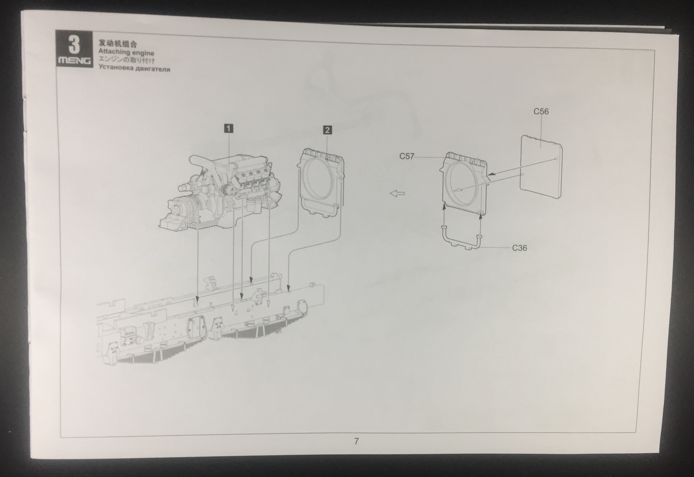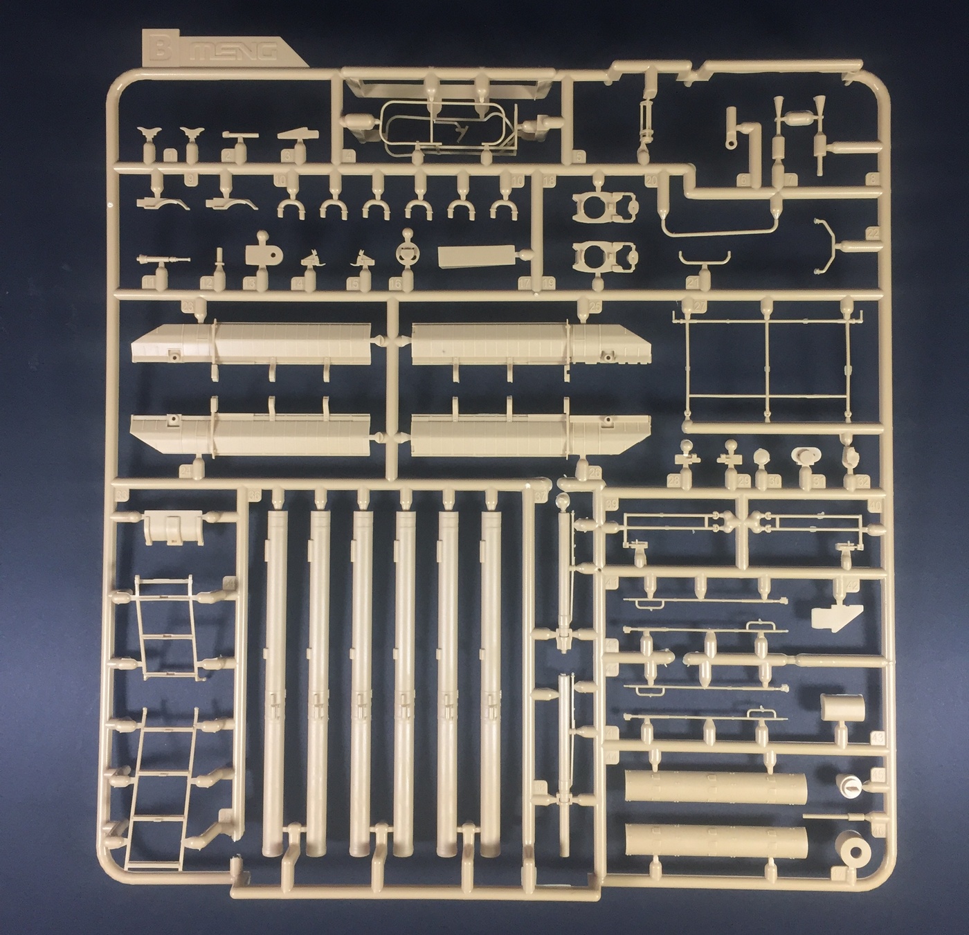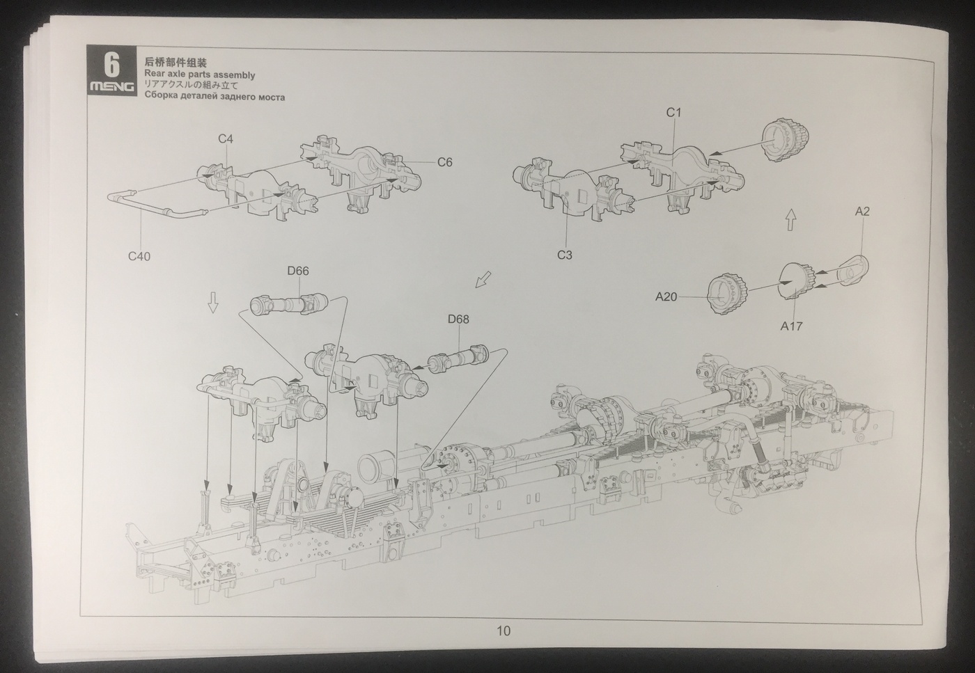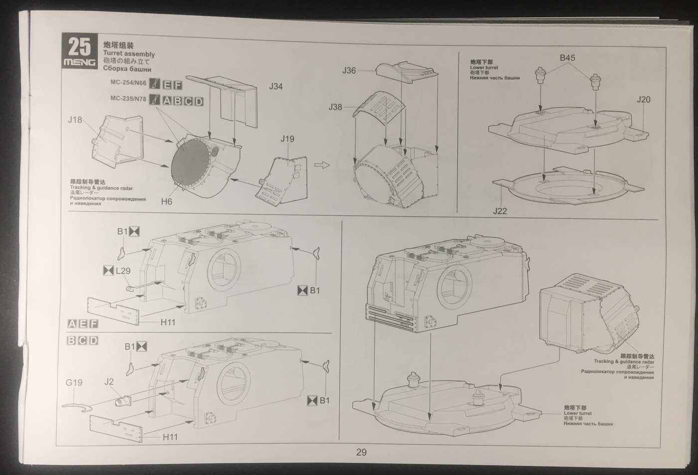 Что касается качества литья, оно на высшем уровне, как обычно у Менга, мелочевка отлита очень тщательно, смещения пресс-форм и облоя нет практически. Конечно, детали все равно приходится зачищать и обрабатывать, но по минимуму. Стыкуемость (на момент написания я уже собрал его наполовину) идеальная, щелей нет, все встает на свои места как родное. Процесс сборки довольно простой, вменяемо описан в инструкции. Даже путаницы с шестью опциями почти не возникает - но чтобы ее не возникало, инструкцию следует изучить внимательно заранее, и вычеркнуть все ненужные этапы! Инструкция толщиной примерно как Война и Мир, 44 страницы + 6 цветных отдельной вкладкой.