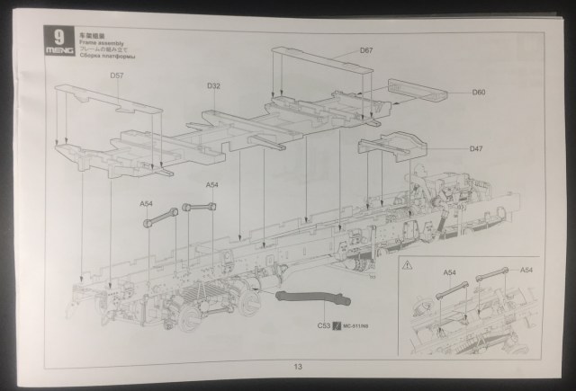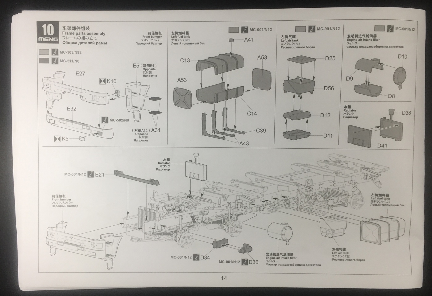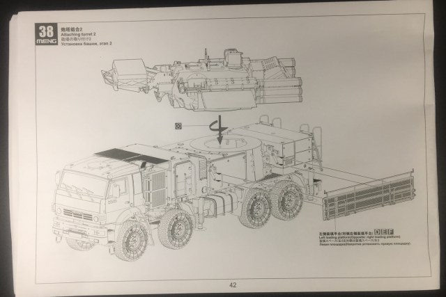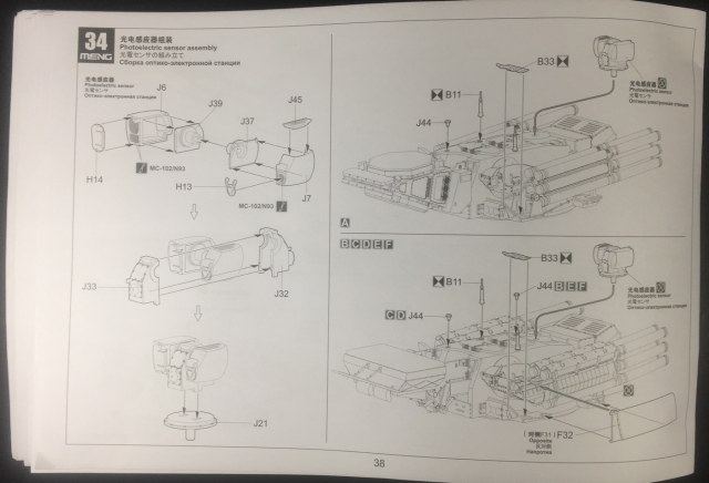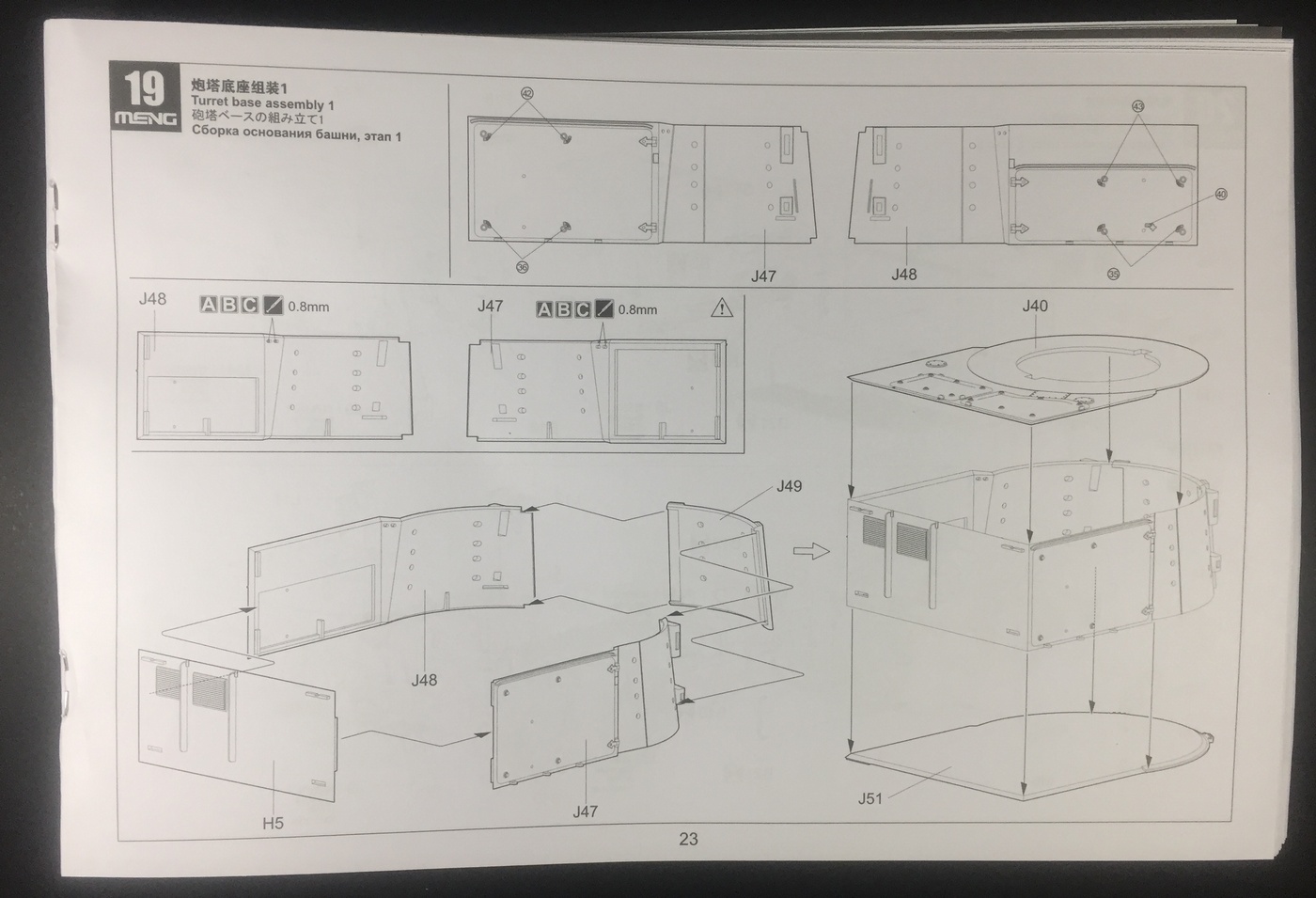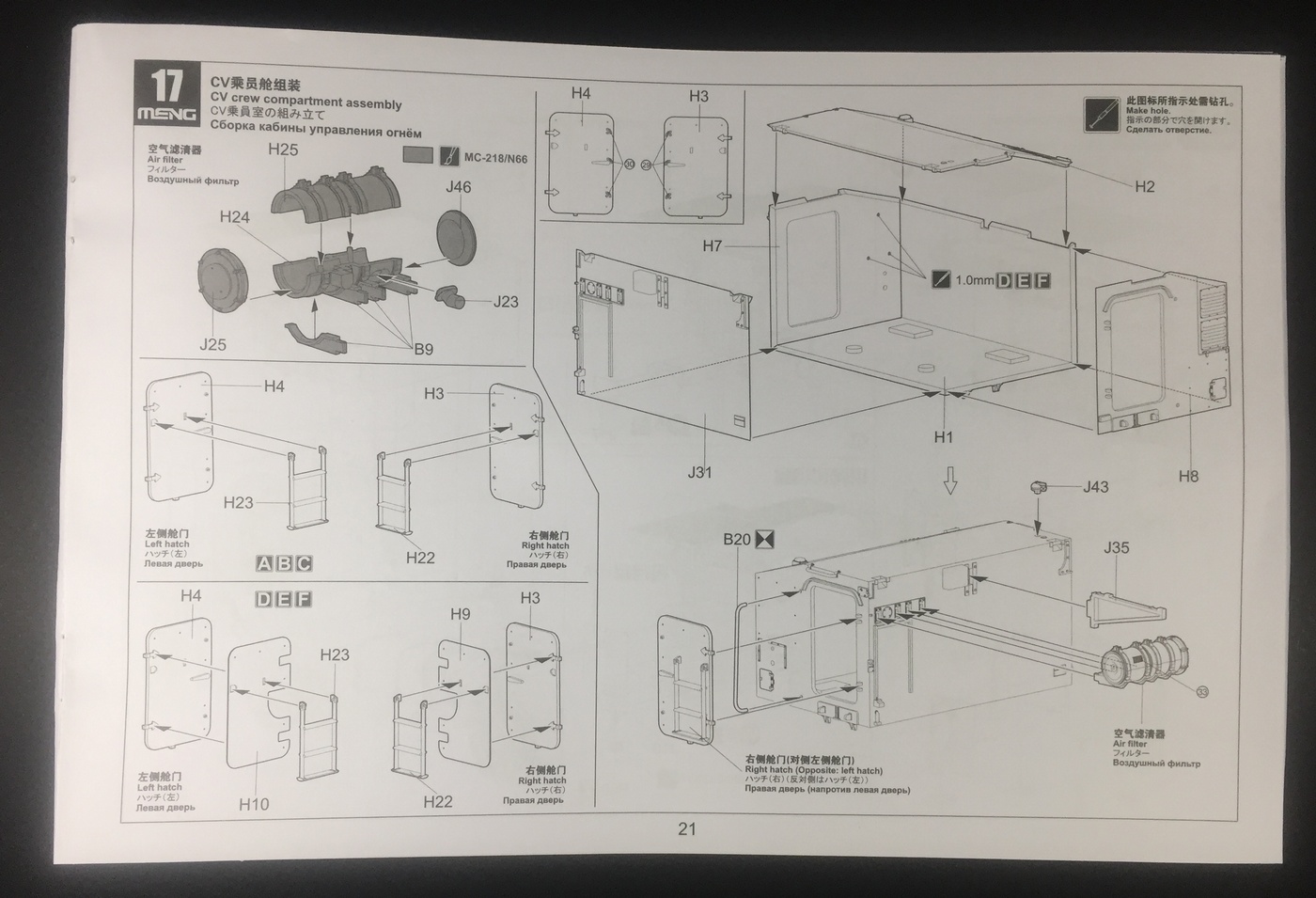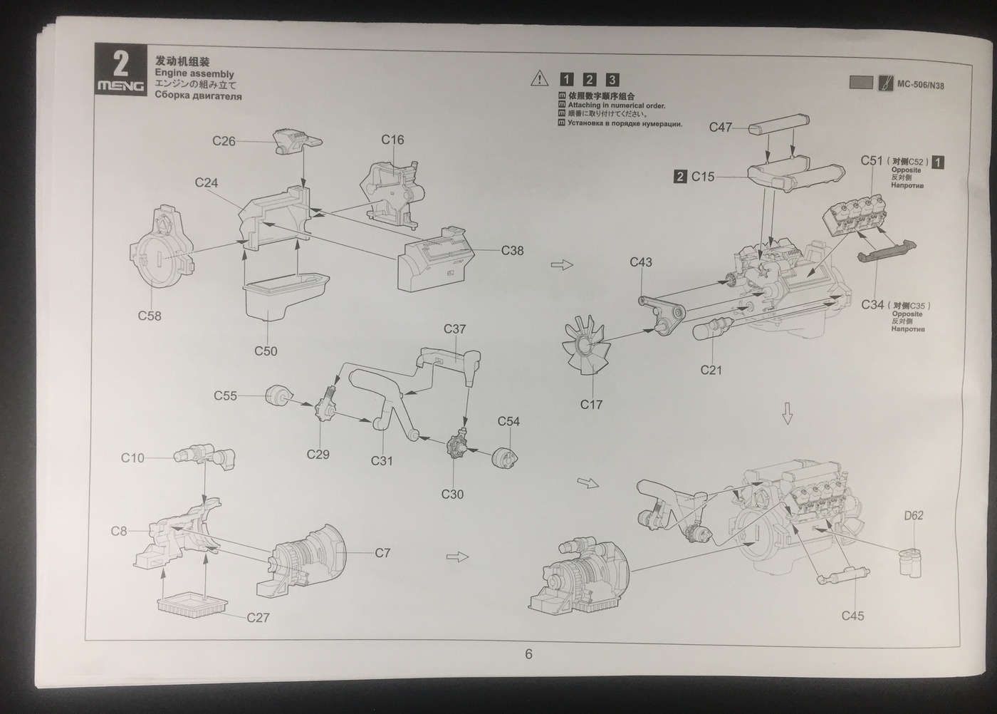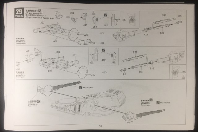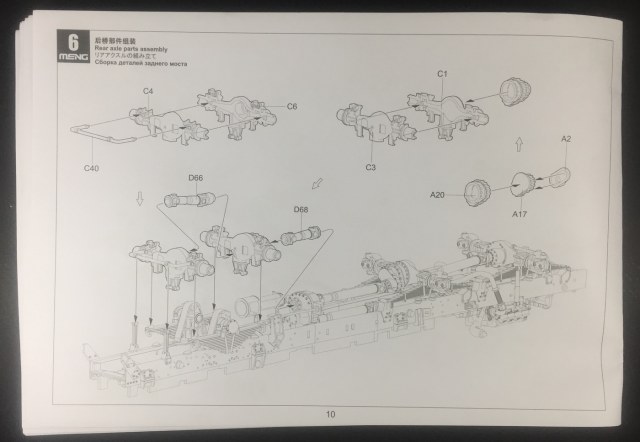 Что касается качества литья, оно на высшем уровне, как обычно у Менга, мелочевка отлита очень тщательно, смещения пресс-форм и облоя нет практически. Конечно, детали все равно приходится зачищать и обрабатывать, но по минимуму. Стыкуемость (на момент написания я уже собрал его наполовину) идеальная, щелей нет, все встает на свои места как родное. Процесс сборки довольно простой, вменяемо описан в инструкции. Даже путаницы с шестью опциями почти не возникает - но чтобы ее не возникало, инструкцию следует изучить внимательно заранее, и вычеркнуть все ненужные этапы! Инструкция толщиной примерно как Война и Мир, 44 страницы + 6 цветных отдельной вкладкой.