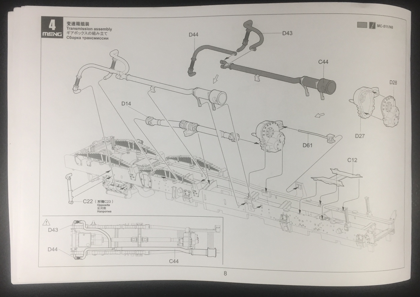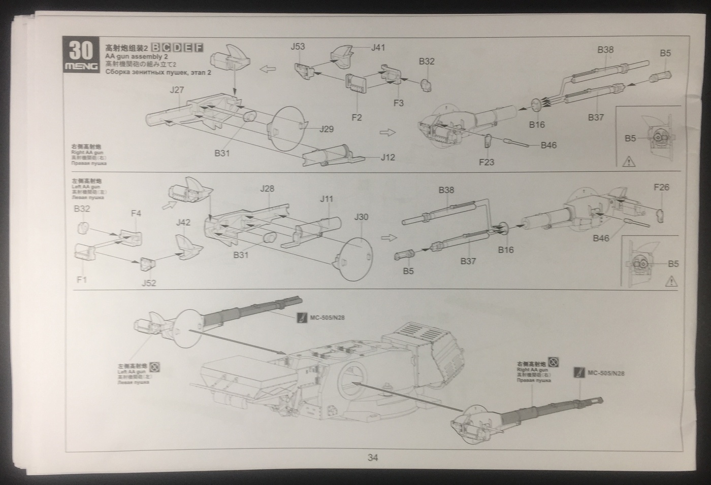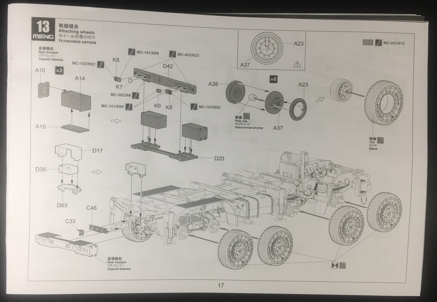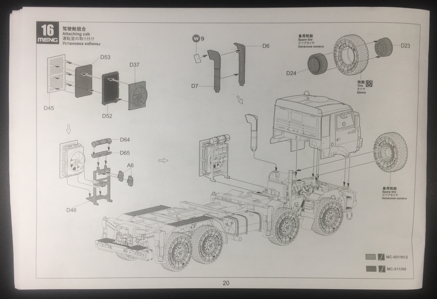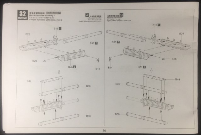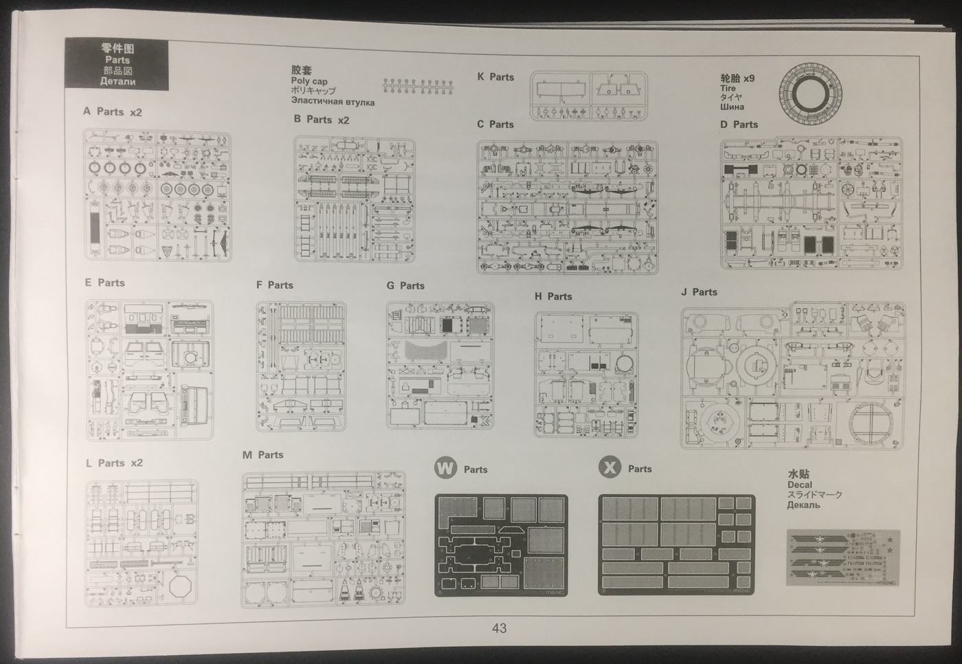 Что касается качества литья, оно на высшем уровне, как обычно у Менга, мелочевка отлита очень тщательно, смещения пресс-форм и облоя нет практически. Конечно, детали все равно приходится зачищать и обрабатывать, но по минимуму. Стыкуемость (на момент написания я уже собрал его наполовину) идеальная, щелей нет, все встает на свои места как родное. Процесс сборки довольно простой, вменяемо описан в инструкции. Даже путаницы с шестью опциями почти не возникает - но чтобы ее не возникало, инструкцию следует изучить внимательно заранее, и вычеркнуть все ненужные этапы! Инструкция толщиной примерно как Война и Мир, 44 страницы + 6 цветных отдельной вкладкой.