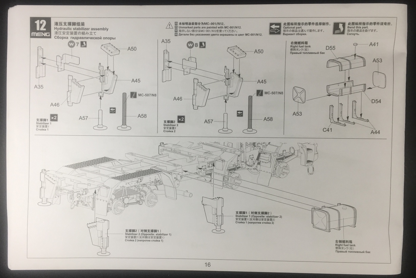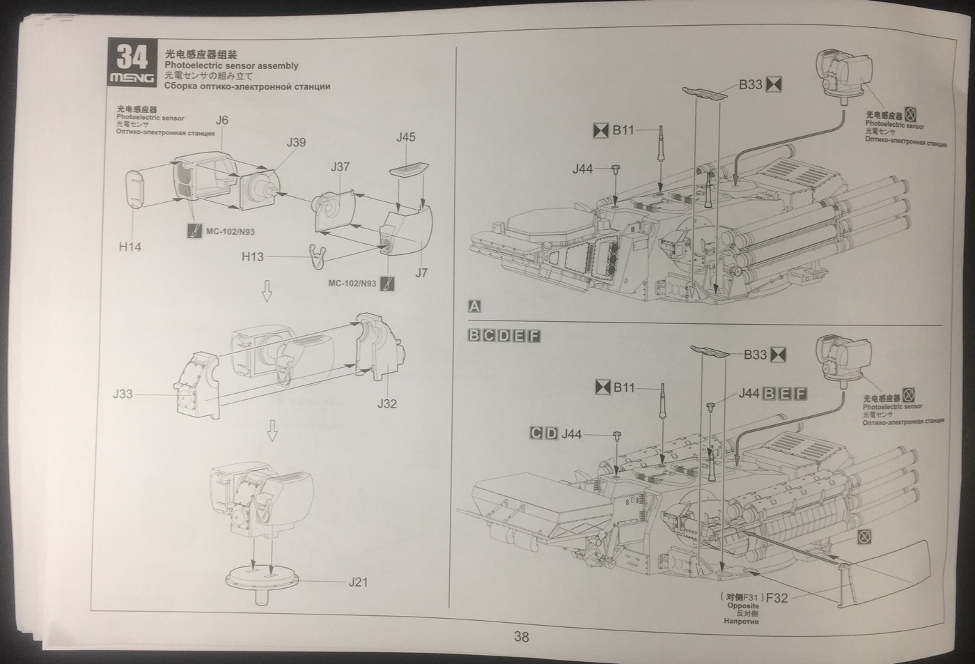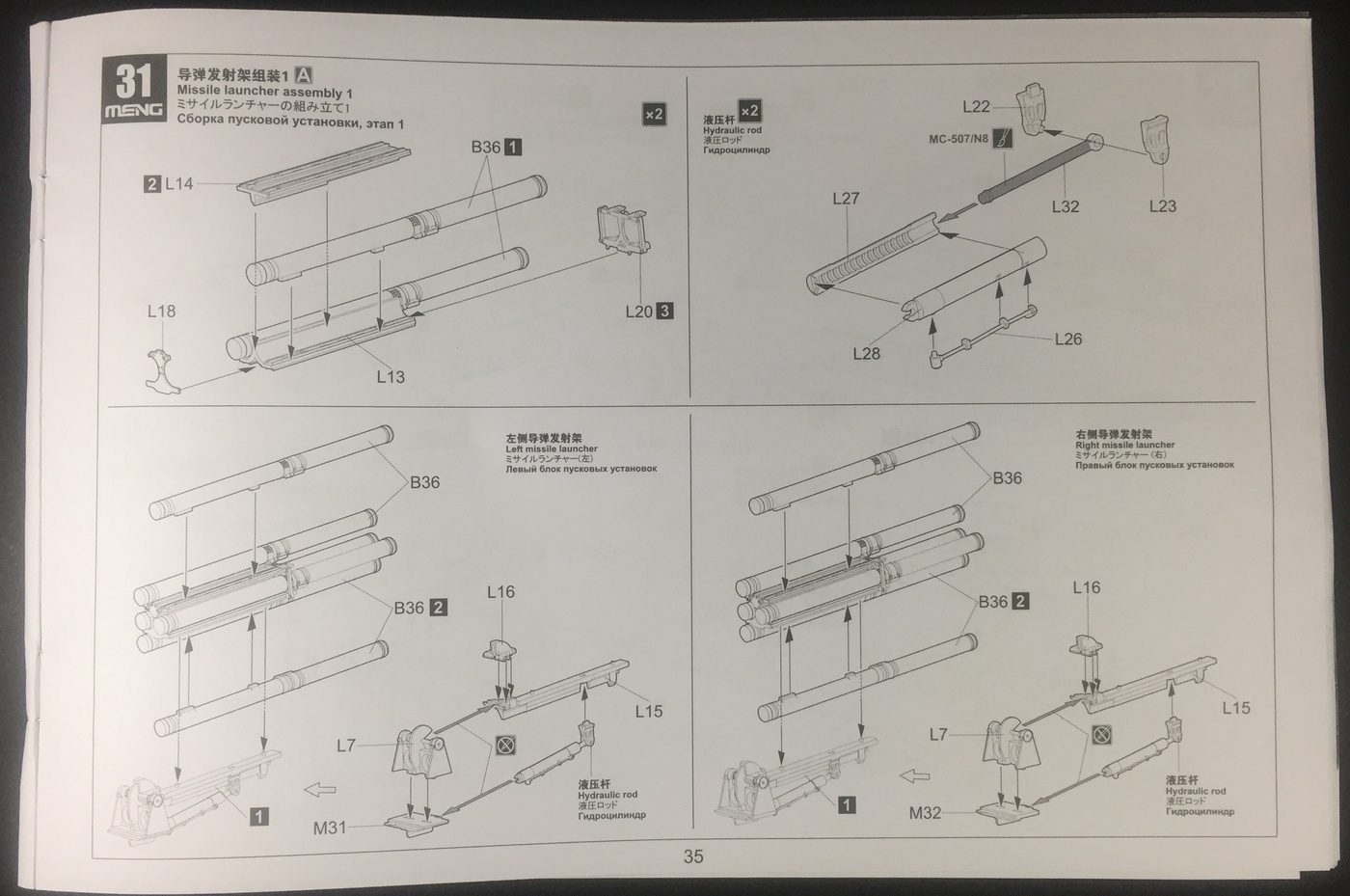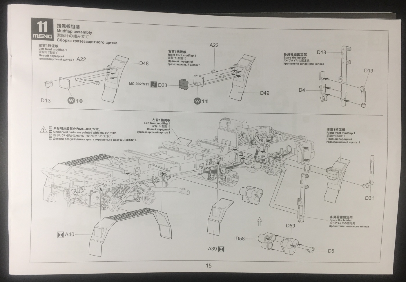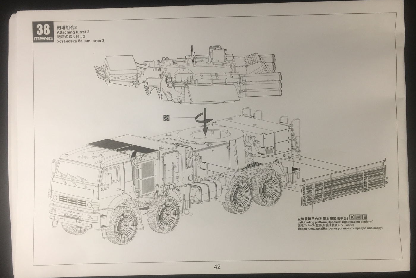 Что касается качества литья, оно на высшем уровне, как обычно у Менга, мелочевка отлита очень тщательно, смещения пресс-форм и облоя нет практически. Конечно, детали все равно приходится зачищать и обрабатывать, но по минимуму. Стыкуемость (на момент написания я уже собрал его наполовину) идеальная, щелей нет, все встает на свои места как родное. Процесс сборки довольно простой, вменяемо описан в инструкции. Даже путаницы с шестью опциями почти не возникает - но чтобы ее не возникало, инструкцию следует изучить внимательно заранее, и вычеркнуть все ненужные этапы! Инструкция толщиной примерно как Война и Мир, 44 страницы + 6 цветных отдельной вкладкой.