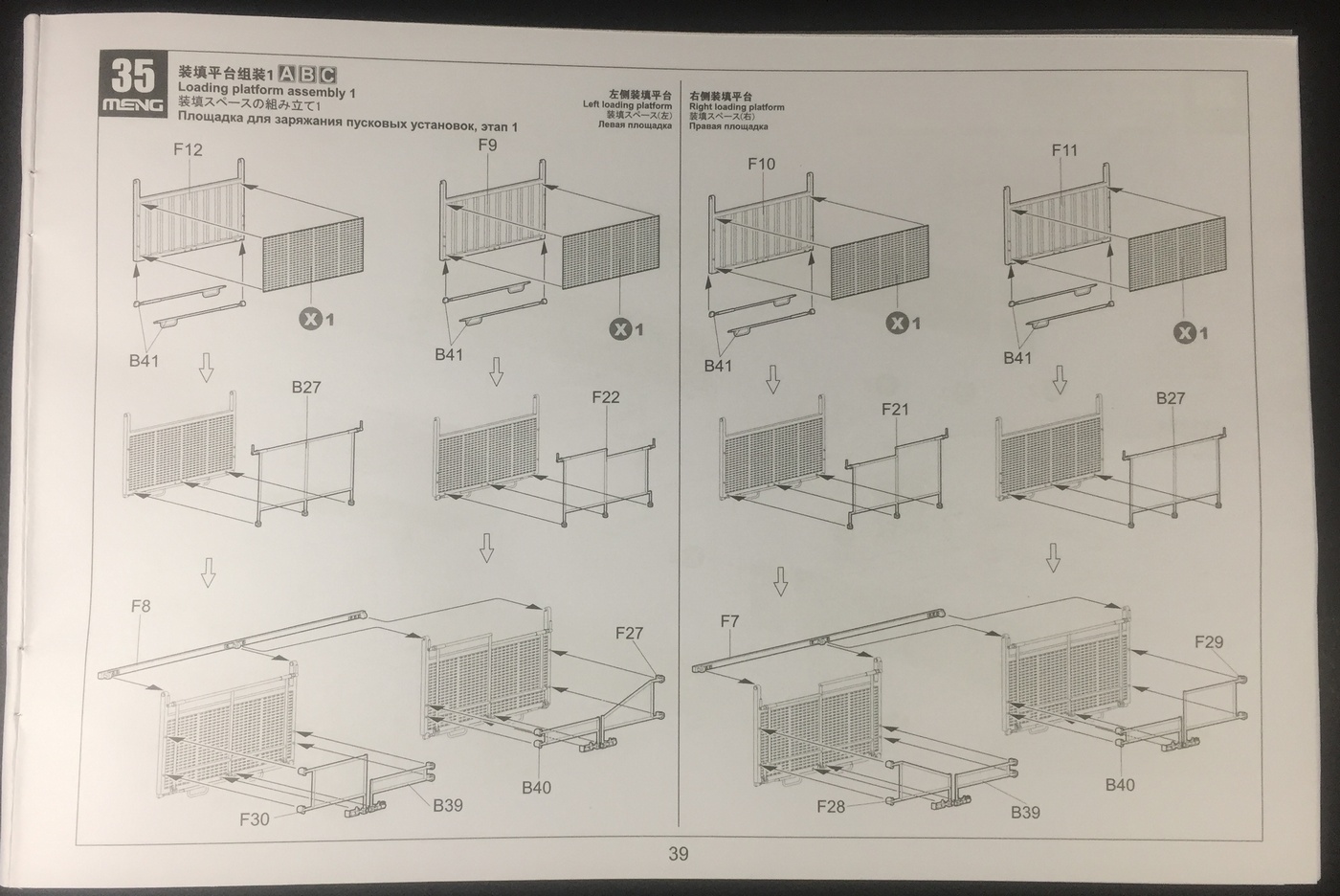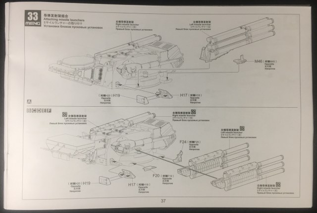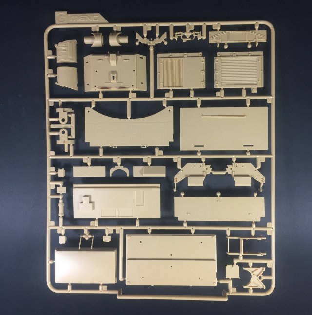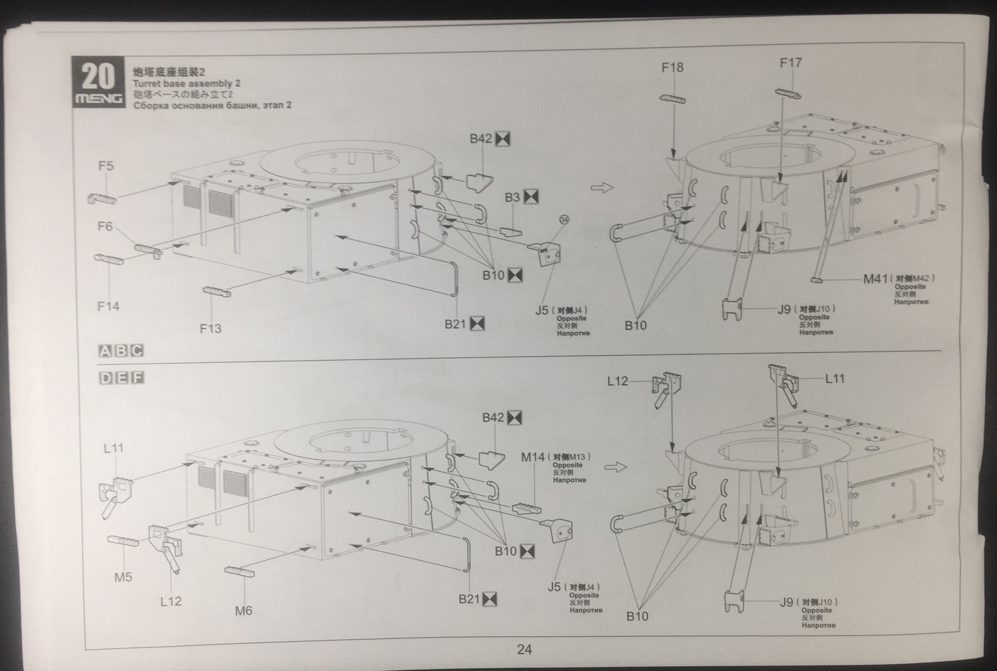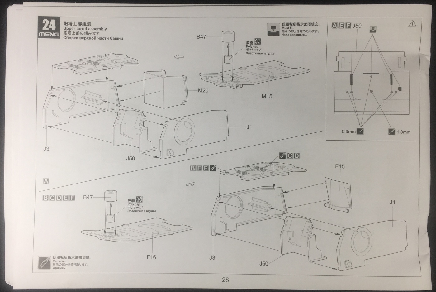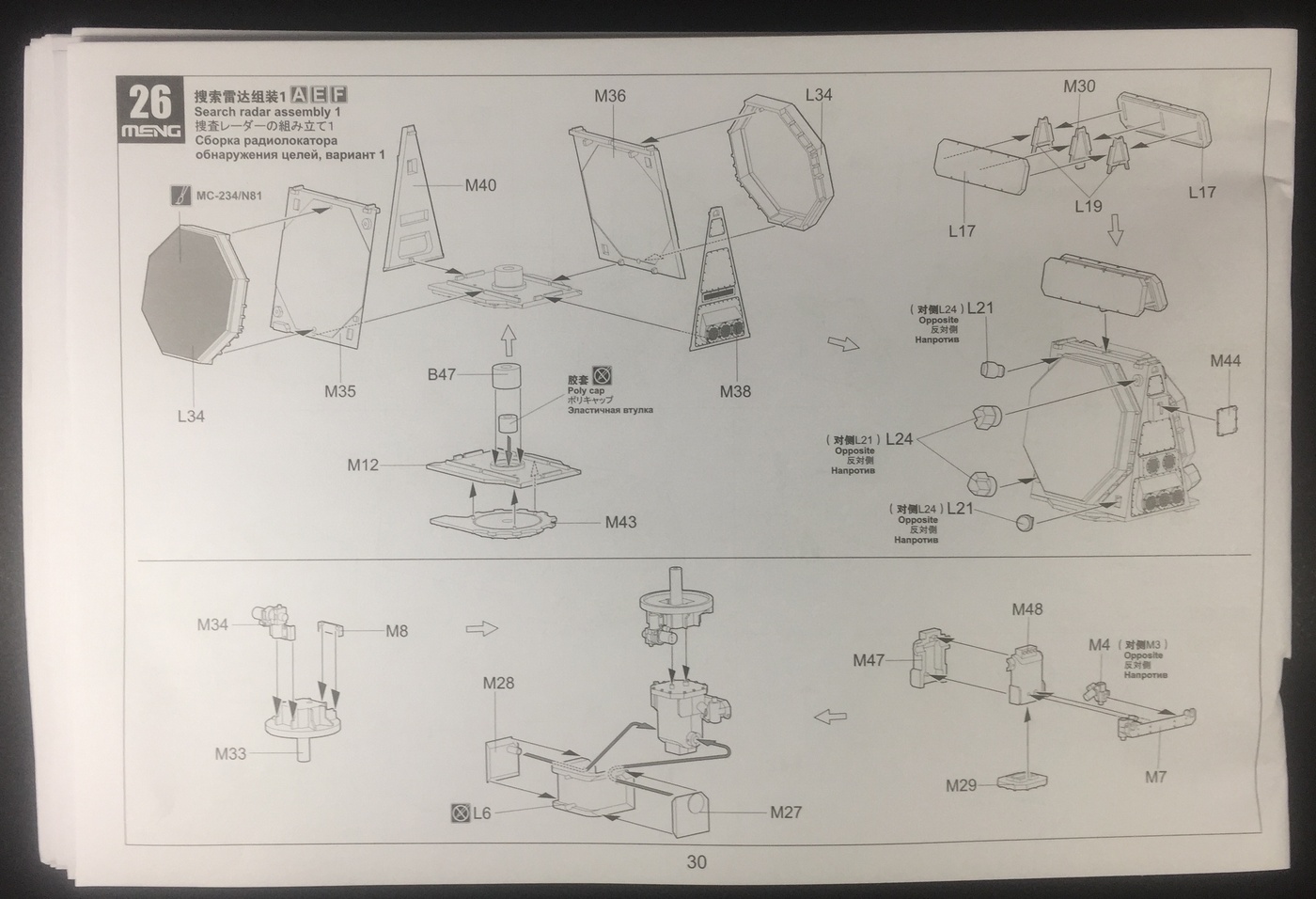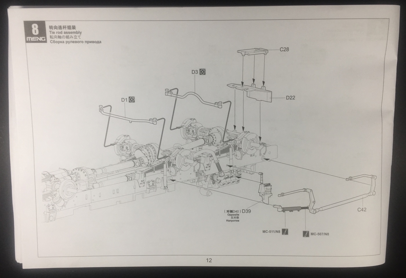 Что касается качества литья, оно на высшем уровне, как обычно у Менга, мелочевка отлита очень тщательно, смещения пресс-форм и облоя нет практически. Конечно, детали все равно приходится зачищать и обрабатывать, но по минимуму. Стыкуемость (на момент написания я уже собрал его наполовину) идеальная, щелей нет, все встает на свои места как родное. Процесс сборки довольно простой, вменяемо описан в инструкции. Даже путаницы с шестью опциями почти не возникает - но чтобы ее не возникало, инструкцию следует изучить внимательно заранее, и вычеркнуть все ненужные этапы! Инструкция толщиной примерно как Война и Мир, 44 страницы + 6 цветных отдельной вкладкой.