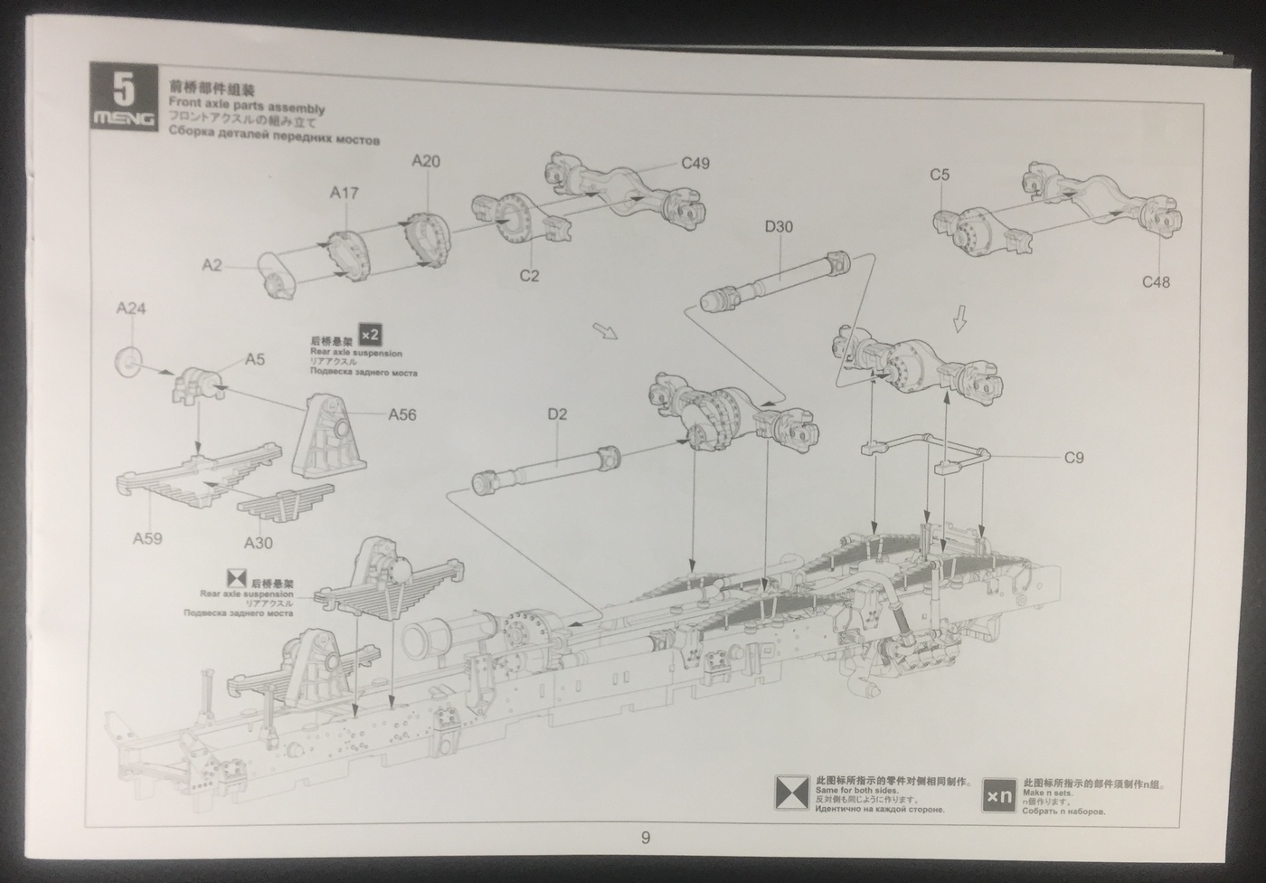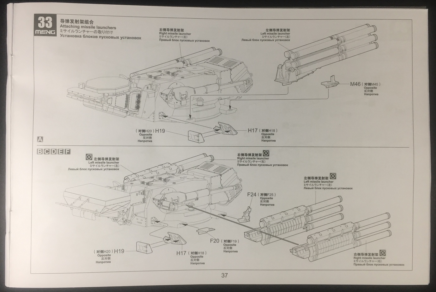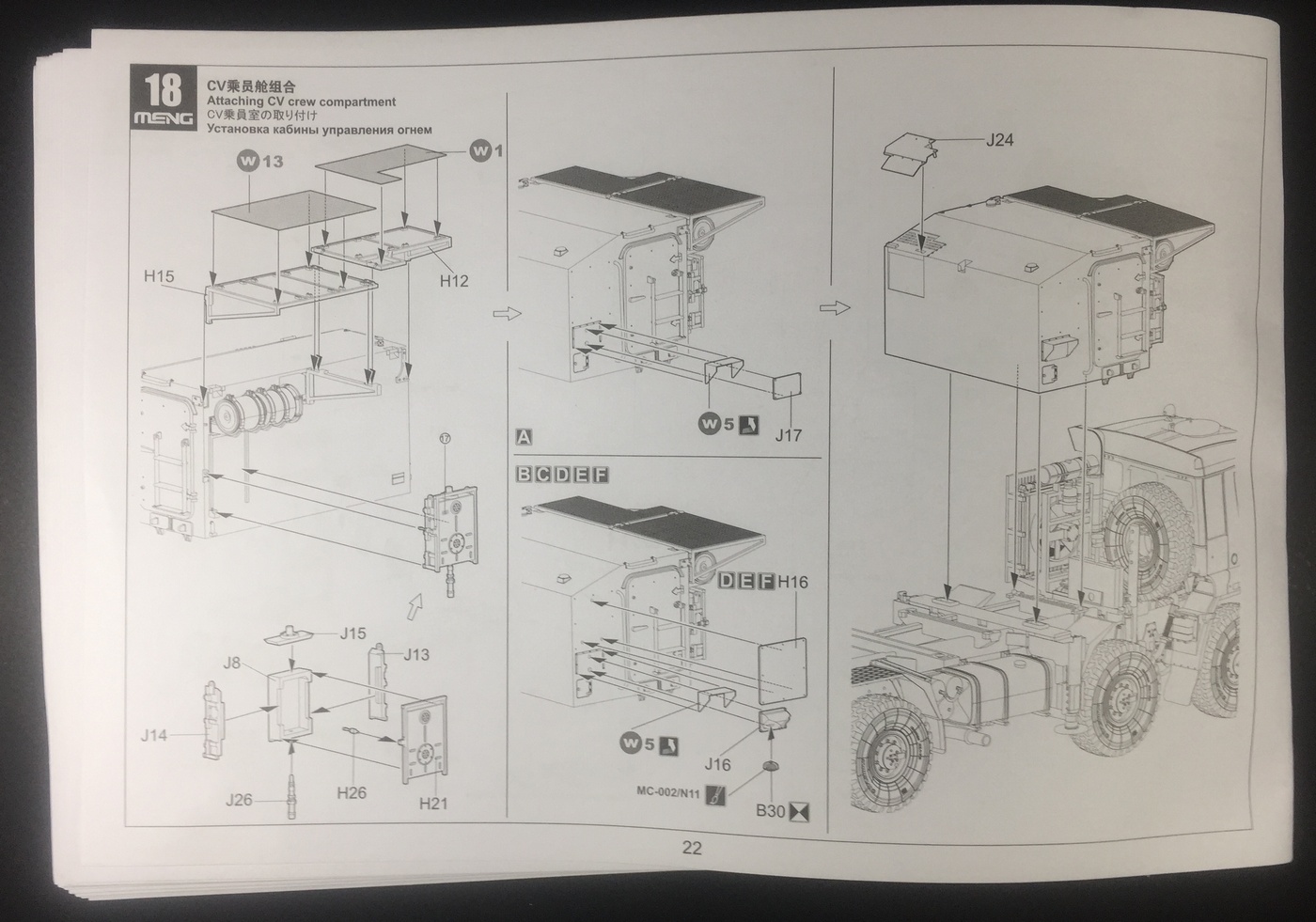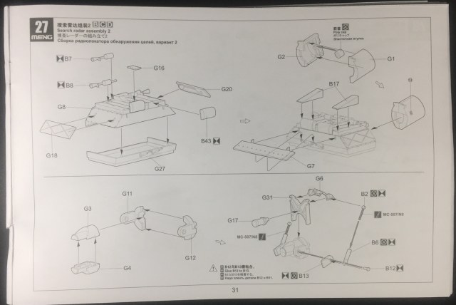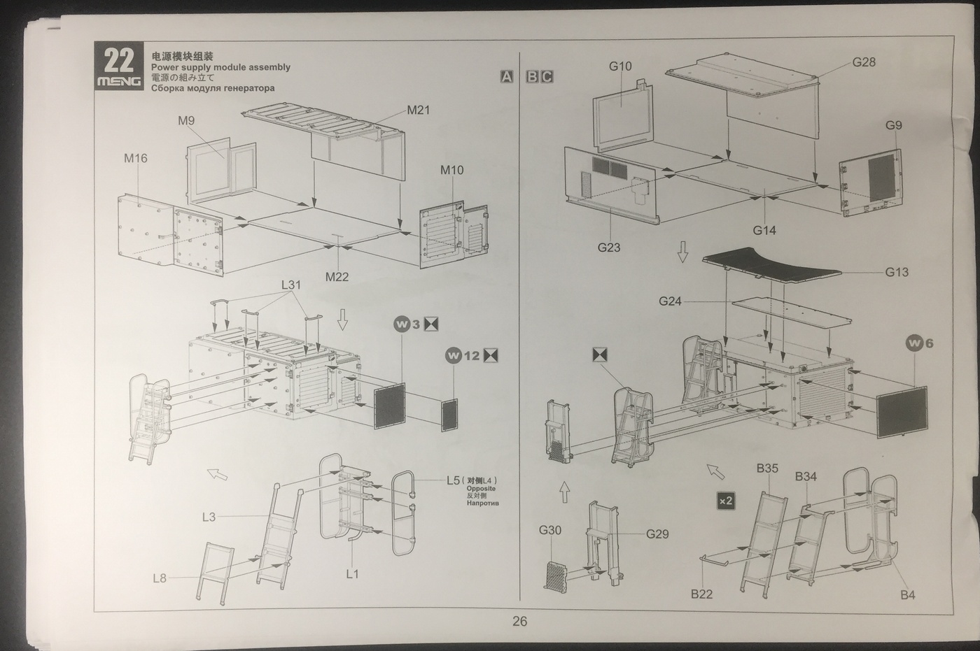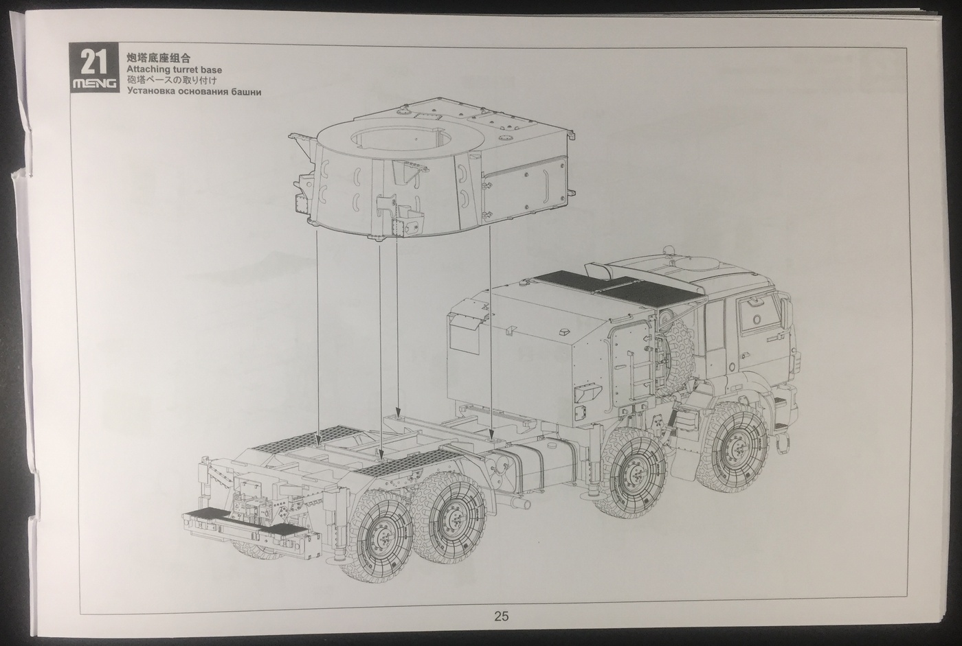 Что касается качества литья, оно на высшем уровне, как обычно у Менга, мелочевка отлита очень тщательно, смещения пресс-форм и облоя нет практически. Конечно, детали все равно приходится зачищать и обрабатывать, но по минимуму. Стыкуемость (на момент написания я уже собрал его наполовину) идеальная, щелей нет, все встает на свои места как родное. Процесс сборки довольно простой, вменяемо описан в инструкции. Даже путаницы с шестью опциями почти не возникает - но чтобы ее не возникало, инструкцию следует изучить внимательно заранее, и вычеркнуть все ненужные этапы! Инструкция толщиной примерно как Война и Мир, 44 страницы + 6 цветных отдельной вкладкой.