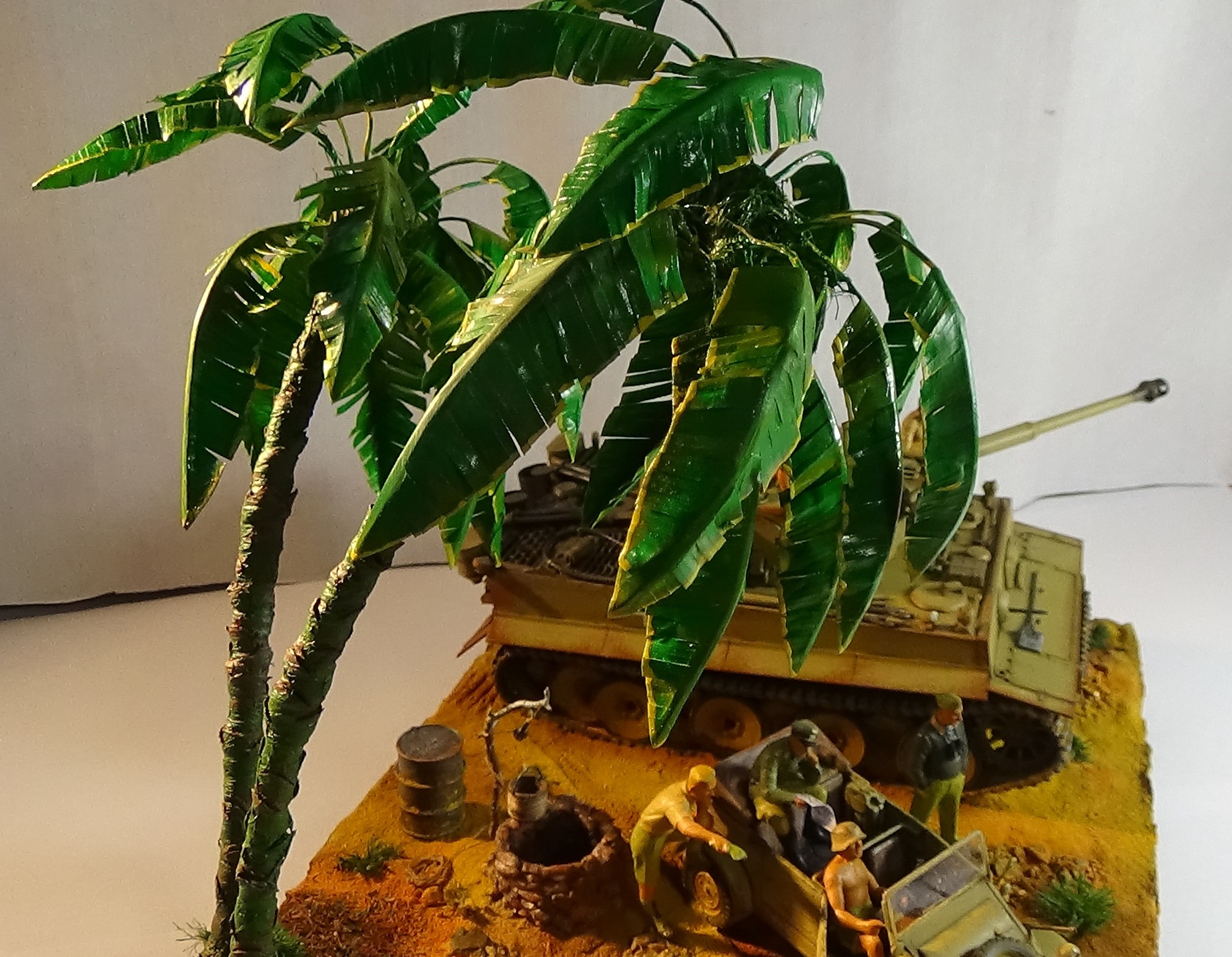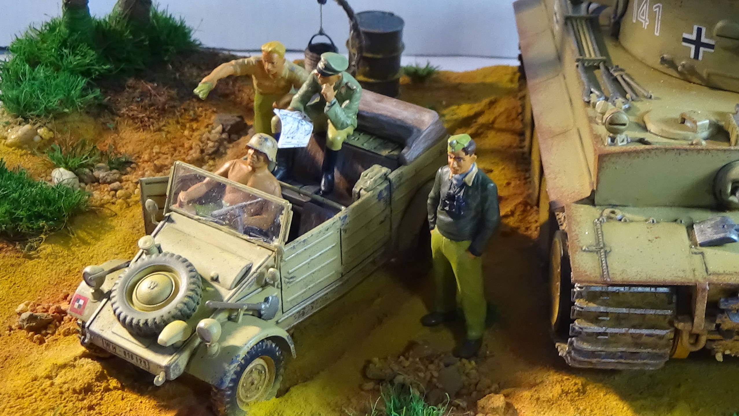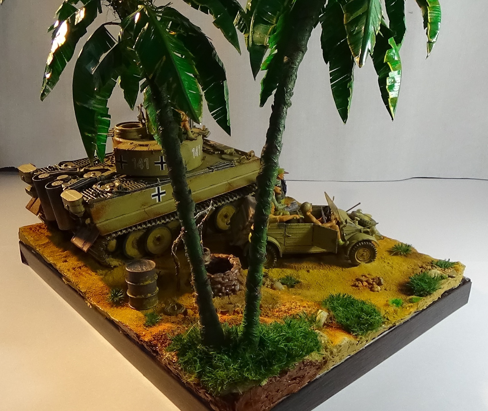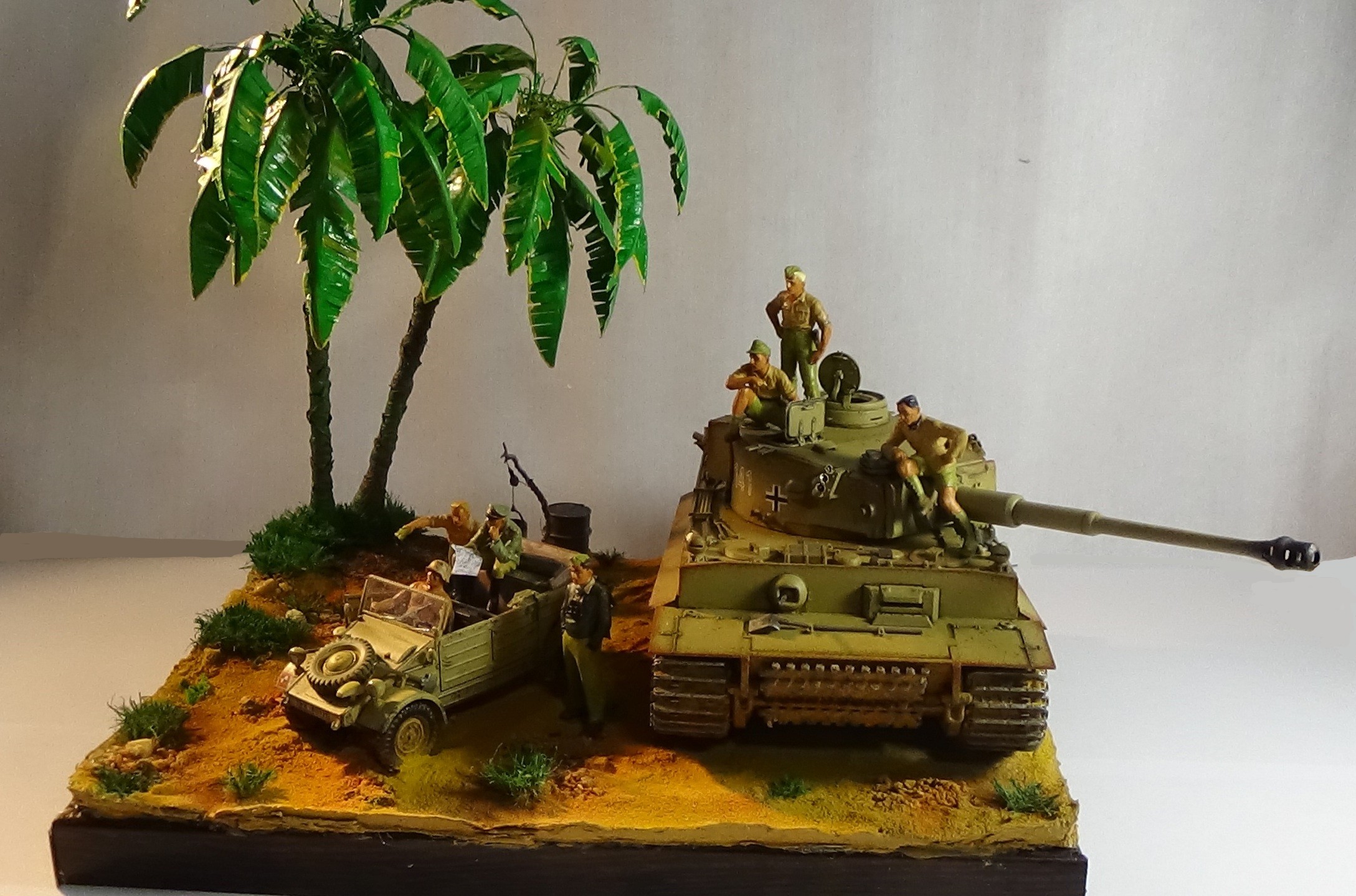 Т-VI - ЗВЕЗДА; Кубельваген от MODELIST; Фигуры Master Box (MB) Грунт выполнен из сеянного песка, тертая кора дуба, чай, камешки для аквариума; пальмы - планки от литников, сантех. лен, листья бумажные. Краски: акрил от МАСТЕР АКРИЛ ЗВЕЗДА, Vallejo, Tamya, Pacific 88 Пигменты от ZIP MAKET