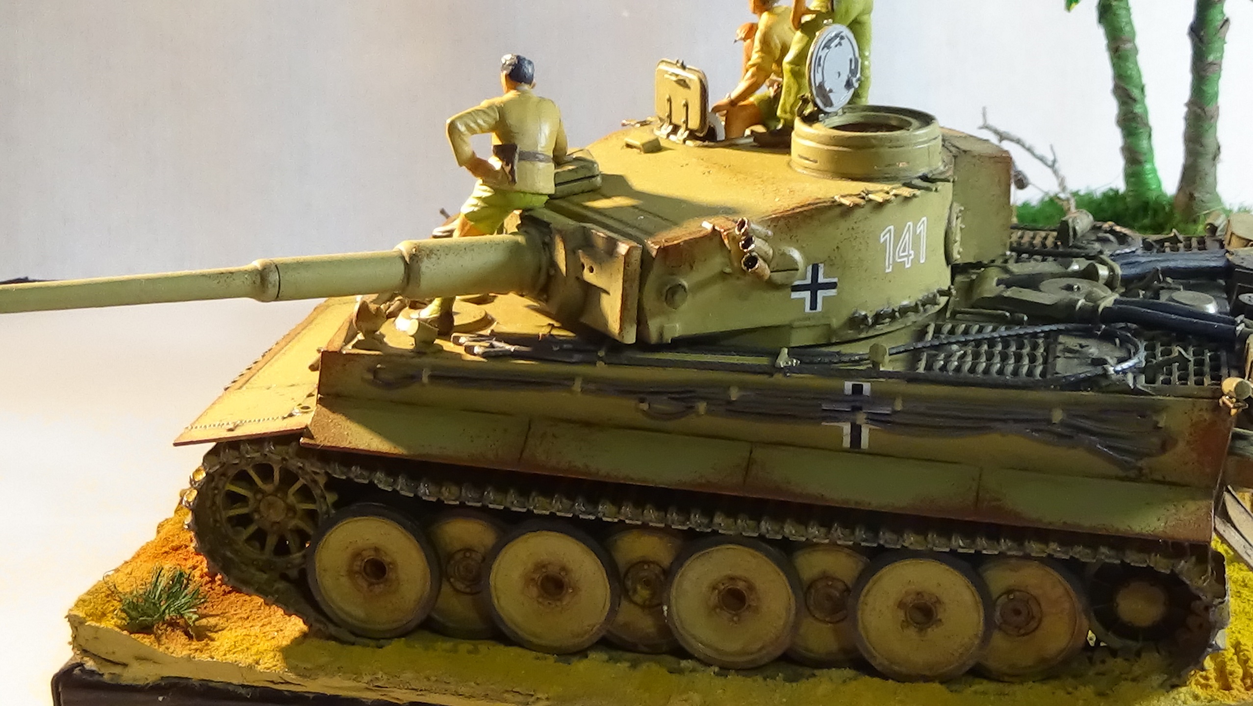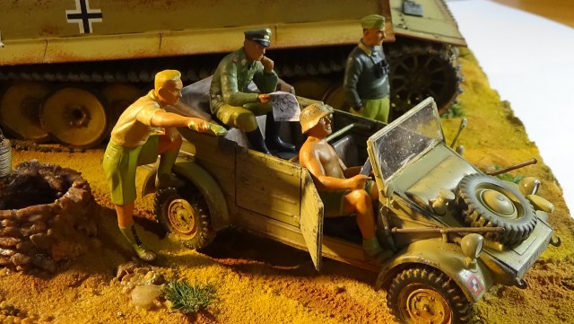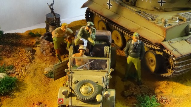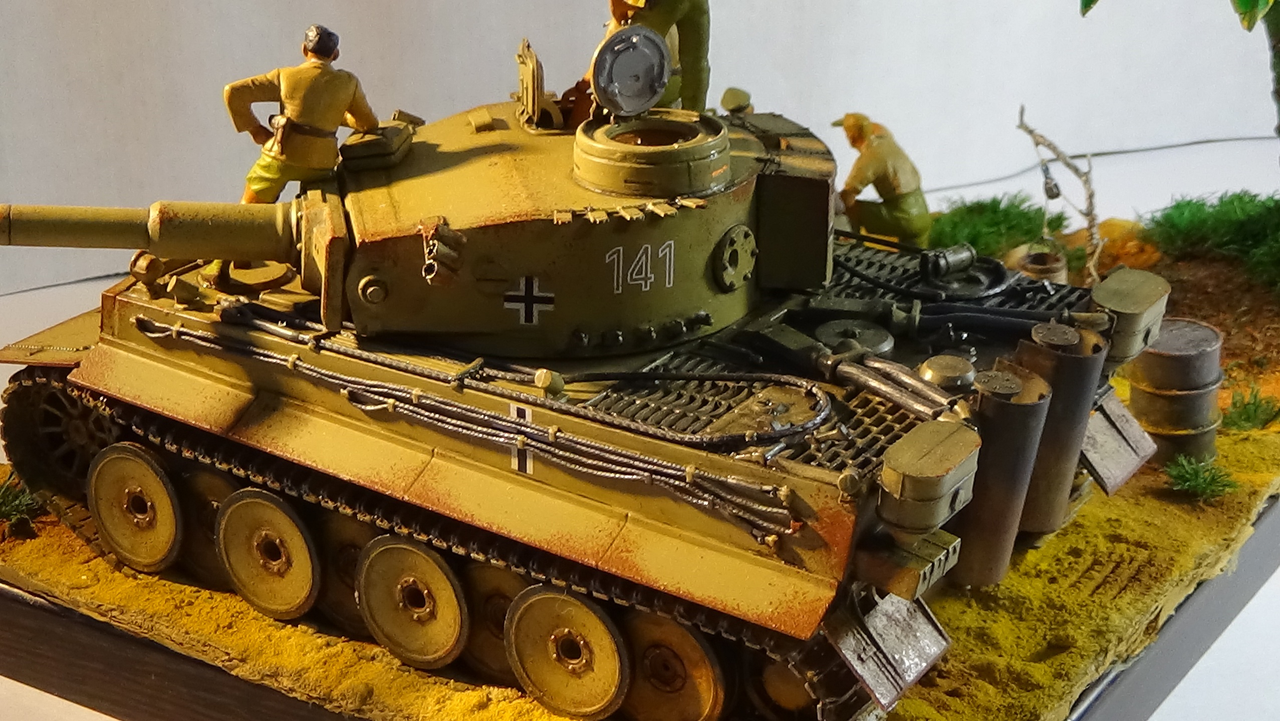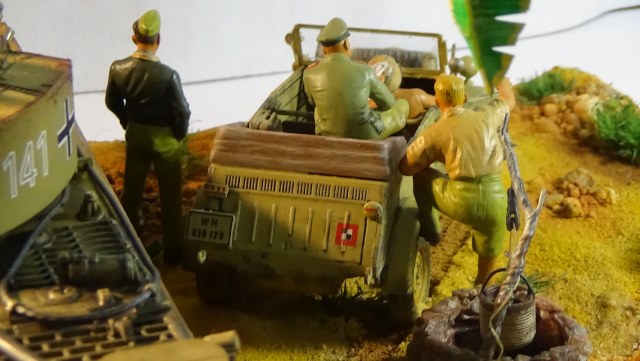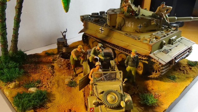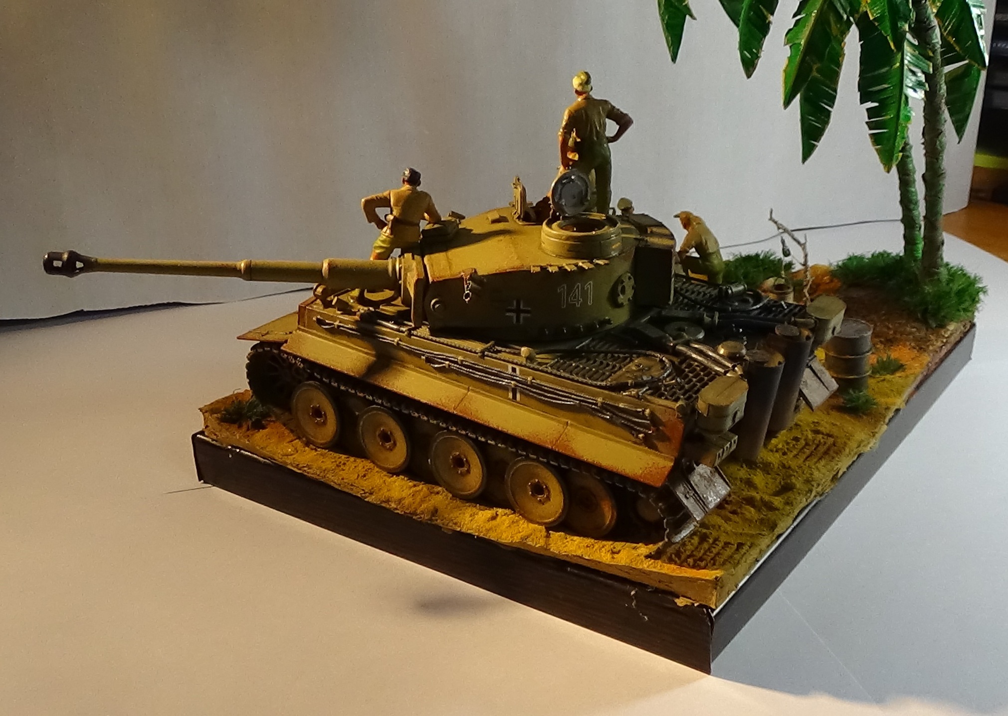 Т-VI - ЗВЕЗДА; Кубельваген от MODELIST; Фигуры Master Box (MB) Грунт выполнен из сеянного песка, тертая кора дуба, чай, камешки для аквариума; пальмы - планки от литников, сантех. лен, листья бумажные. Краски: акрил от МАСТЕР АКРИЛ ЗВЕЗДА, Vallejo, Tamya, Pacific 88 Пигменты от ZIP MAKET