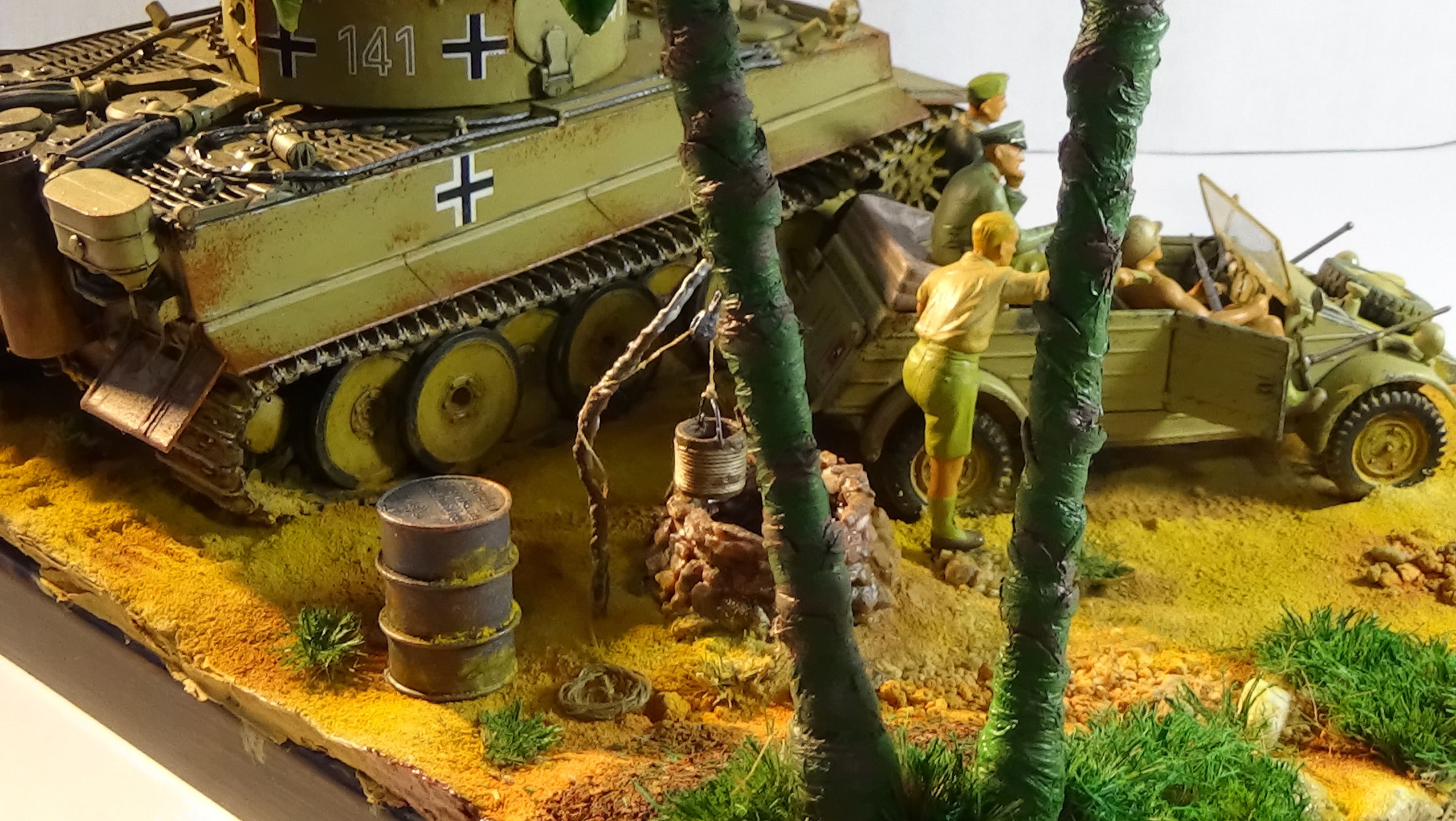 Идея - очень хорошая. Колодец только по композиции немного отодвинуть от танка ближе к пальме и немного вперёд- а то всё на диораме- к танку "липнет".