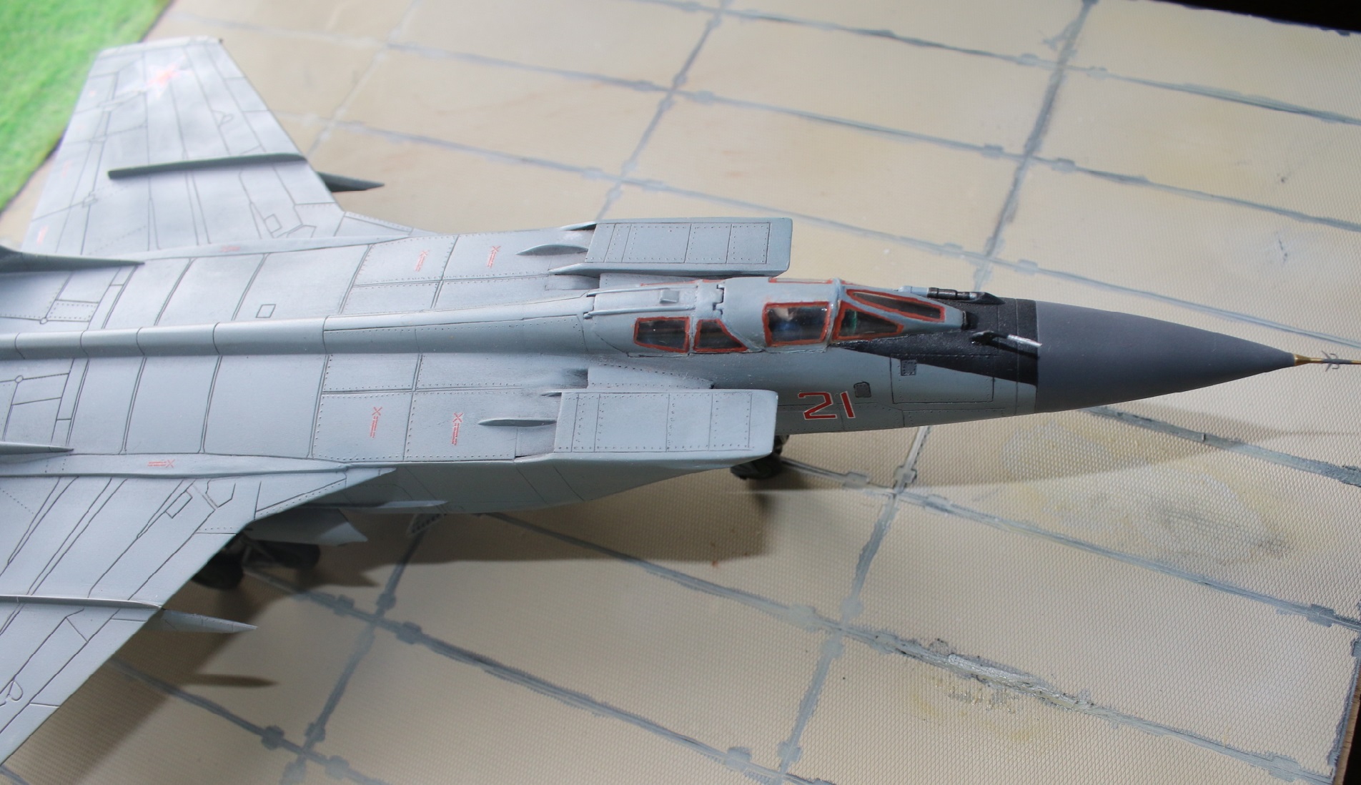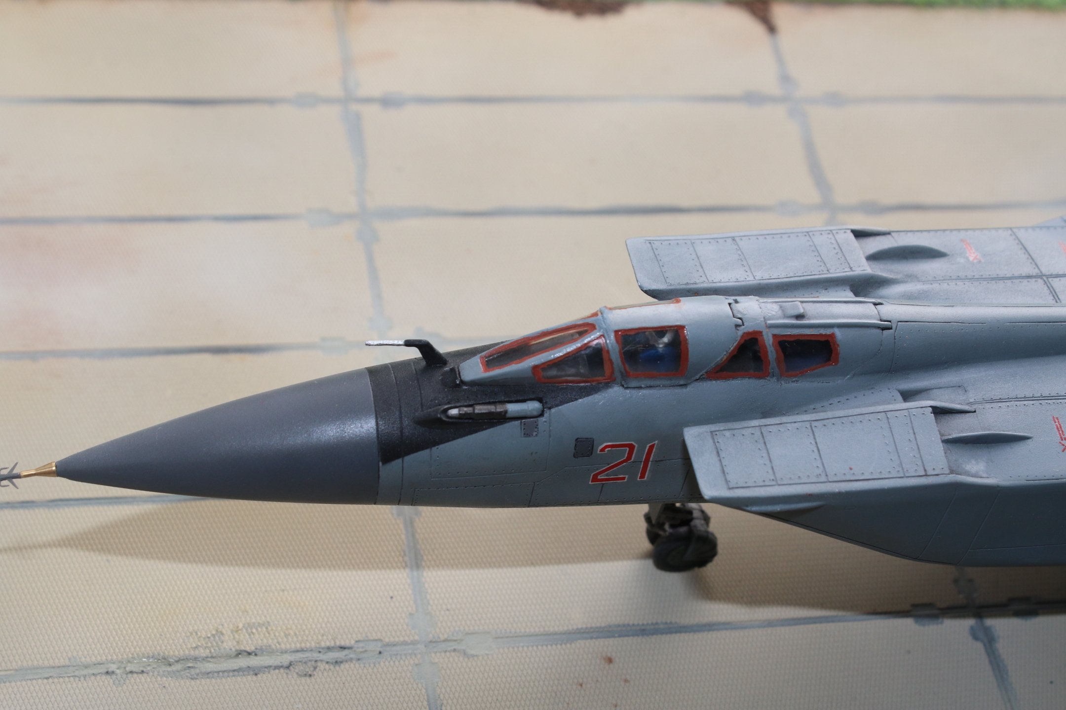 Ну еще можно основной ПВД покрасить в цвет фюзеляжа, а наплывы на ВЗ в цвет радиопрозрачных панелей либо полностью (как на строевых машинах) либо частично (как на экспонате в Монино).