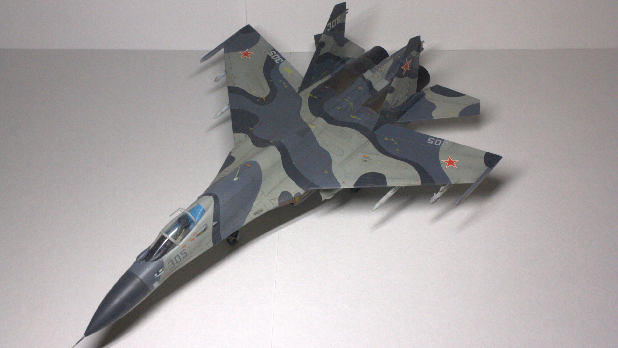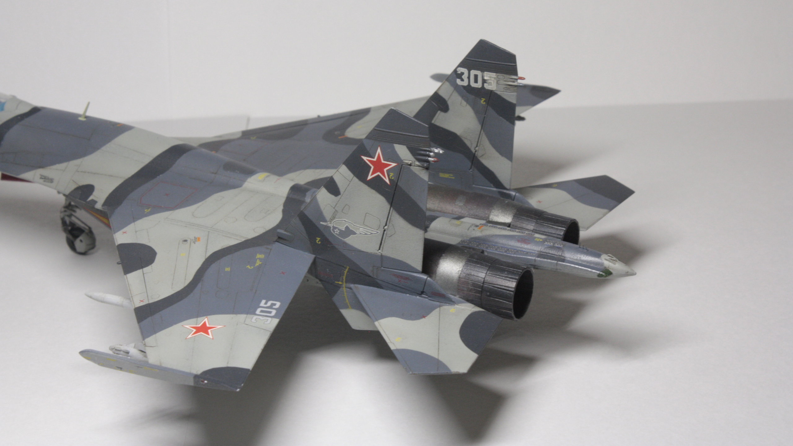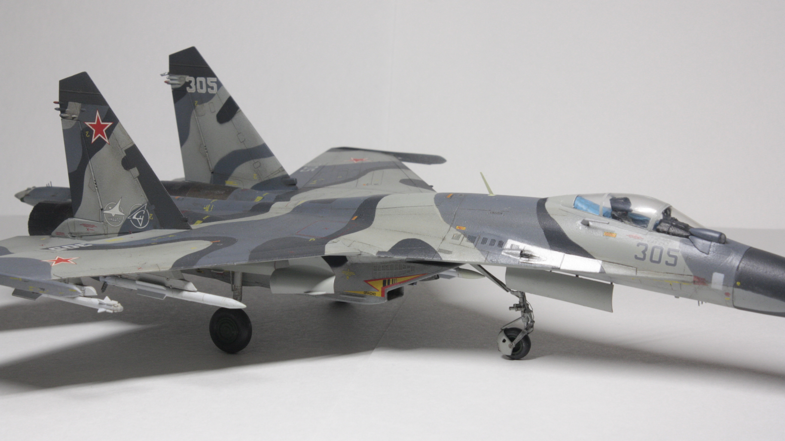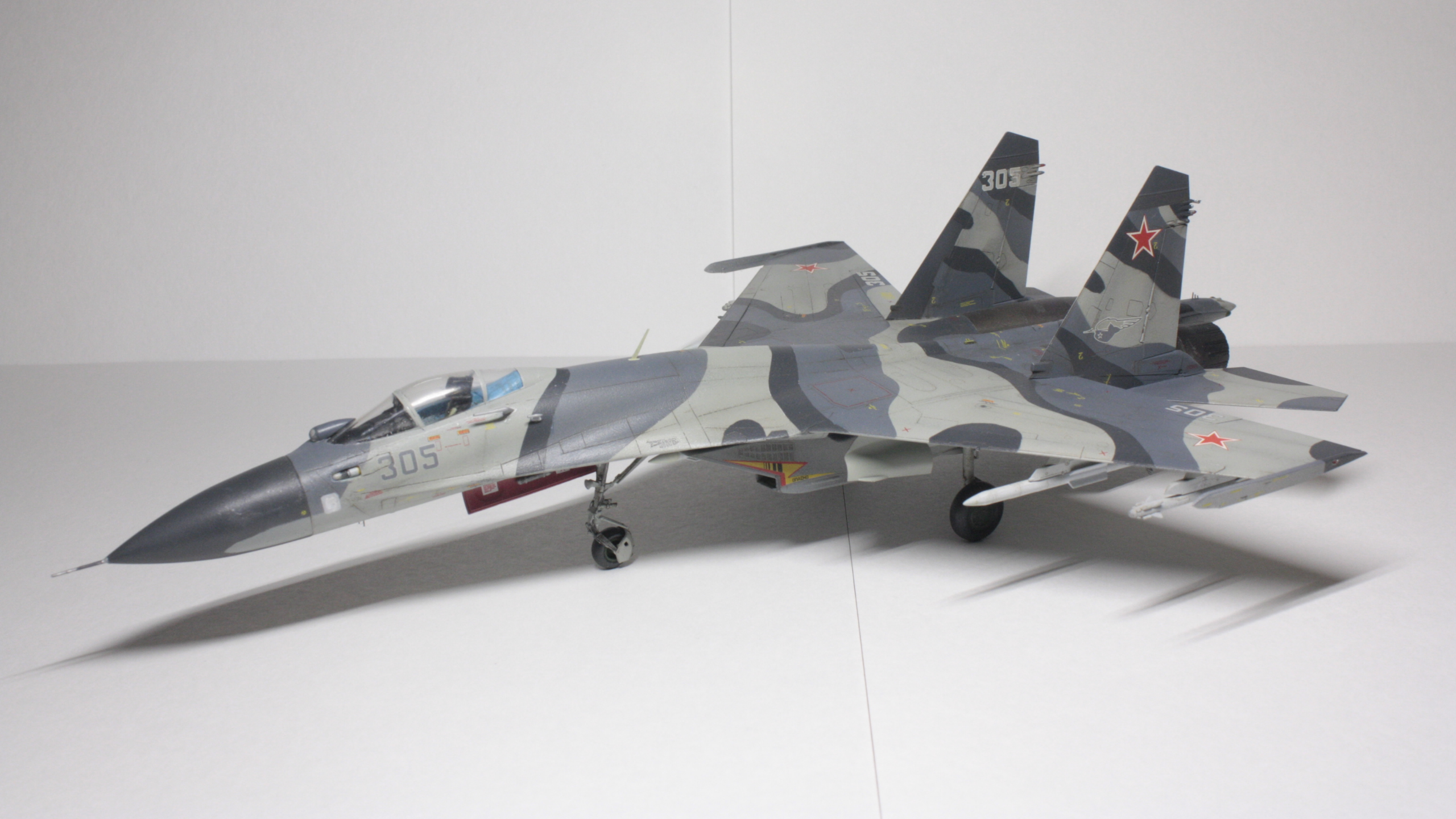Су-27СМ, борт 305, 1/72. Довольно долгая стройка с большим перерывом, хоть и далеко от идеала, но на сегодняшний день самое трудоемкое, что я сделал (: Травление Микродизайн в основном пошло на решетки и кокпит. Декали от Бегемота оказались очень кстати при покраске этого борта, однако там не хватило желтых маркировок угла поворота рулей высоты (в коробочной техничке они красные). Ситуацию спасли сэкономленные с незапамятных времен остатки технички от старой модели звезды, в которых эти маркировки оказались нужного желтого цвета. Красил всем подряд: ганзой, тамией, вальехой. Декали клал на тамиевский маркфит, результатом остался доволен: после задувки матовым лаком все выглядит как влитое. Не удалось нормально передать шланги и провода, пока это первый опыт использования проволоки, так же остался не очень доволен качеством задувки двигателей: получилось слишком темно, местами с шагренью, потерялся характерный пепельный нагар на внутренних частях сопла.
