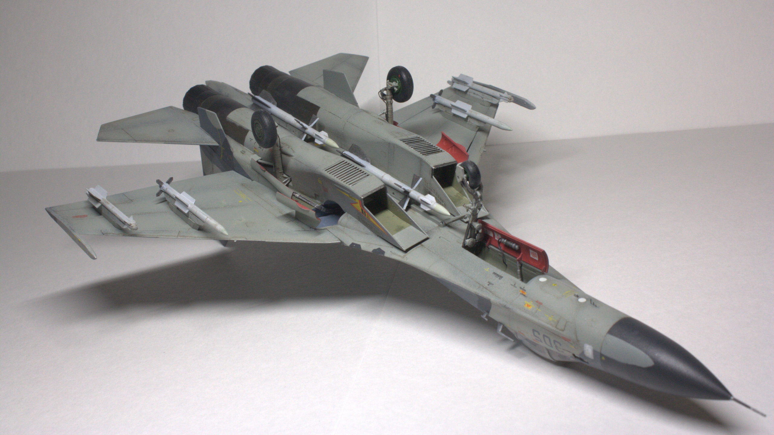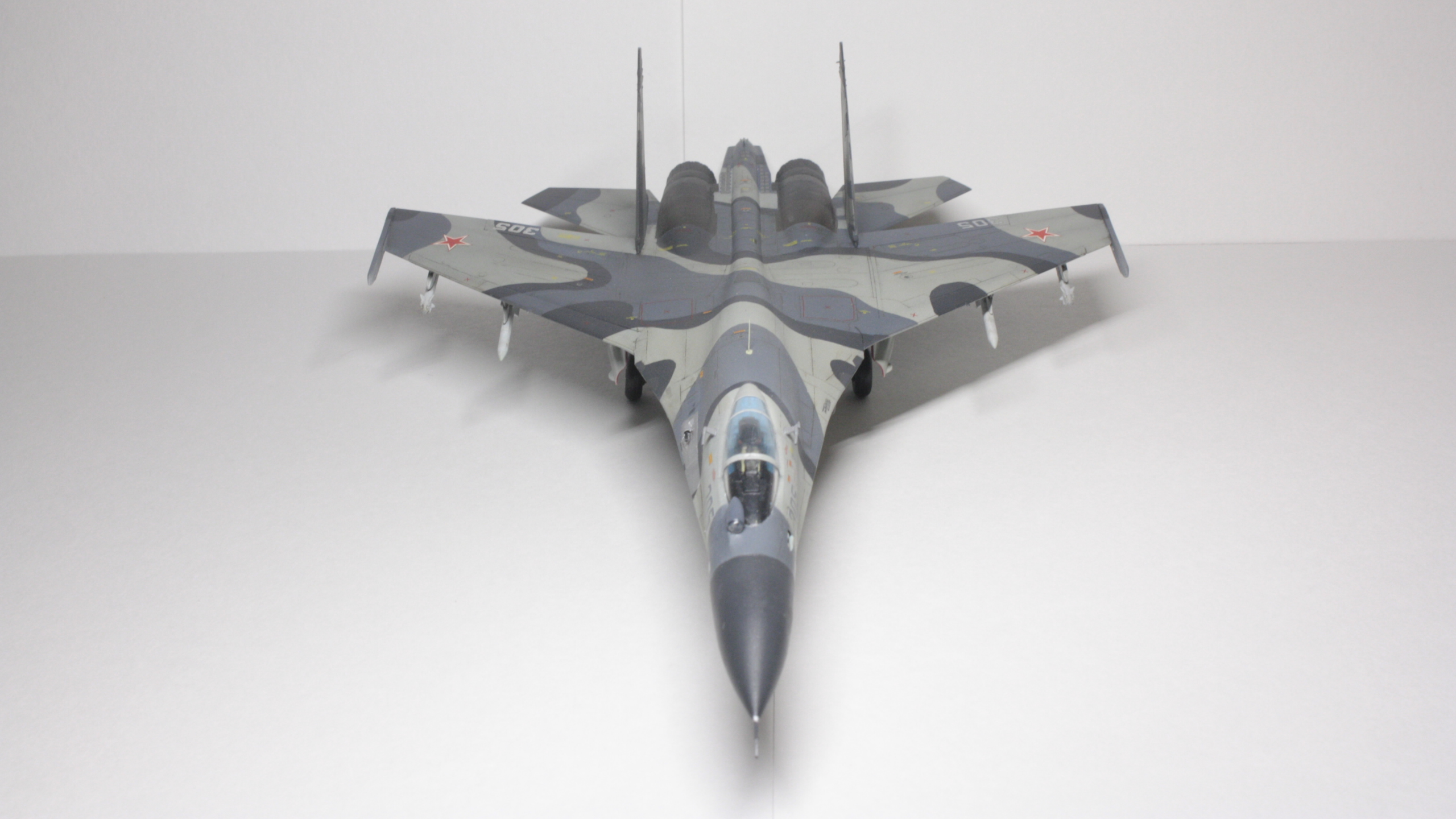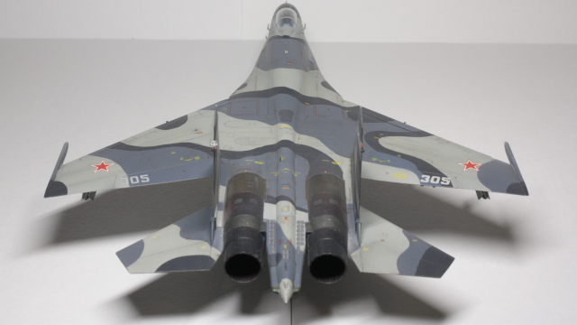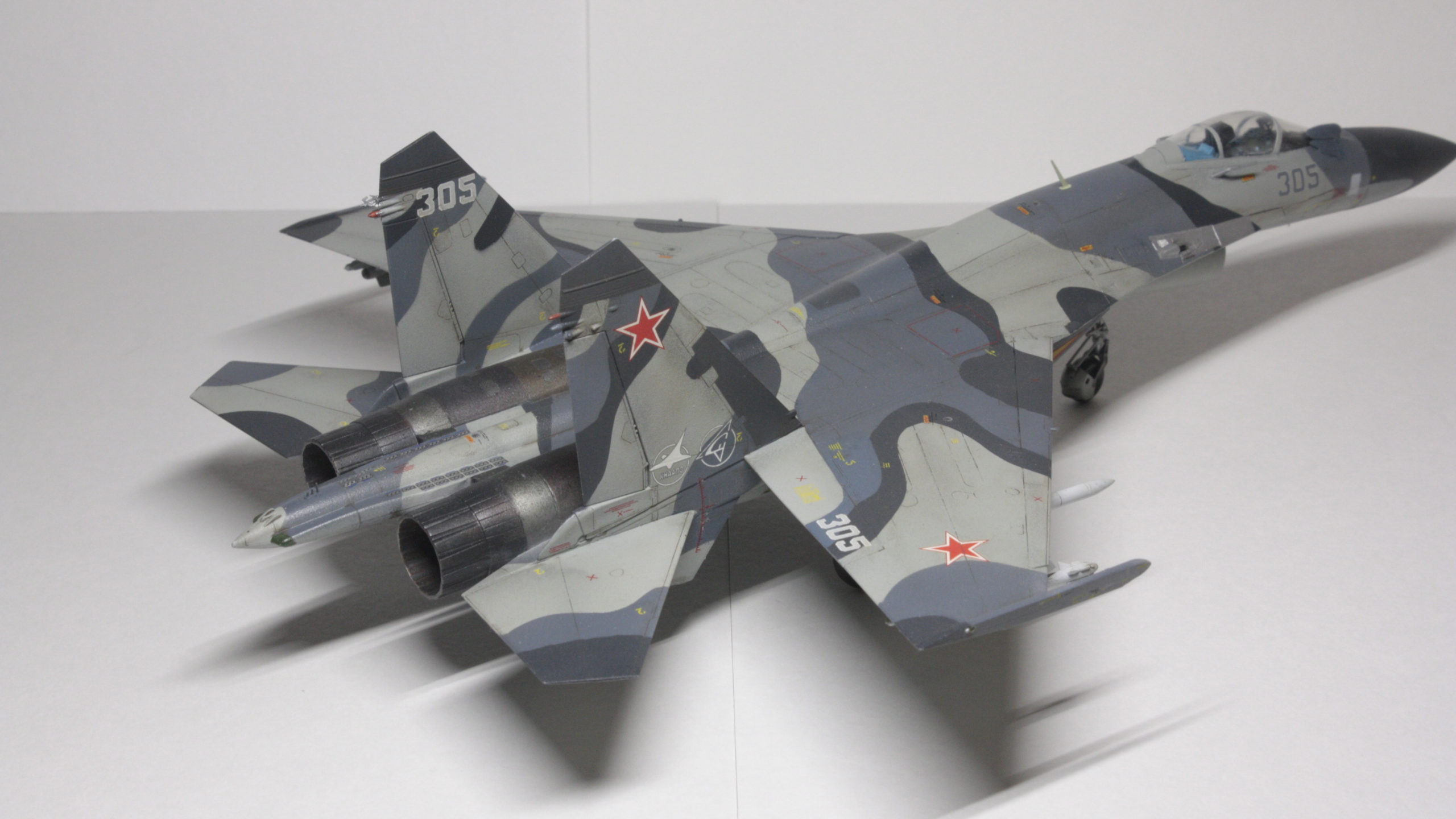 Су-27СМ, борт 305, 1/72. Довольно долгая стройка с большим перерывом, хоть и далеко от идеала, но на сегодняшний день самое трудоемкое, что я сделал (: Травление Микродизайн в основном пошло на решетки и кокпит. Декали от Бегемота оказались очень кстати при покраске этого борта, однако там не хватило желтых маркировок угла поворота рулей высоты (в коробочной техничке они красные). Ситуацию спасли сэкономленные с незапамятных времен остатки технички от старой модели звезды, в которых эти маркировки оказались нужного желтого цвета. Красил всем подряд: ганзой, тамией, вальехой. Декали клал на тамиевский маркфит, результатом остался доволен: после задувки матовым лаком все выглядит как влитое. Не удалось нормально передать шланги и провода, пока это первый опыт использования проволоки, так же остался не очень доволен качеством задувки двигателей: получилось слишком темно, местами с шагренью, потерялся характерный пепельный нагар на внутренних частях сопла.