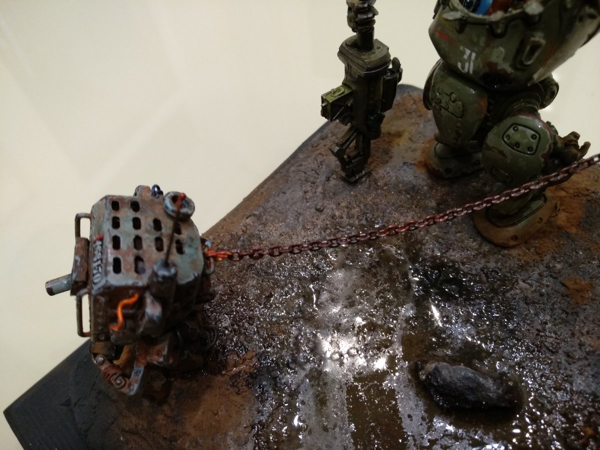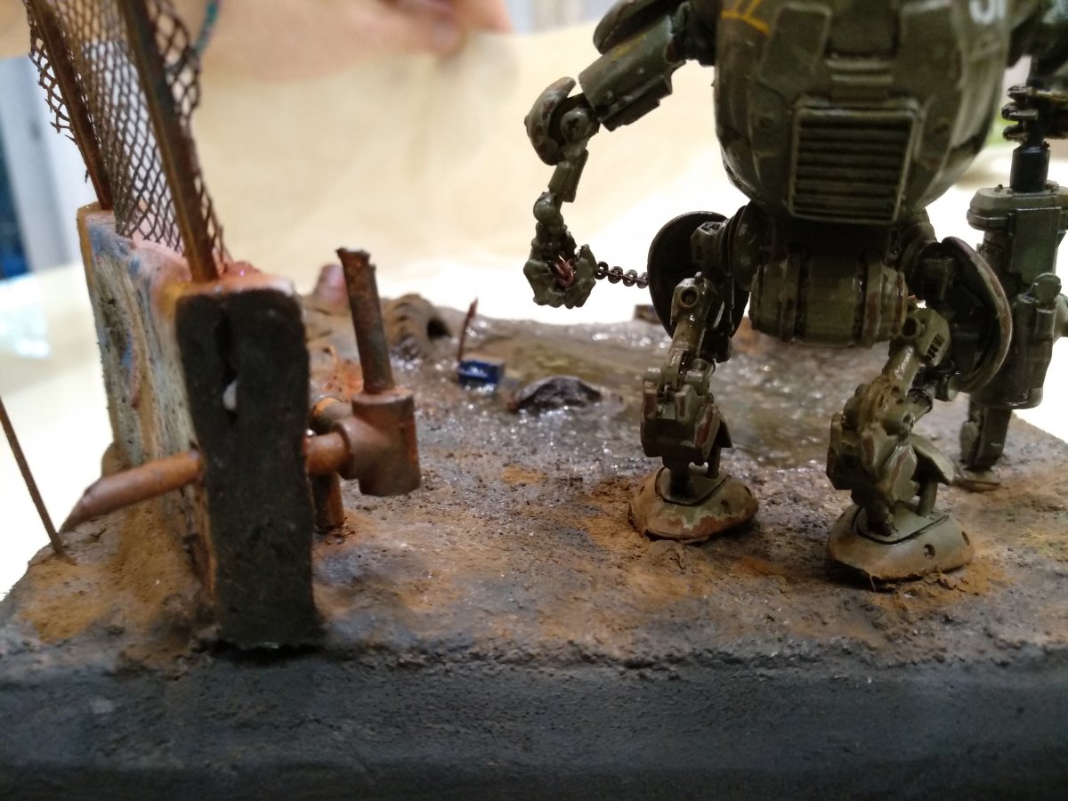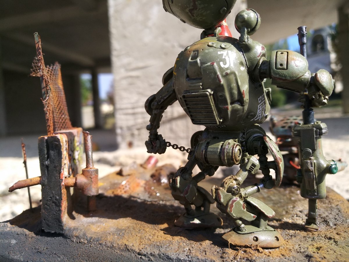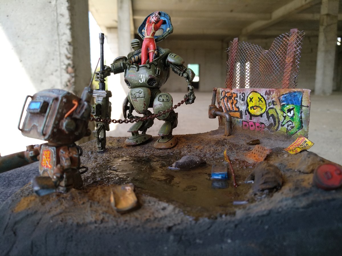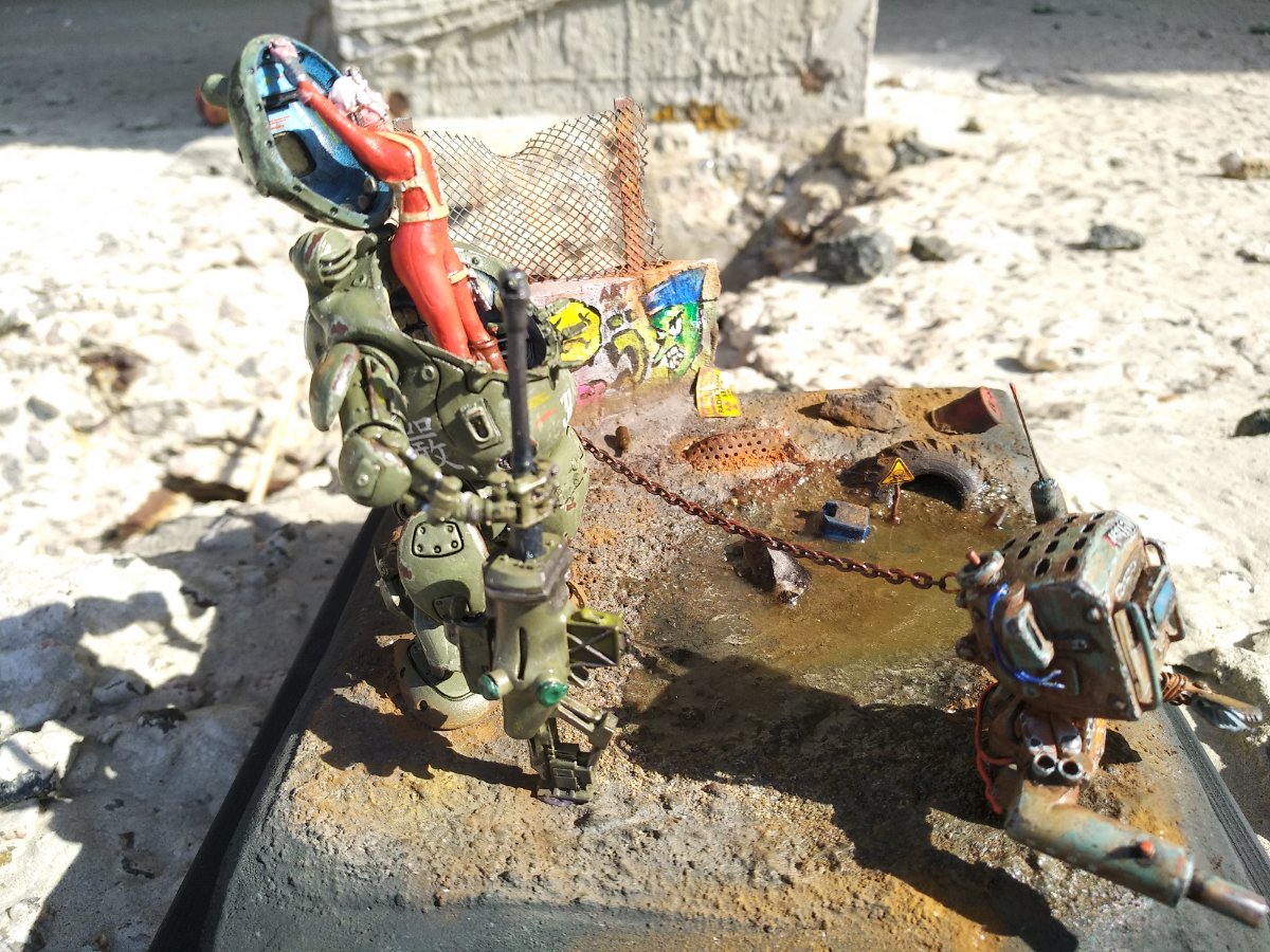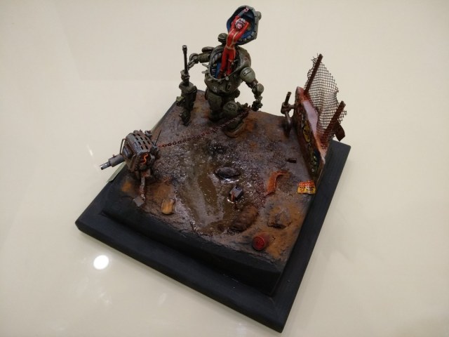 Но, даже не смотря на то, что фото с телефона, видно, что детализация окружающей действительности (учитывая, что это 35-й масштаб) выполнена, по-моему, на 5 с плюсом...., в отличие от самой "космонавтки" (очень понравилась покрышка, полу-утонувшая в радиоактивной грязи)..... А вот фигурка девушки как будто в 50-м масштабе.... для 35-го масштаба,не доработана, на мой взгляд, как будто Александр спешил её побыстрее доделать, думая о деталях окружающих, и амуниции и деталях шагающего танка и робота-"собаки"..... а ведь самый страшный зверь, и самый красивый хищник - это человеческая женщина.....