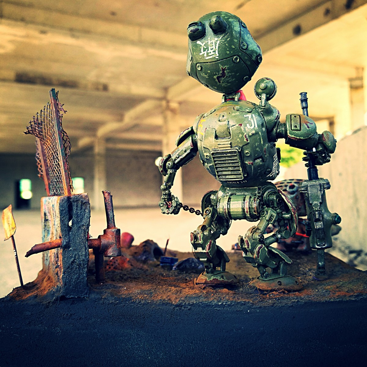 В работе использовано: китайская смоляная фигура неизвестного производителя, куплена в интернете в пакетиках без документации(качество среднее) масштаб 1/35 - пилотируемый бронированный шагающий модуль, вооруженный винтовкой с цифровым оптическим прицелом. Не густо, но все что осталось после "Большого Восточного Противостояния"...