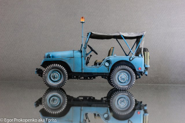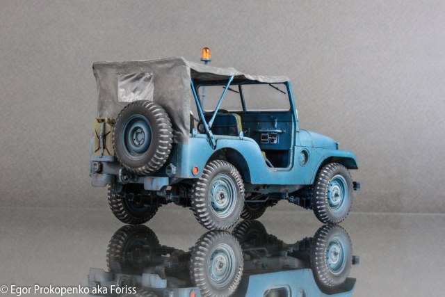 Сам набор, насколько я знаю безальтернативен, производится только фирмой AFVClub. Набор не плохой, хорошо детализирован, но все равно чувствуются отличия от современных наборов. По возможности доработал – добавил остатки травления от других наборов, где-то родное заменил на проволоку, добавил самодельный брезент, смастерил некий шест для мигалки. Родные колеса были повреждены, поэтому заменил колеса от тамиевского м151, реальные колеса подходят и легко встают на место, в сети можно встретить не одно фото подтверждение тому.