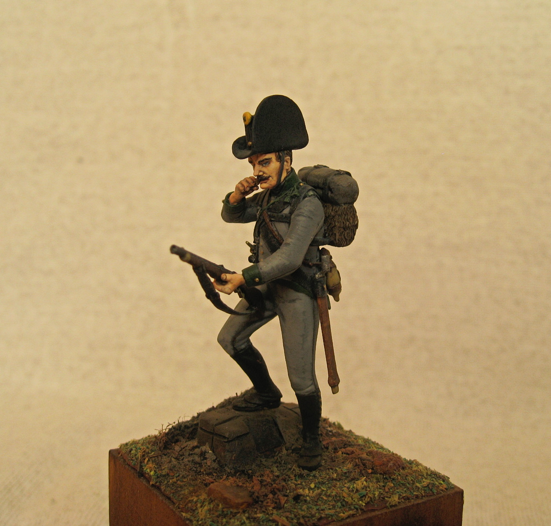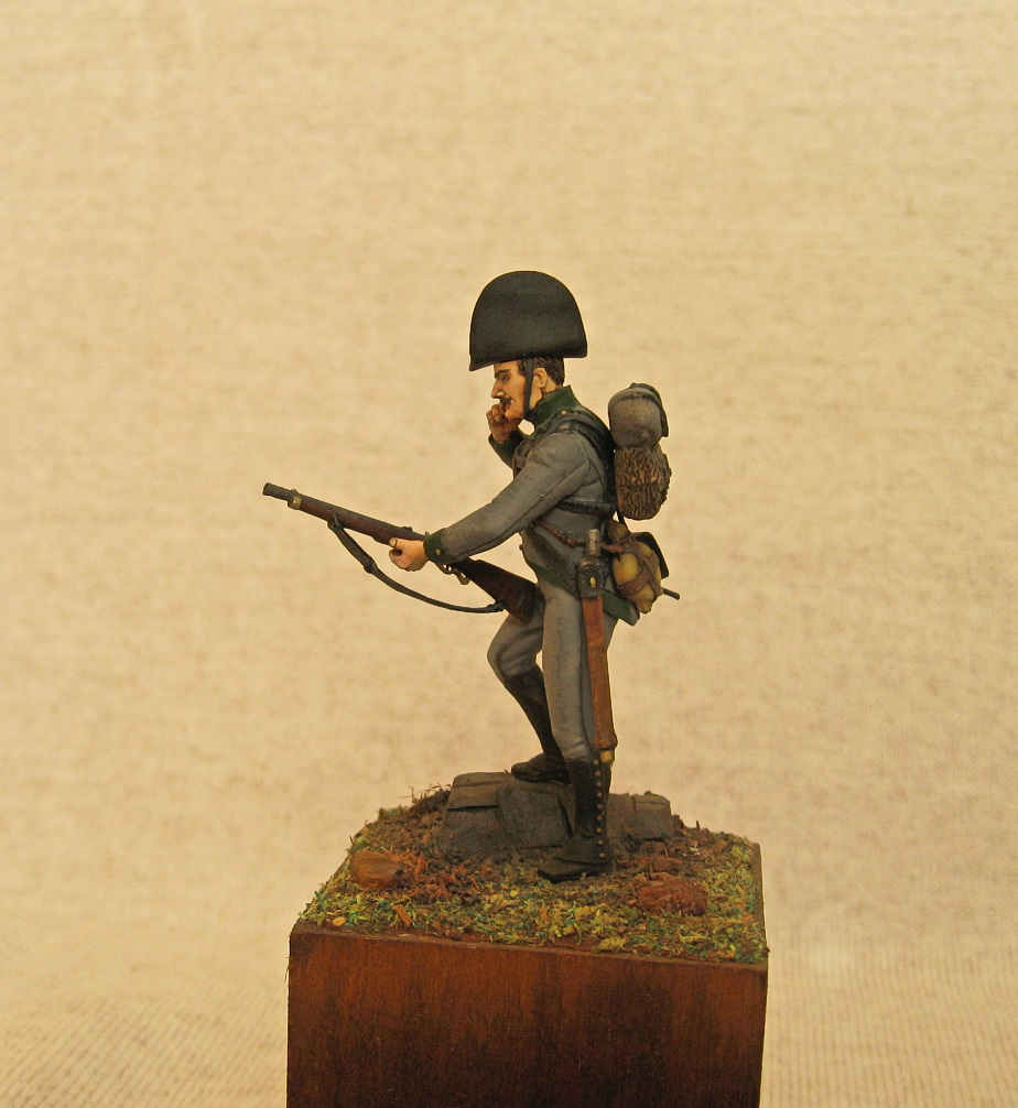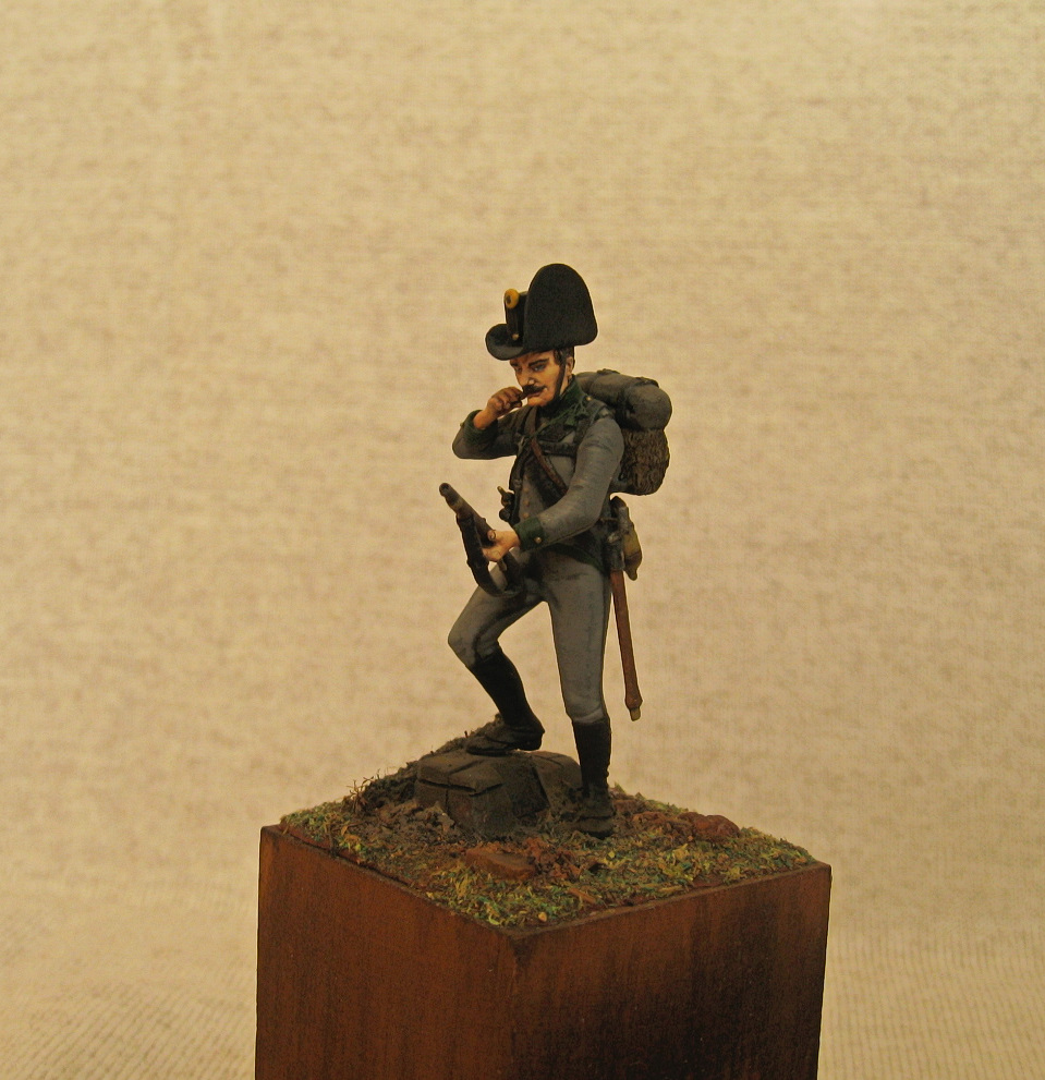 Здравствуйте. Вот такой егерь стрелковых батальонов Австрийской империи. Все батальоны имели одинаковую униформу, различаясь лишь номером на пуговицах. Сама фигура - великолепное качество, смола, 54 мм. Акрил, эмаль, чуть масла. Надеюсь, эта замечательная контора, дойдет, когда-нибудь, и до русской армии)))