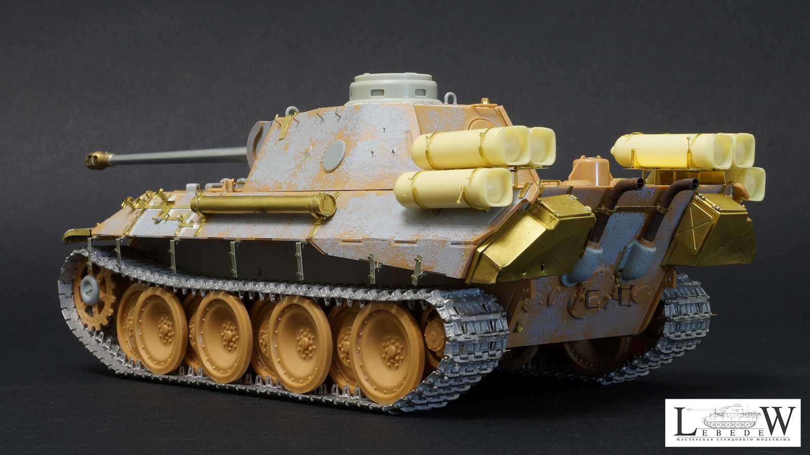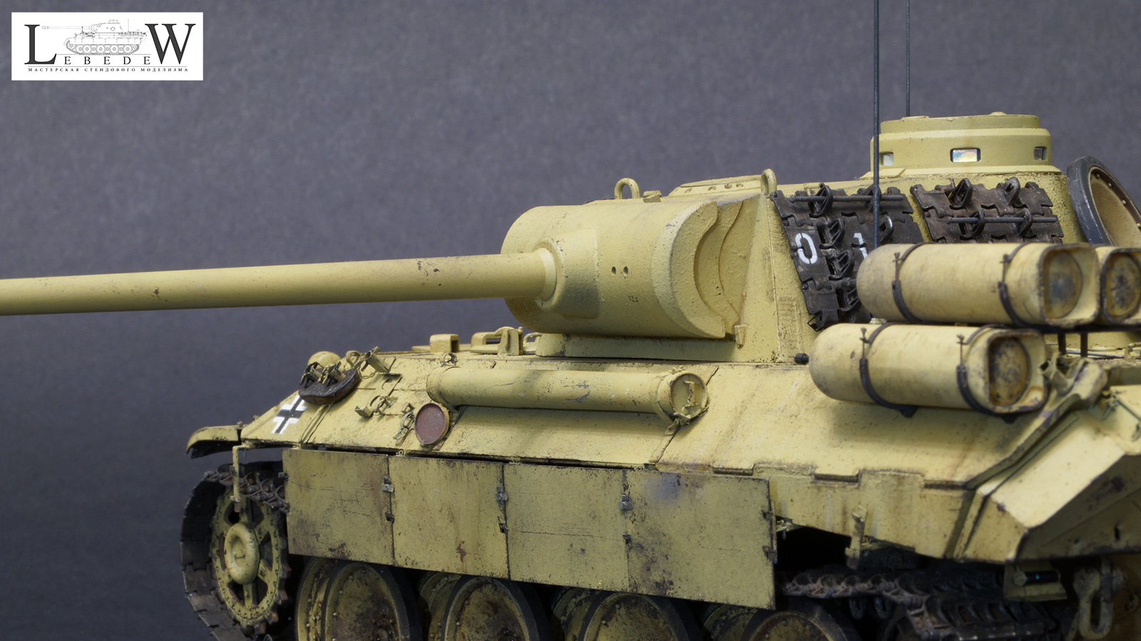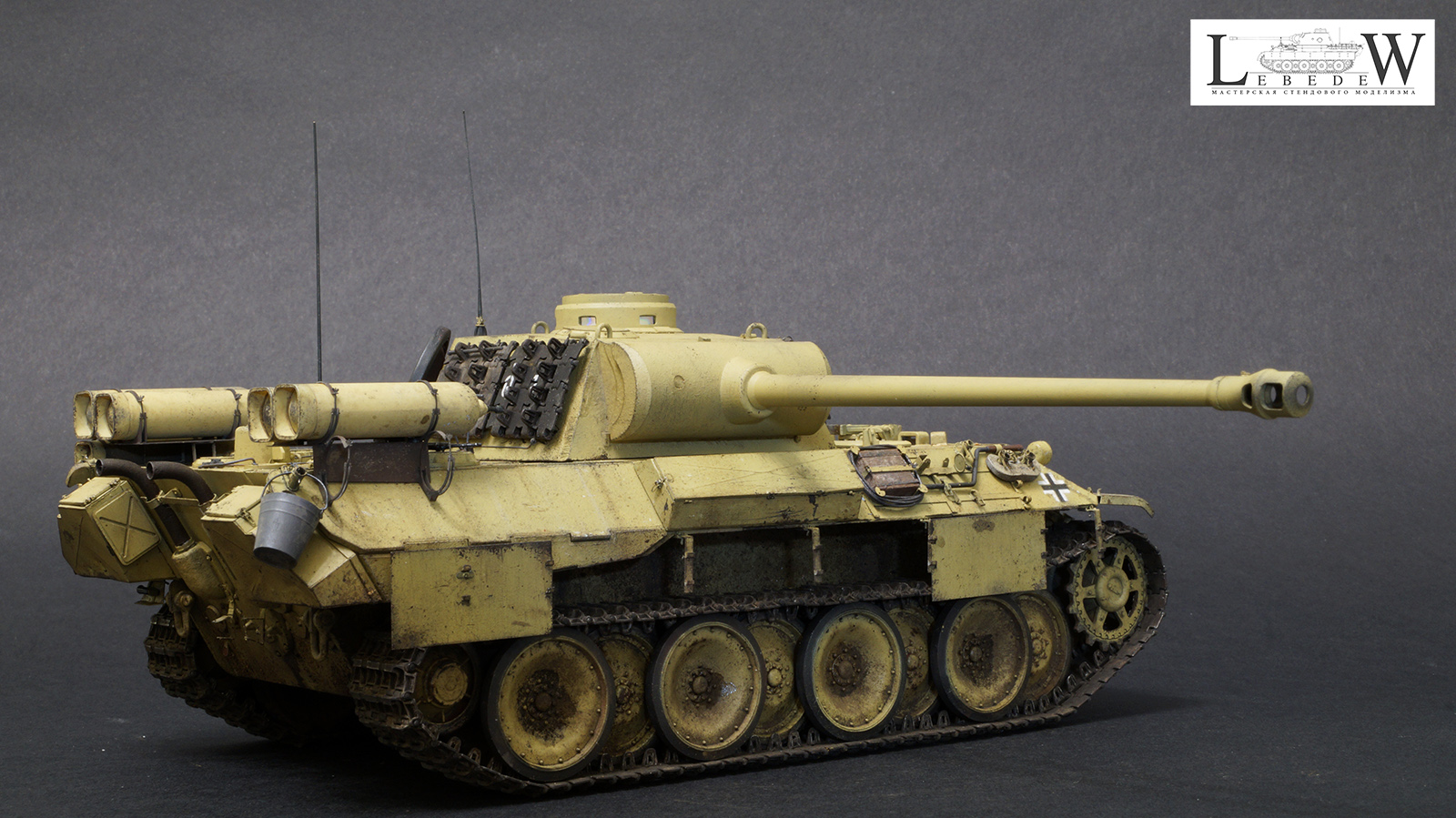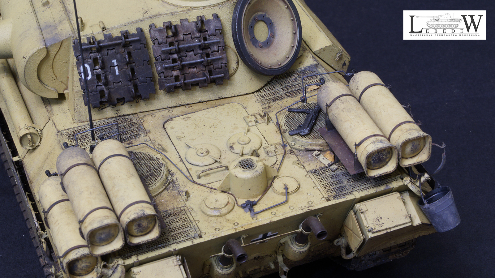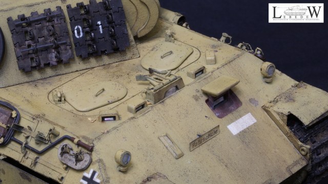 При создании этой работы решил впервые поддержать отечественного производителя. Набор от Звезды не плох, но естественно его пришлось модернизировать, так как проработка деталей оставляет желать лучшего. Бала естественно заменена ком башня, убраны лишние болты с опорных катков, заменена ручка на корме башни и броня вентилятора, заменена бронезащита стрелка на лицевой броне, бортовые крепления шанцевого инструмента поставлены на нужные места и по мелочи. В идеале нужно было заменить башню целиком, так как вопрос и по маске орудия есть и по задней плите, но решил оставить так.