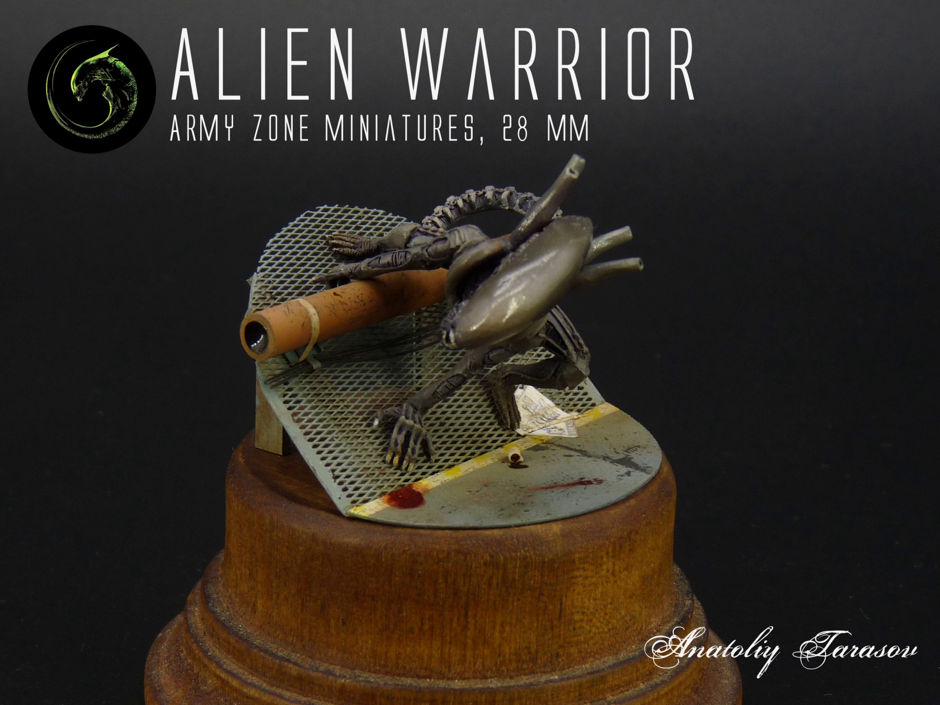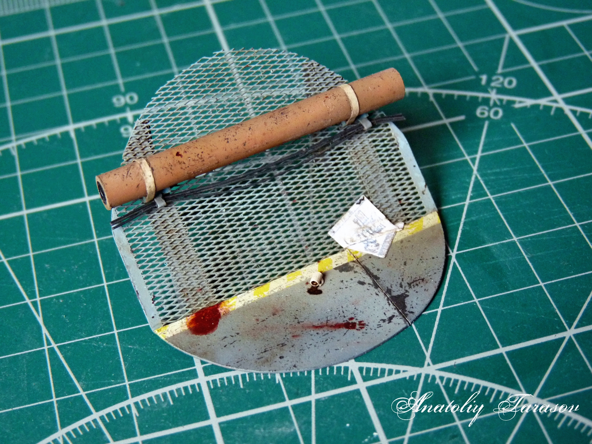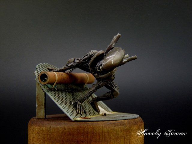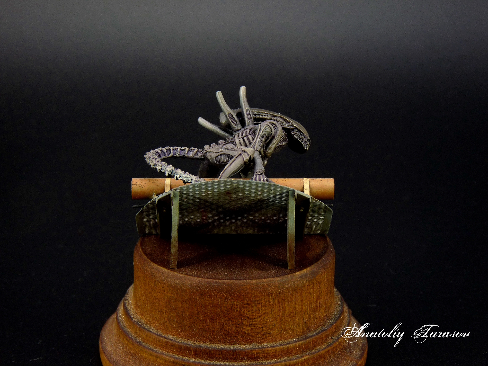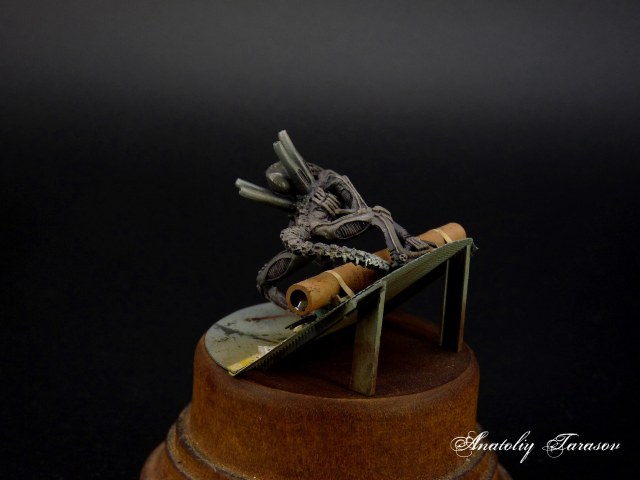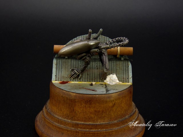Основа подставки из пластика, решётка - фототравление, профили Evergreen, пластиковый прут TAMIYA, проволока. Чашка сделана из высверленного с одной стороны пластикового прута Evergreen диаметром 1,2 мм. На полу чертёж колонии "Надежда Хадли" с эмблемой компании Вейланд. Лужица крови и брызги - масляные краски.