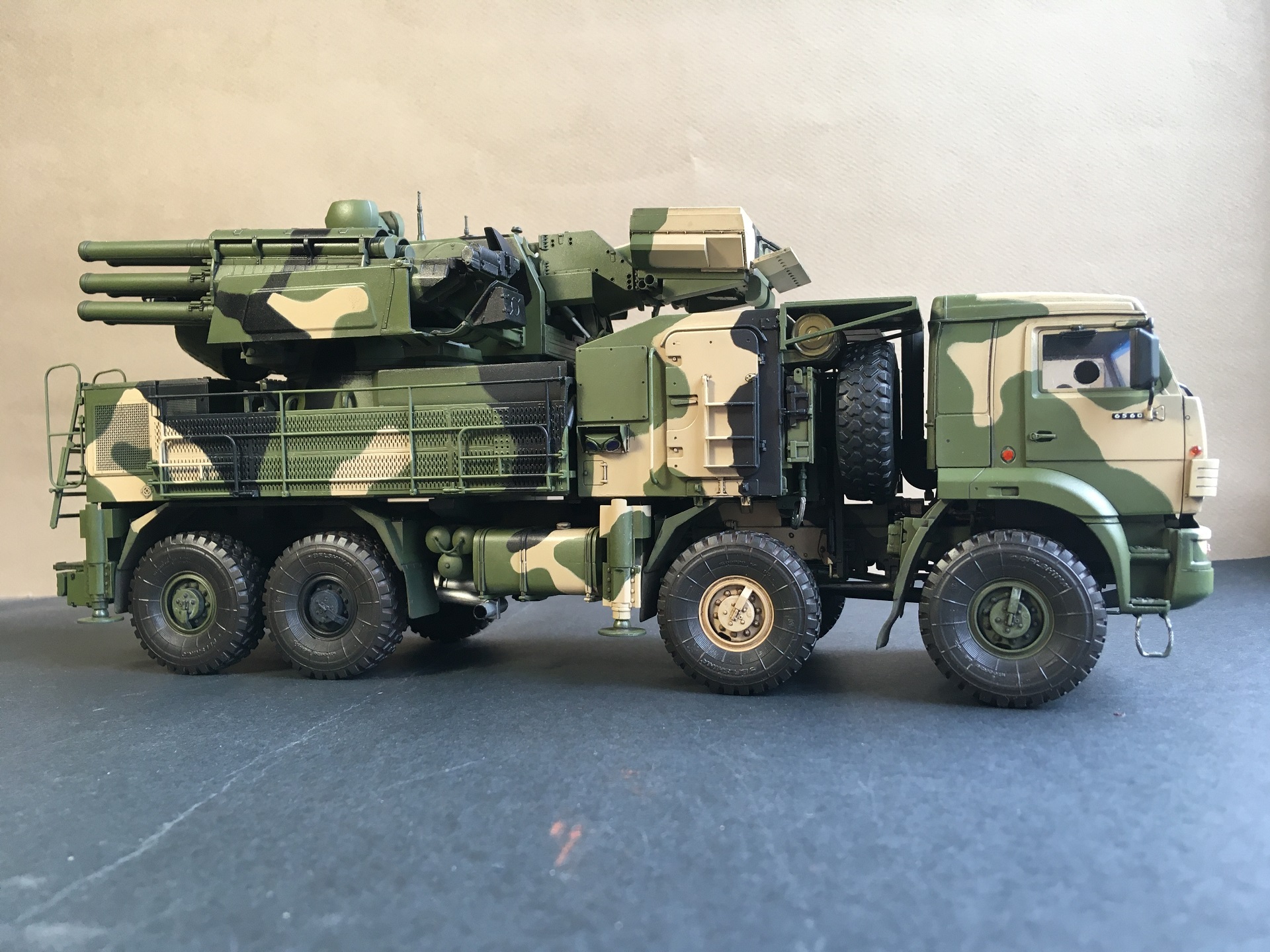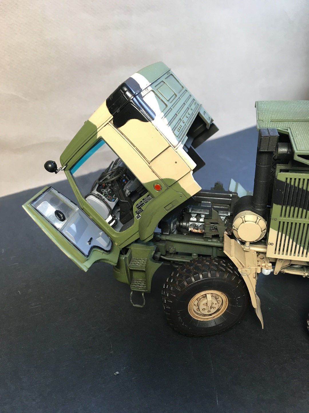 Классный Панцирь вышел, вопрос про петли на дверях тоже интересен, собираю такого от Трубача и не ясно с воздухозаборником он должен на воздушном фильтре стоять как у вас или же крепиться к кабине как на всех Камазах.
