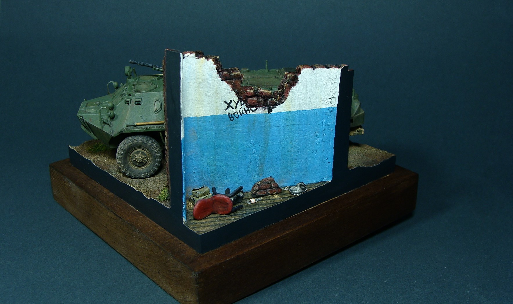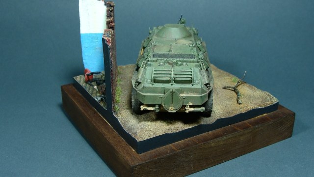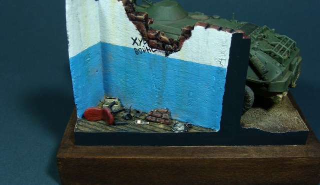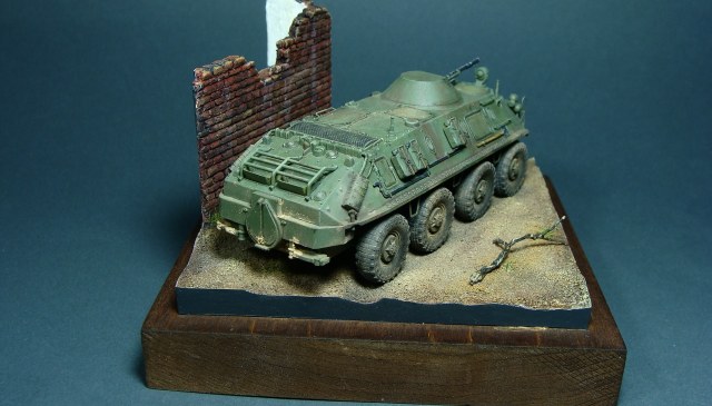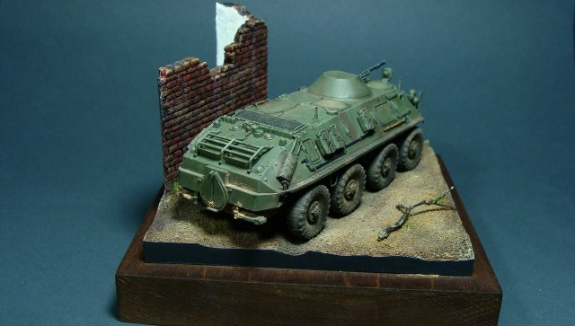 Опять же, в работе очень много косяков, я о них знаю (не выровненные плоскости "среза", протек пва на дерево, БТР не встал в свои точки в коленях, поэтому средние колёса зависли в воздухе,кладка сверху не правильная, кирпичи квадратные, одни только закрашенные в базу задние фары чего стоят). Но в целом результатом доволен.
