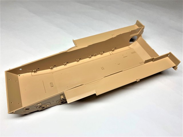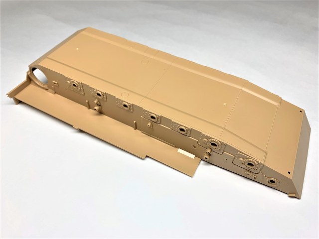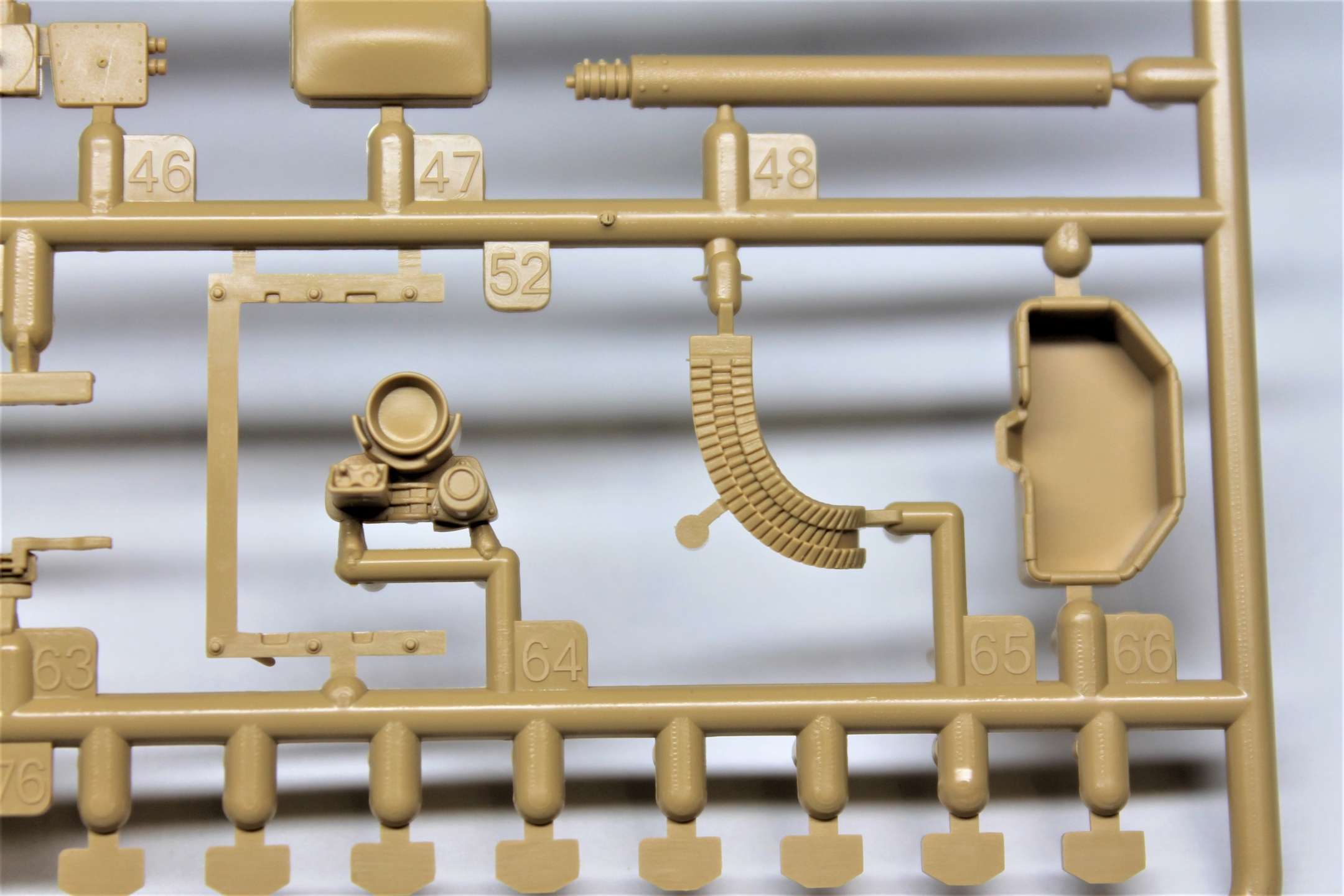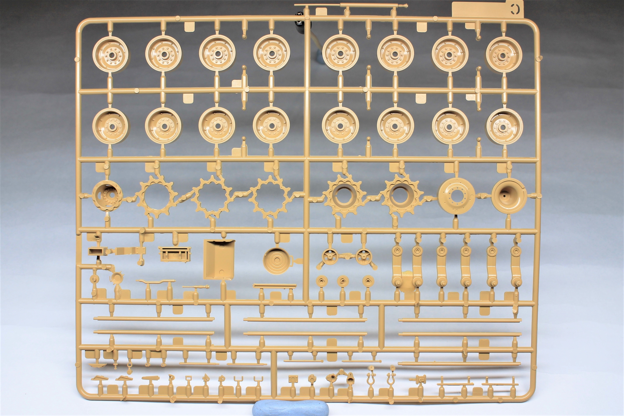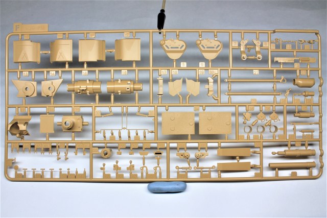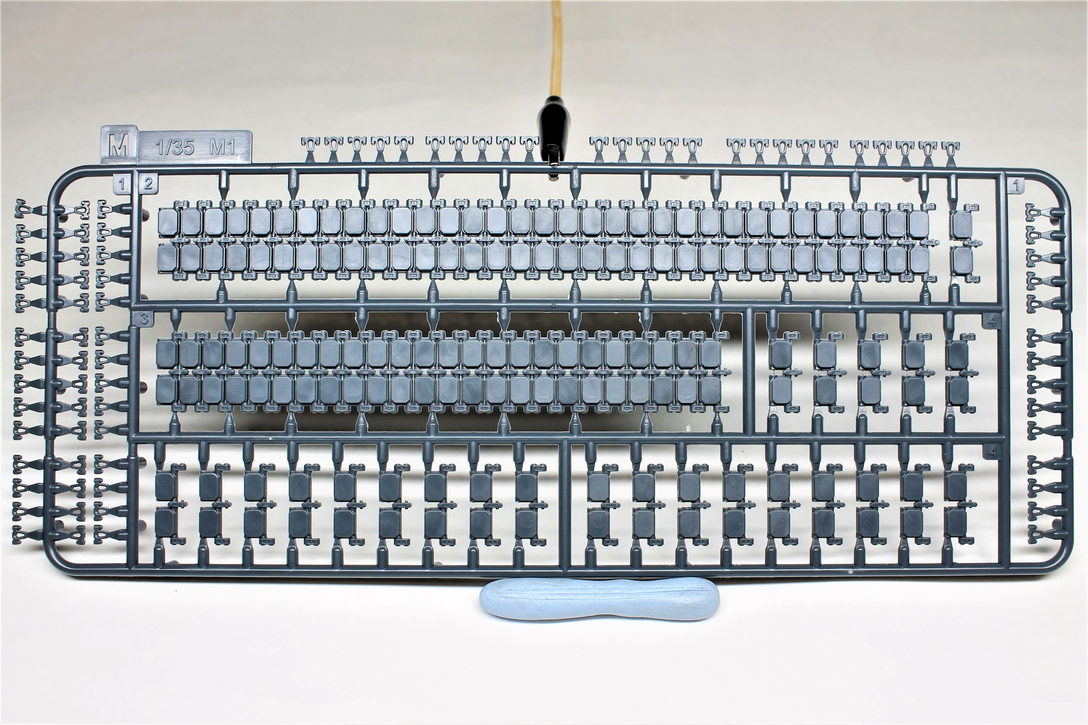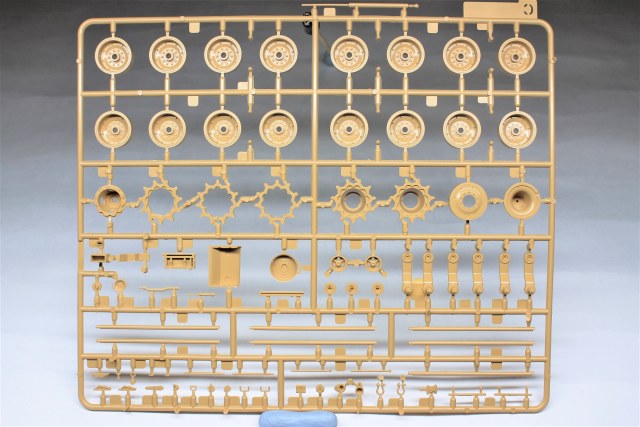 Высокое качество литья, местами присутствует облой, недолив обнаружил только на двух деталях ходовой (исправить нетрудно). Есть возможность собрать со статичной или с рабочей подвеской на выбор. Чтобы сделать подвеску рабочей, надо срезать пластик в некоторых местах, как указано в инструкции. В комплектации идут полу-наборные траки, для рабочей подвески подвижные траки придётся докупить отдельно (благо цена набора не высокая, я брал по предзаказу в "Моделизмусе" комплектом с рабочими траками). Ствол 120-мм орудия отлит целиковыми деталями, разбитыми поперёк, нет необходимости совмещать половинки и мучиться с зачисткой сложной формы.