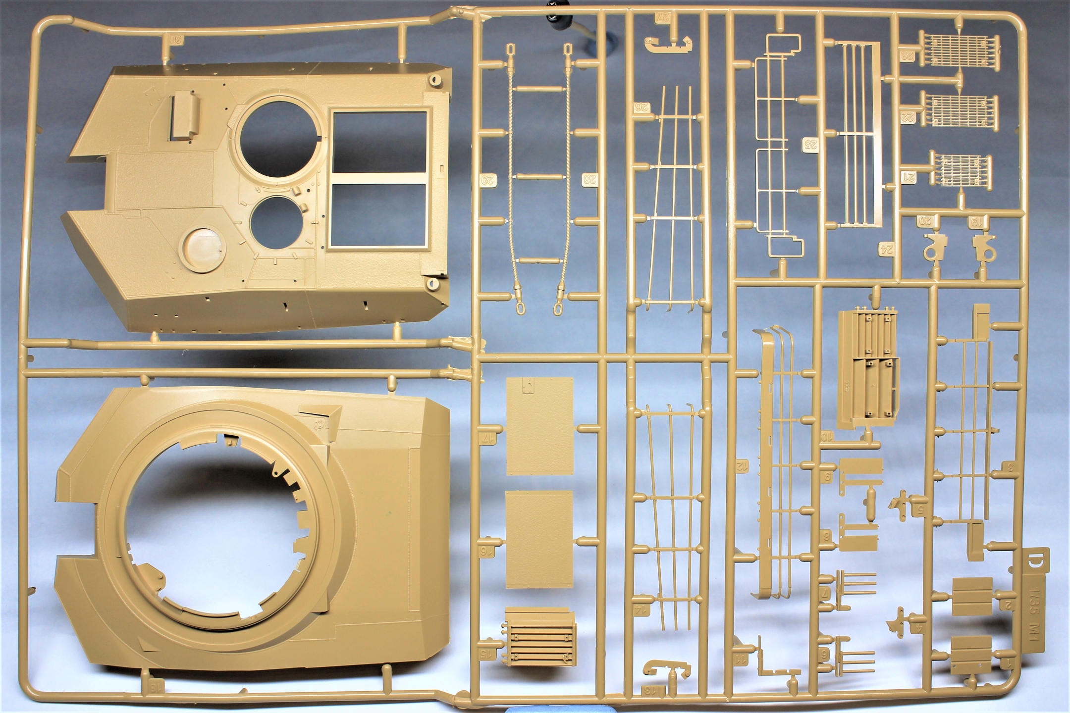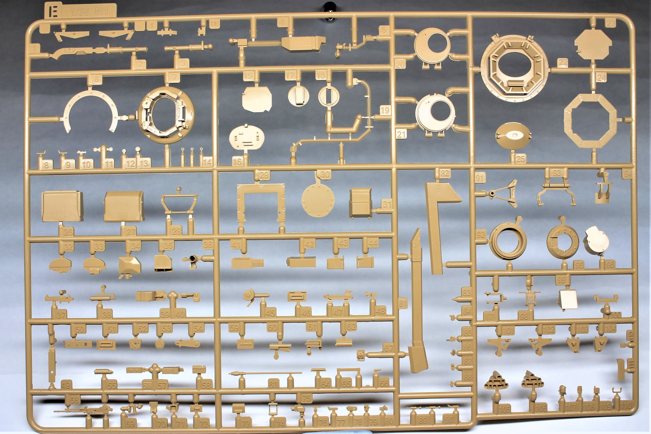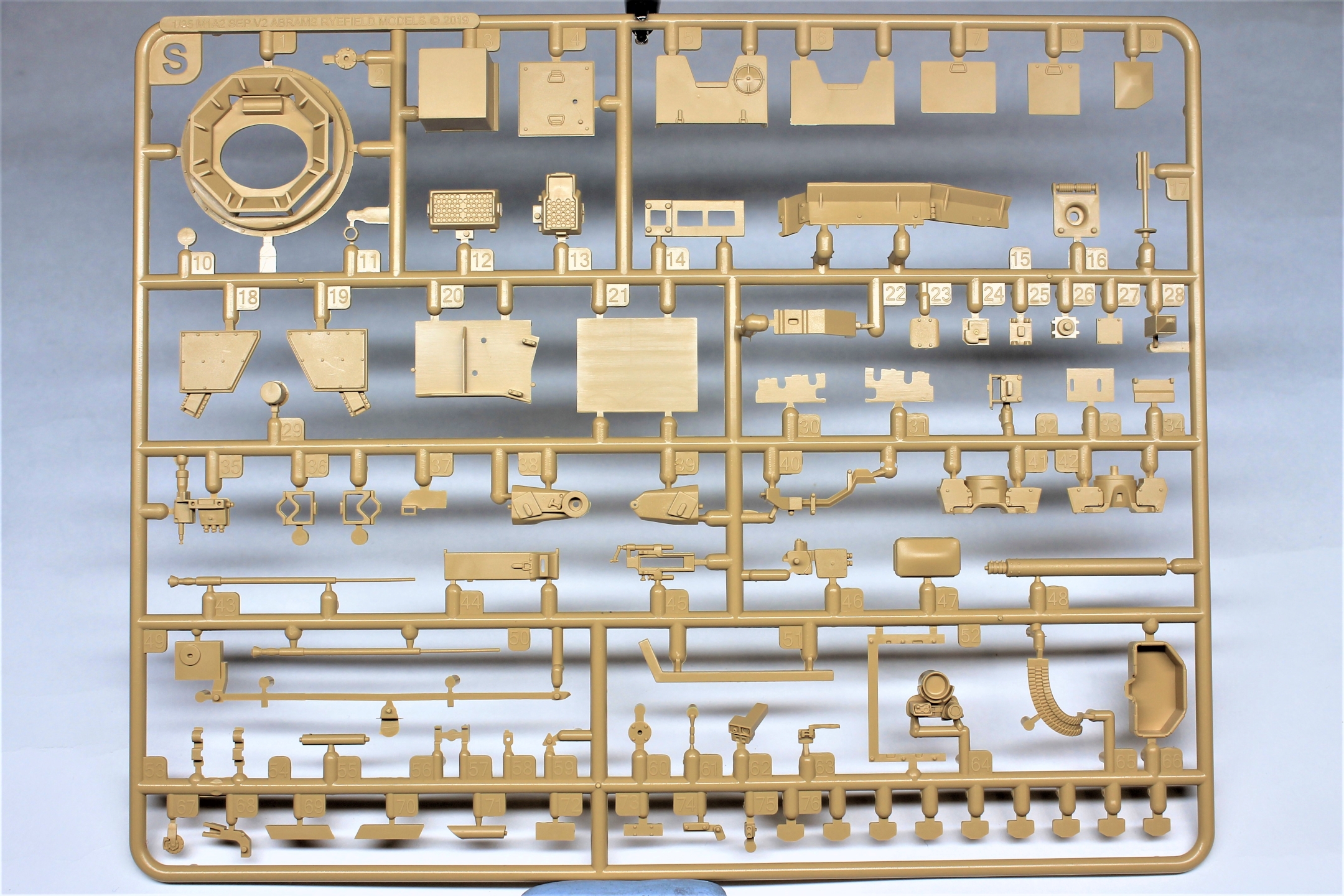 Производитель предлагает нам к сборке модель очередной модификации известного танка M1A2 SEP V2 ABRAMS, при этом также доступна сборка одной из трёх комплектаций, немного отличающихся друг от друга. В наборе присутствуют литники с общими деталями от одного из старых наборов с бронёй TUSK и новые литники для конкретной модификации.