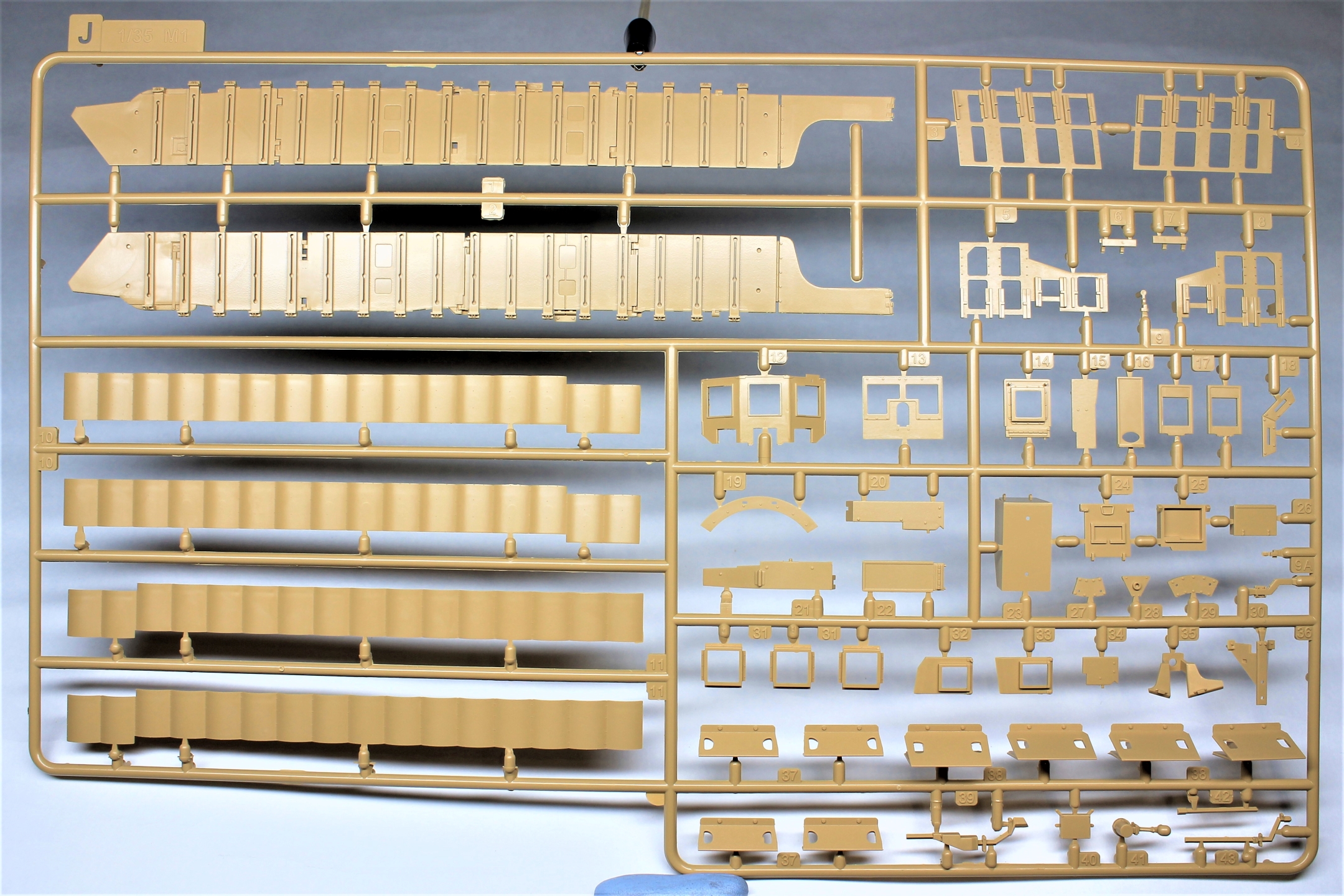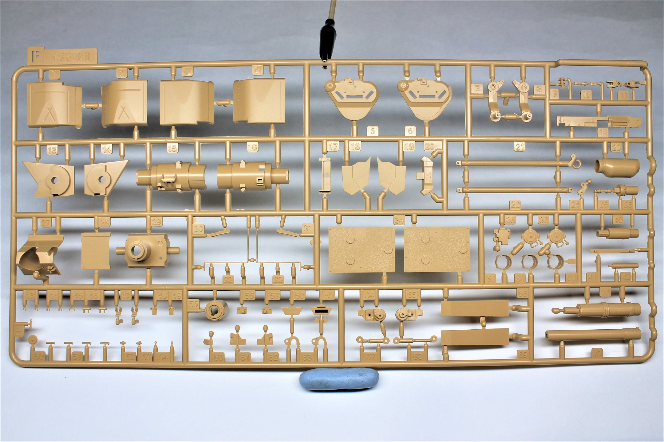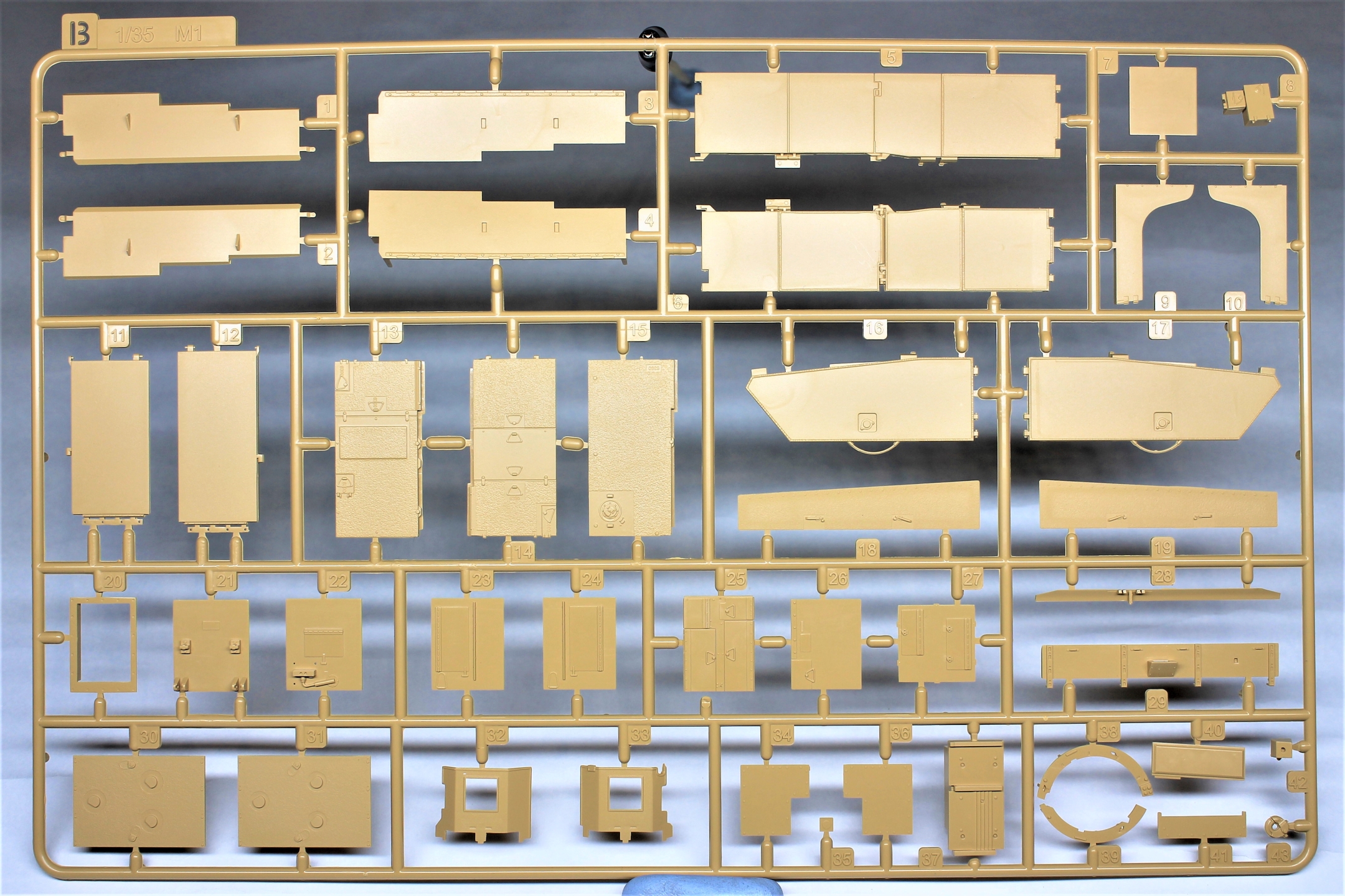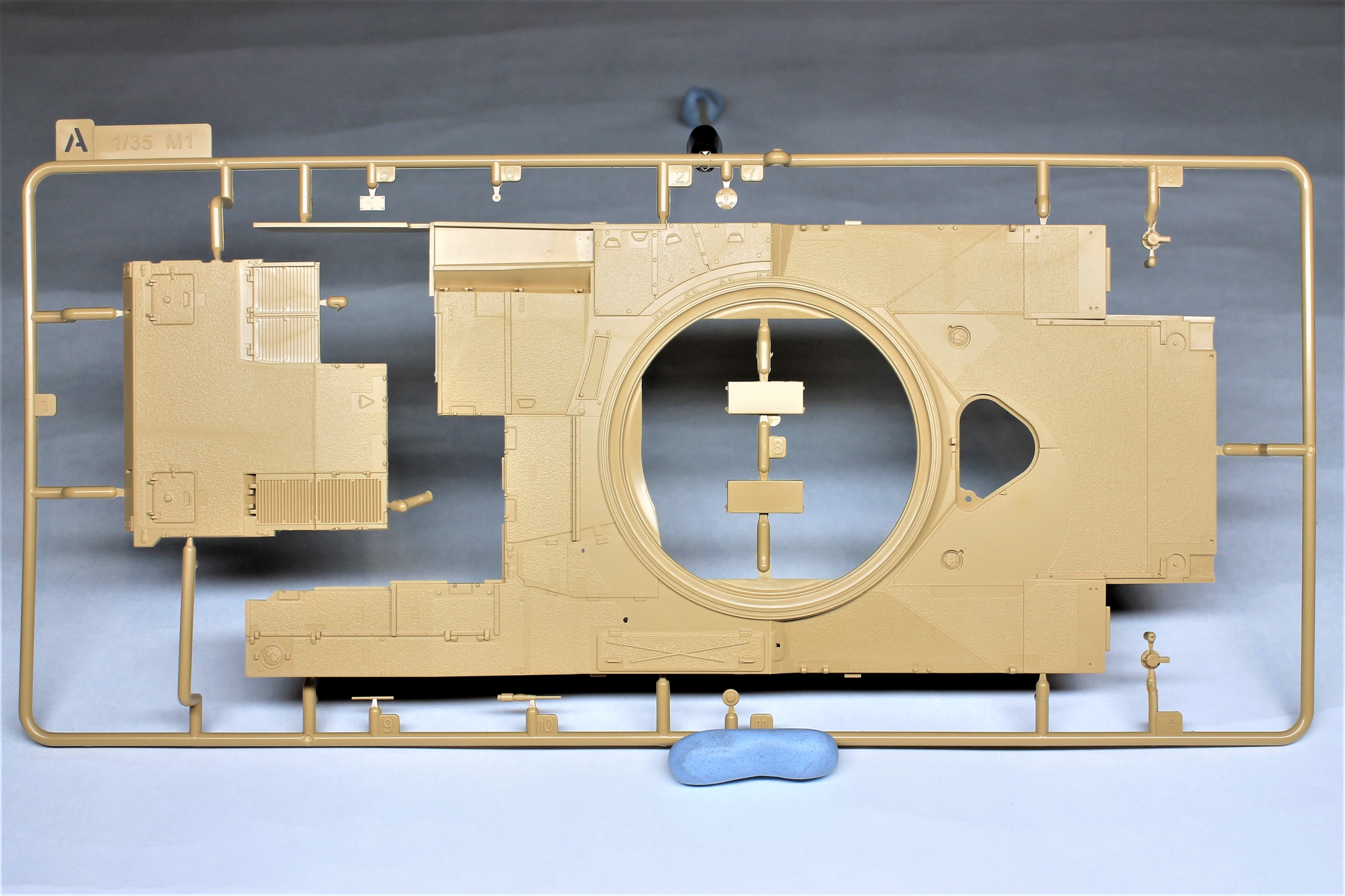 Производитель предлагает нам к сборке модель очередной модификации известного танка M1A2 SEP V2 ABRAMS, при этом также доступна сборка одной из трёх комплектаций, немного отличающихся друг от друга. В наборе присутствуют литники с общими деталями от одного из старых наборов с бронёй TUSK и новые литники для конкретной модификации.