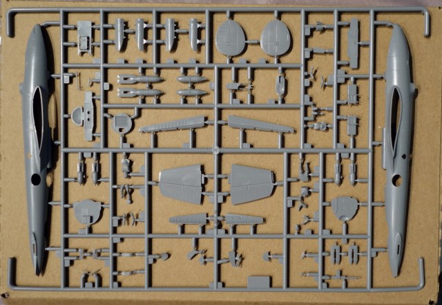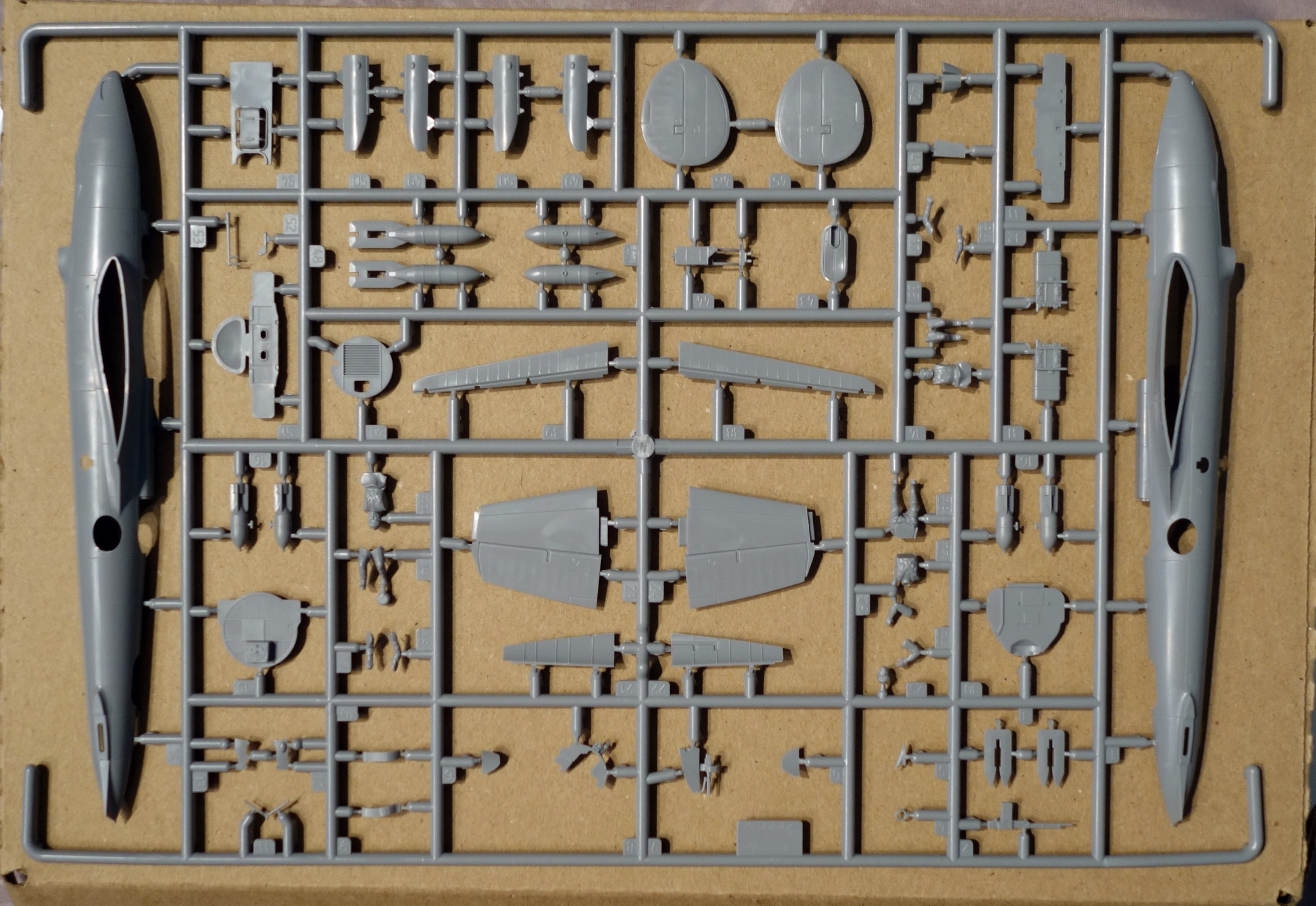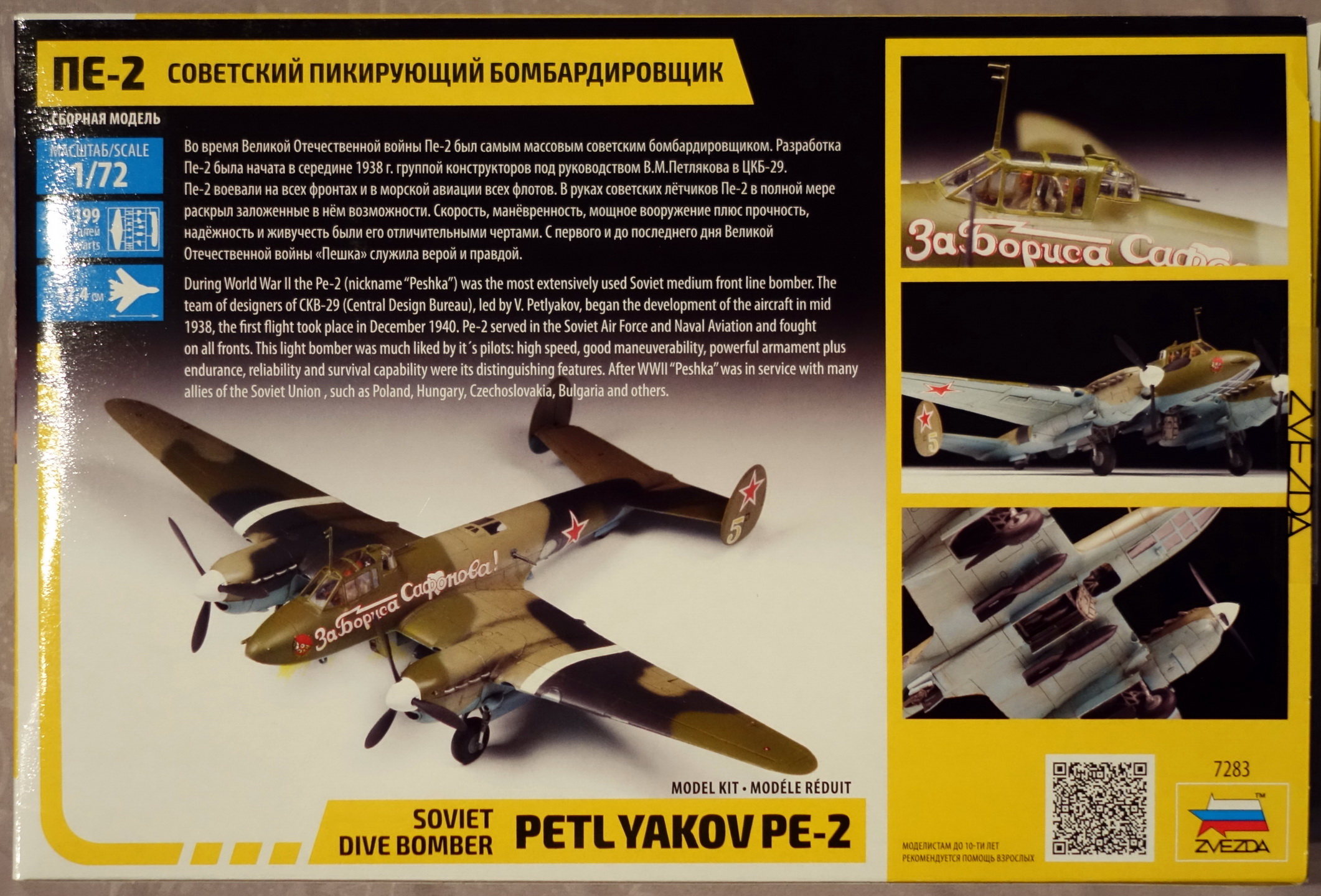 В наборе литники из серого пластика, один прозрачный, инструкция, декаль и цветные схемы на 5 вариантов окраски. Это мой третий набор ПЕ-2 в 72-м масштабе, есть ещё «Моделист» и «UM». «Моделист» ещё не собирал, но выглядит он слишком детским (мало деталей). «UM» начал собирать, но очень много негатива, недолив деталей, шпаклевать уже устал. В «Звезде» не предусмотрено сделать дополнительные бомболюки открытыми, впрочем, как и в остальных наборах, зато элероны даны отдельными деталями. Для меня большой плюс этому набору за наличие пилотов.
