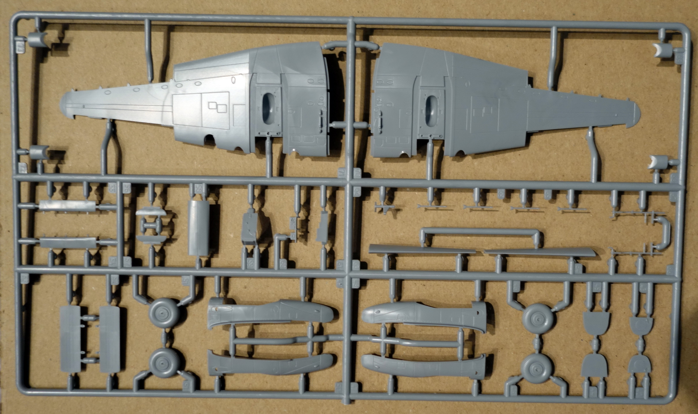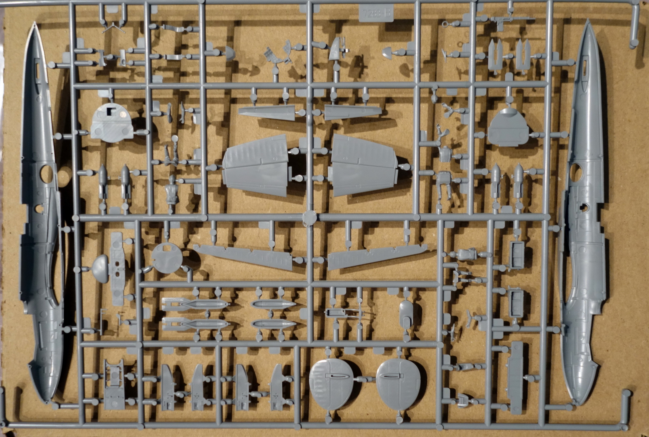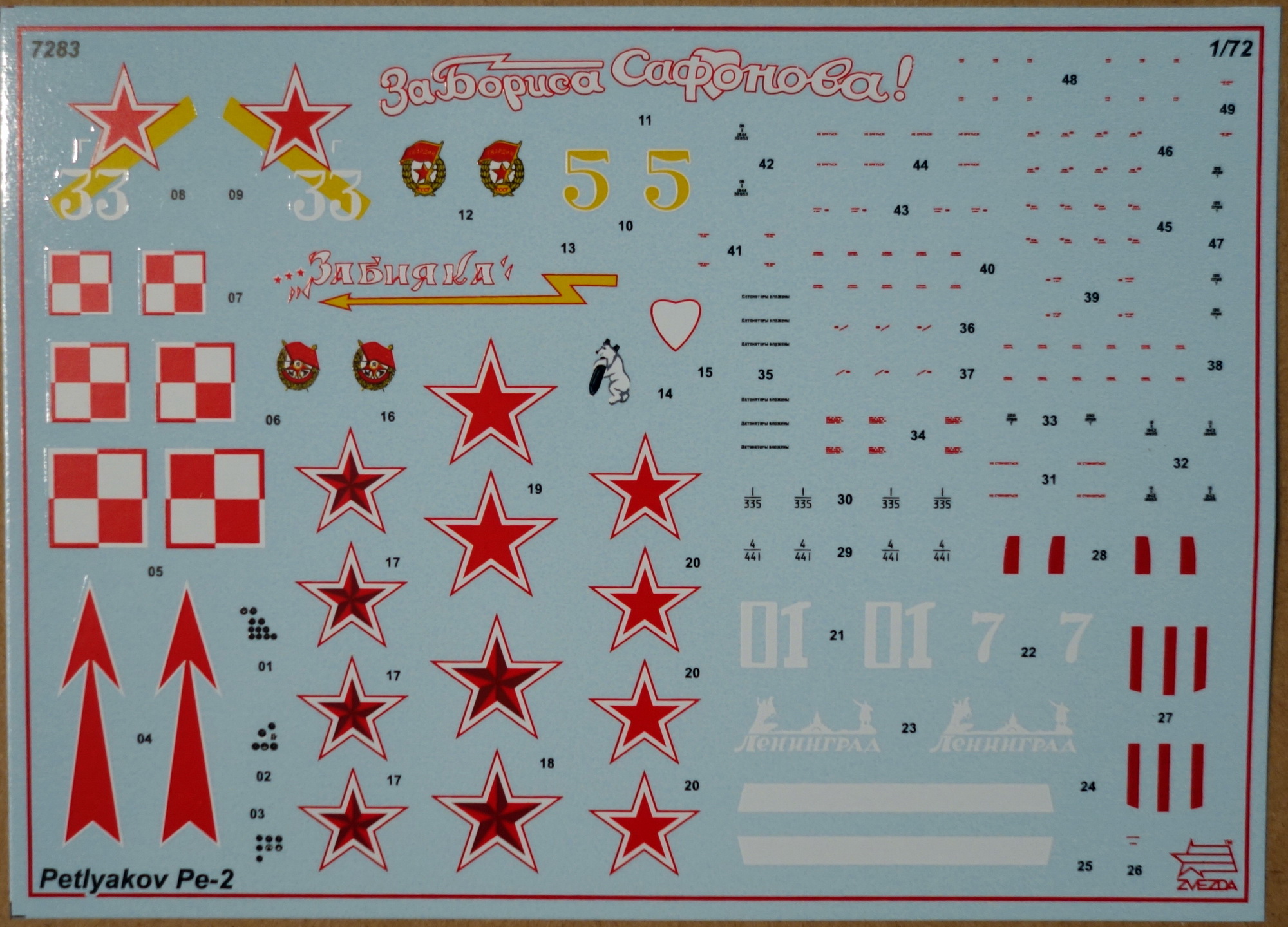 В наборе литники из серого пластика, один прозрачный, инструкция, декаль и цветные схемы на 5 вариантов окраски. Это мой третий набор ПЕ-2 в 72-м масштабе, есть ещё «Моделист» и «UM». «Моделист» ещё не собирал, но выглядит он слишком детским (мало деталей). «UM» начал собирать, но очень много негатива, недолив деталей, шпаклевать уже устал. В «Звезде» не предусмотрено сделать дополнительные бомболюки открытыми, впрочем, как и в остальных наборах, зато элероны даны отдельными деталями. Для меня большой плюс этому набору за наличие пилотов.