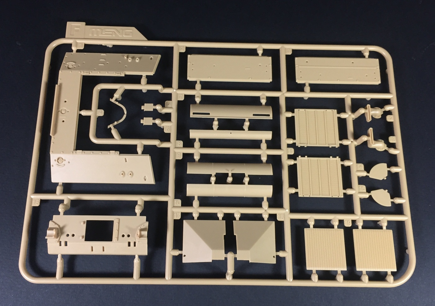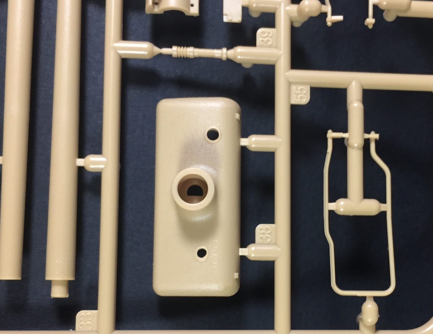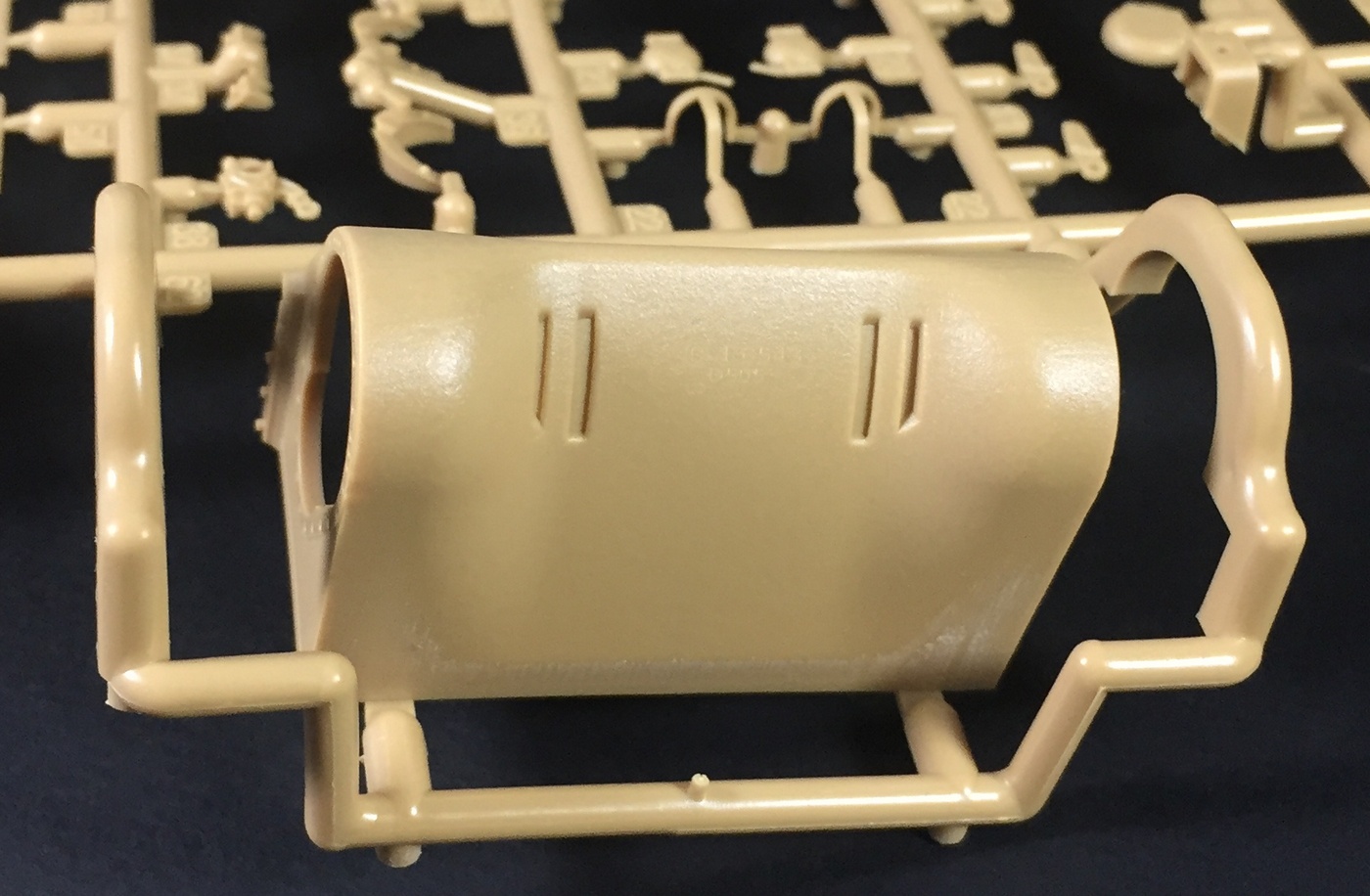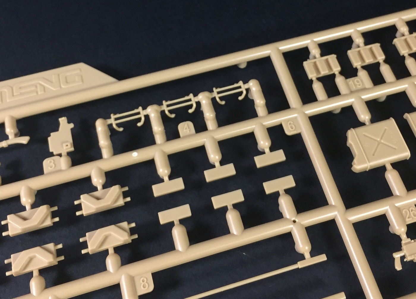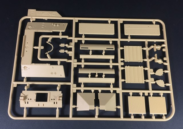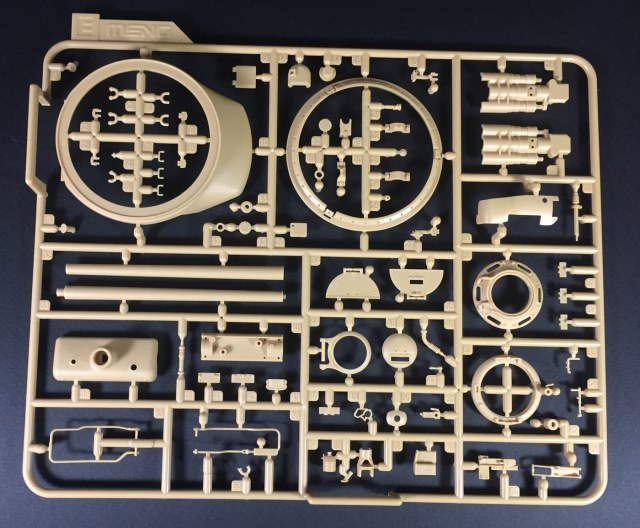 Что касается качества литья, оно на высшем уровне, как обычно у Менга, мелочевка отлита очень тщательно, смещения пресс-форм и облоя нет практически. Конечно, детали все равно приходится зачищать и обрабатывать, но по минимуму. Стыкуемость пока не могу оценить. Отлично дана имитация фактуры литой брони, не слишком ярко выраженная, но вполне заметная. Также пролиты все литьевые номера, что является огромным прогрессом в шерманостроении, и это явное положительное отличие модели МЕНГ! Точёный ствол орудия обещают вкладывать только в первой партии.