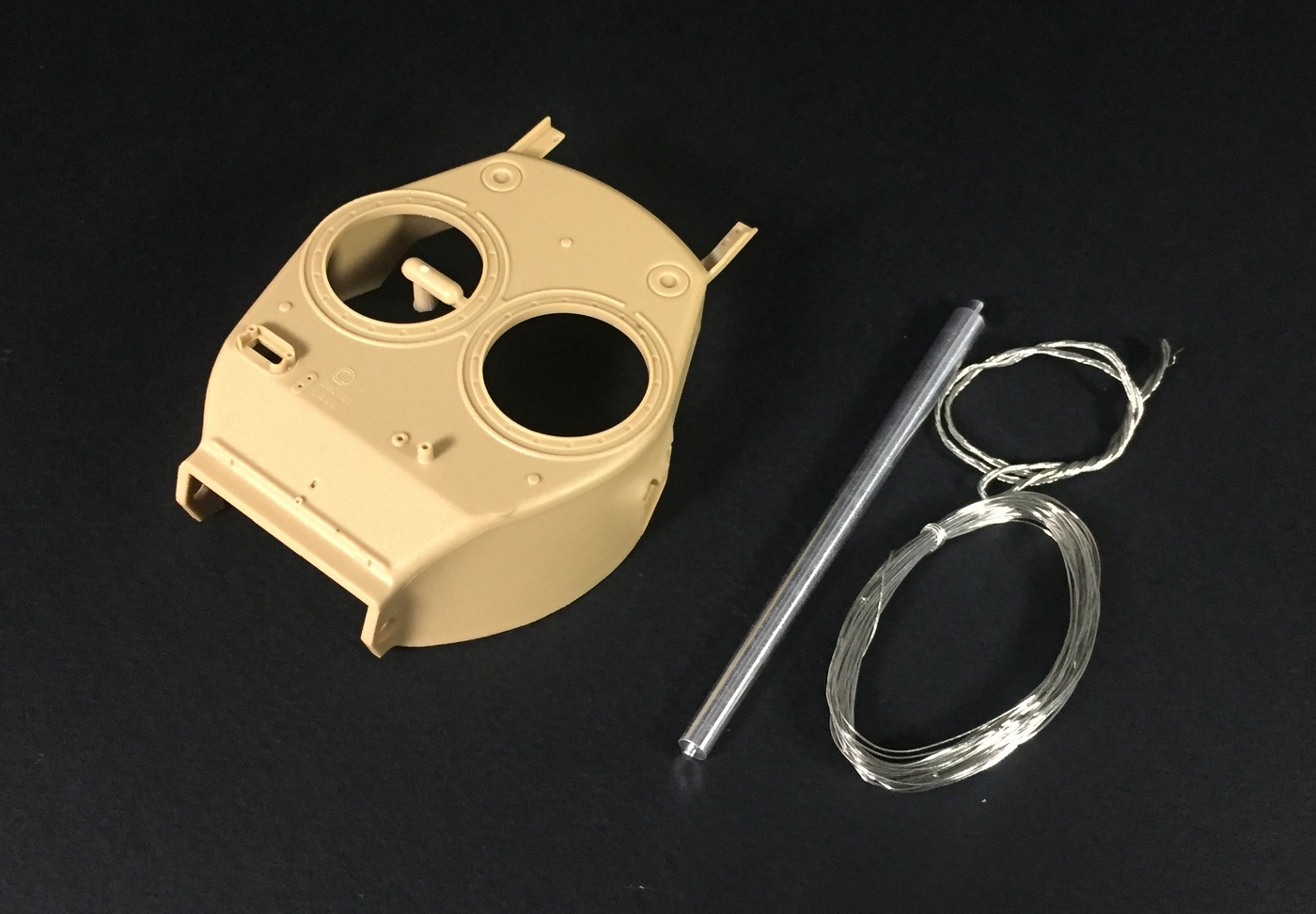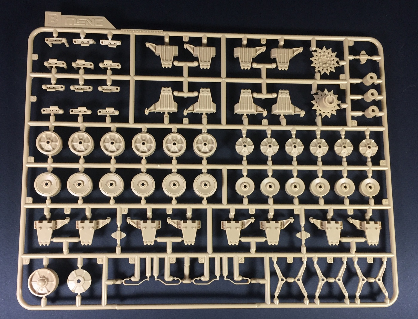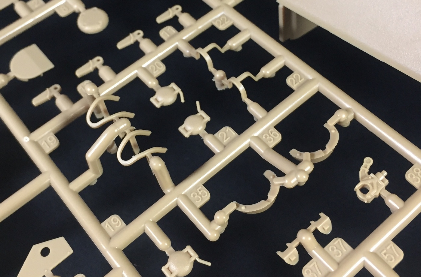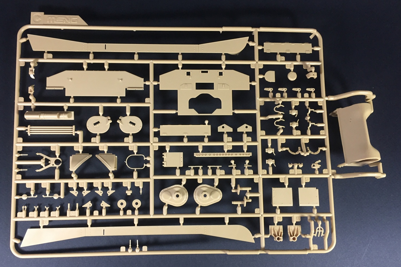 Что касается качества литья, оно на высшем уровне, как обычно у Менга, мелочевка отлита очень тщательно, смещения пресс-форм и облоя нет практически. Конечно, детали все равно приходится зачищать и обрабатывать, но по минимуму. Стыкуемость пока не могу оценить. Отлично дана имитация фактуры литой брони, не слишком ярко выраженная, но вполне заметная. Также пролиты все литьевые номера, что является огромным прогрессом в шерманостроении, и это явное положительное отличие модели МЕНГ! Точёный ствол орудия обещают вкладывать только в первой партии.