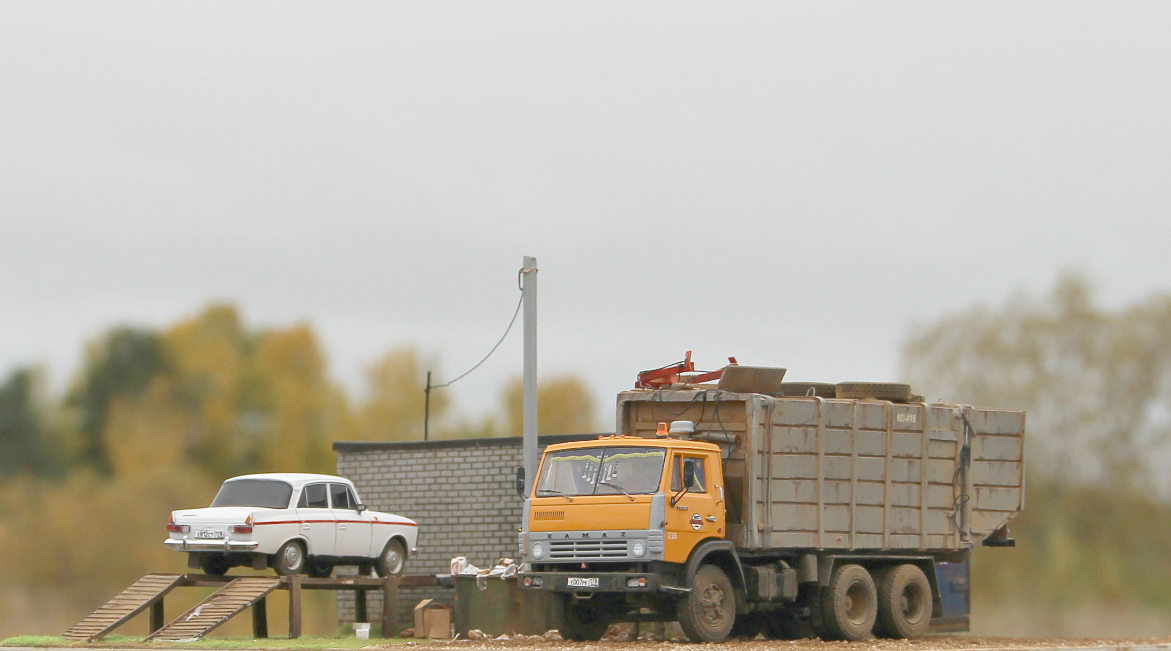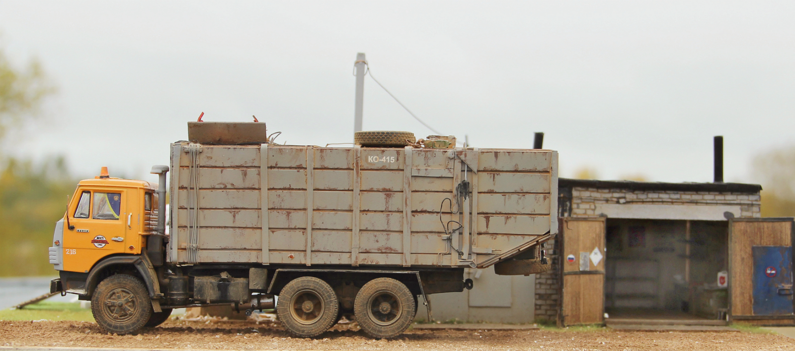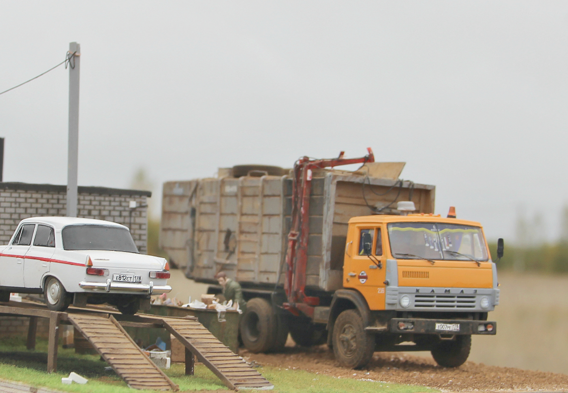 Представляю Вашему вниманию очередной проект диорамы"Вывоз мусора из гаражного кооператива ГСК-2 "МАЯК"Масштаб 1.43 Модель мусоровоза на базе Камаз 53213 (КО-415).Основа была взята от модели ПАО Камаз.Далее полностью разобрана,снята краска,зачищена зашкурена.Кабина покрашена из балона.добавлено фототравление;ручки,поручни,подножки,дворники,зеркала,шильдики,эмблемы,катафоты.оптика заменена на три А.Добавлена мелочевка.Надстройка бункера сделана из модельного пластика толщины 0.5-1.5мм. полностью с нуля.Добавлены штоки,цилиндры гидравлические шланги.Имитированы следы эксплуатации.Добавлена с правого боку эмблема "коммаш"Задняя оптика так же заменена.Добавлены 2 запаски сверху и одна снизу,заднего борта.Ящик,канистры,трос.Москвич 412 иэ журнальной серии Deagostini был перекрашен с синего цвета в белый.Москвич сделан по прототипу моего личного первого автомобиля