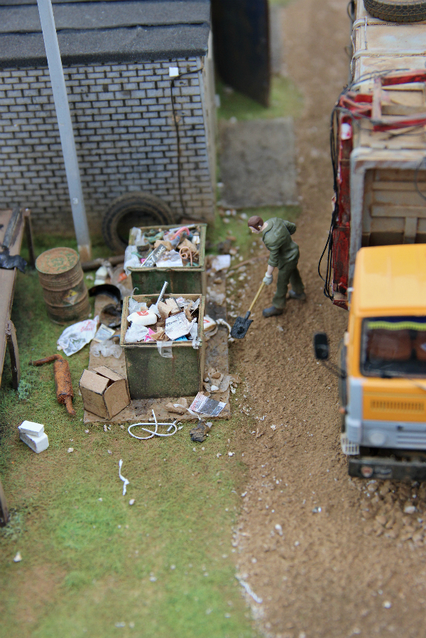 Как дровосек далекий от диорам и автомоделей наберусь наглости дать совет : для 100 % натуральности и реалистичности надо убрать фигурку человека . Если это сделать , то ни одна деталь не выдает в диораме модель . Неимоверно реалистично . Очень понравился рубероид на крыше . И антураж гаража .